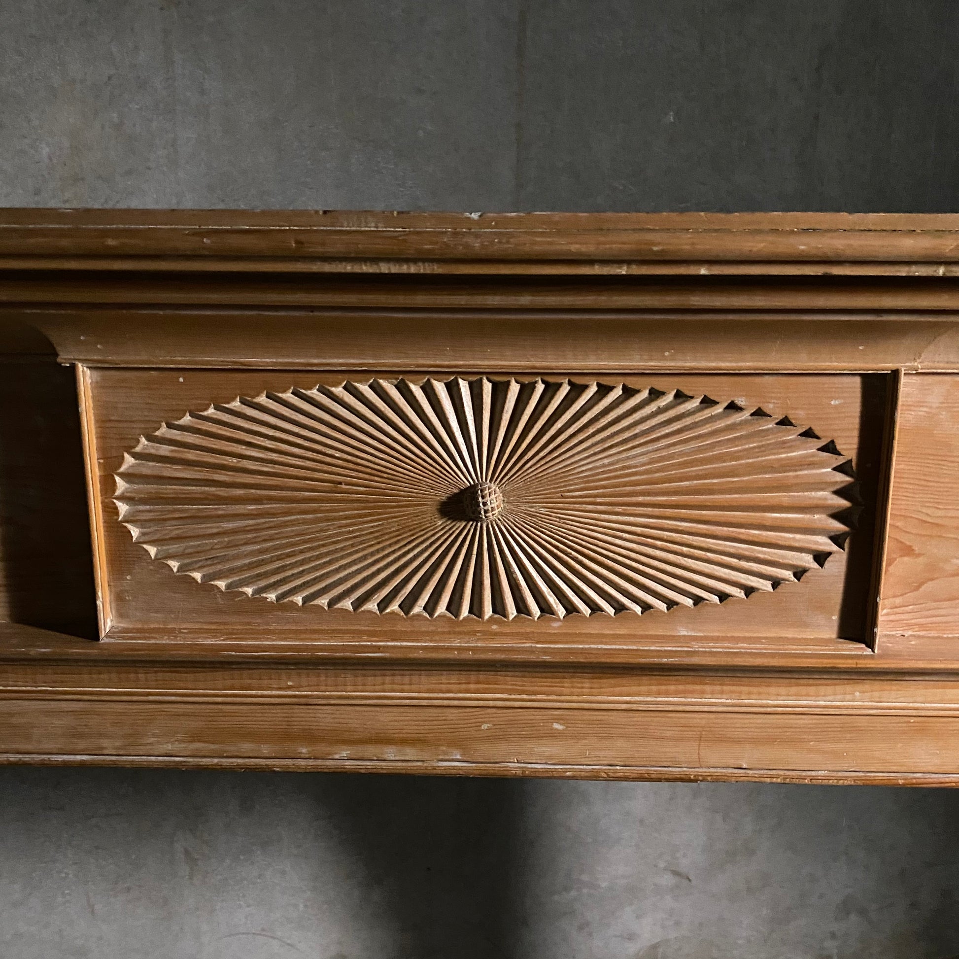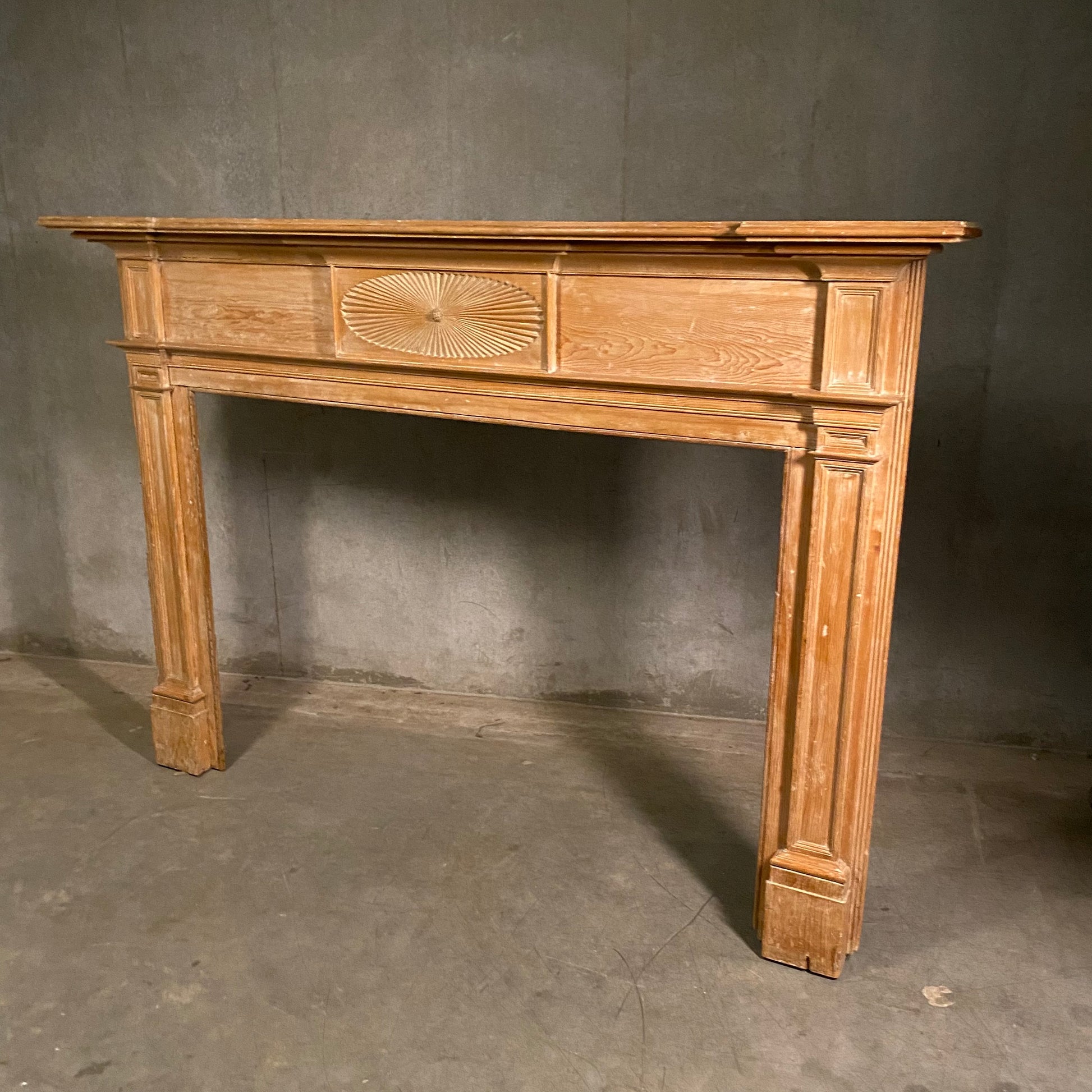 A fine example of early late 18th c early 19th c pine FEDERAL style mantle salvaged in the late 60’s from a home in NEW HAMPSHIRE . Old finish with strong patina a very balanced form with hand carved sunburst.