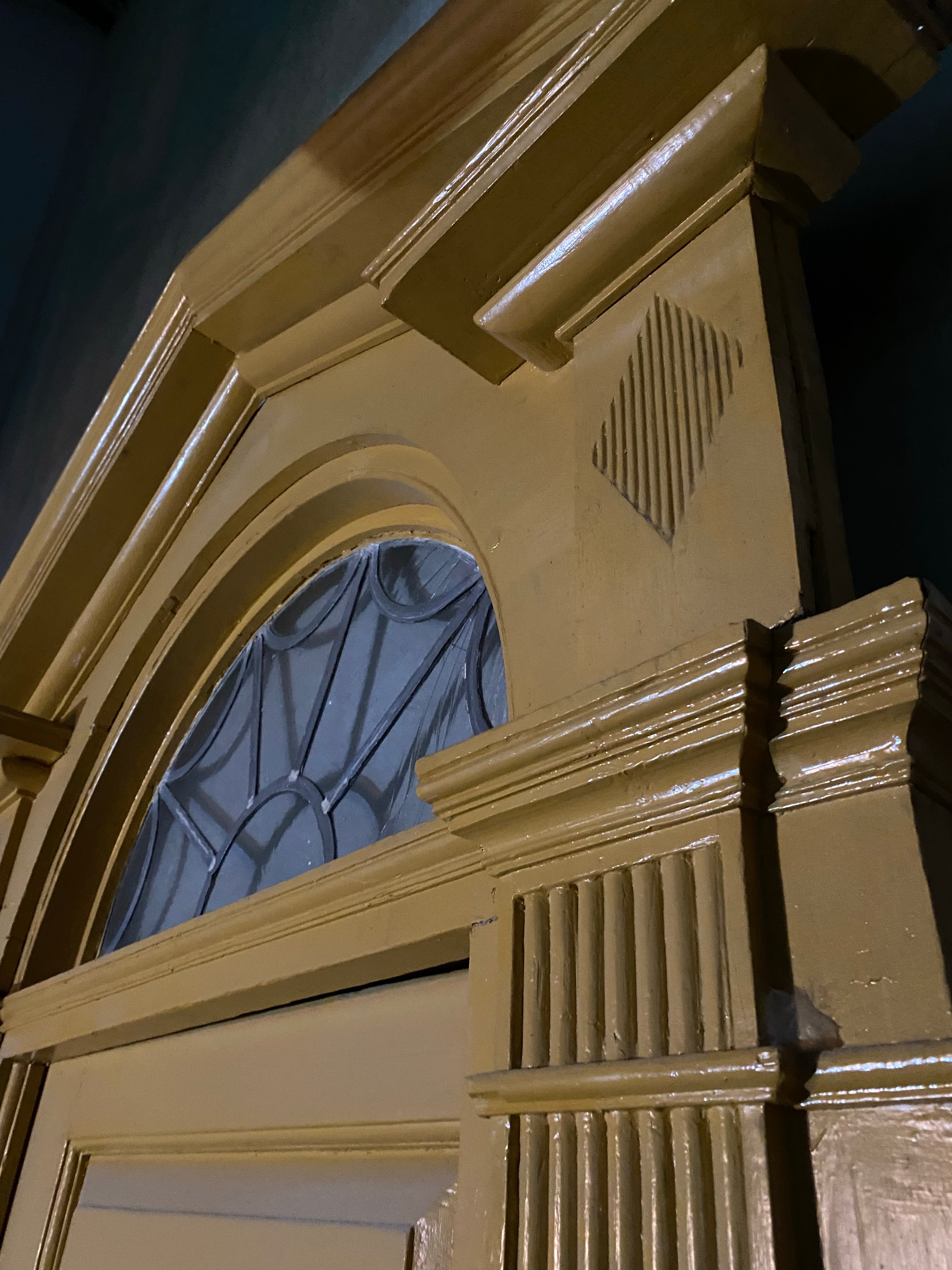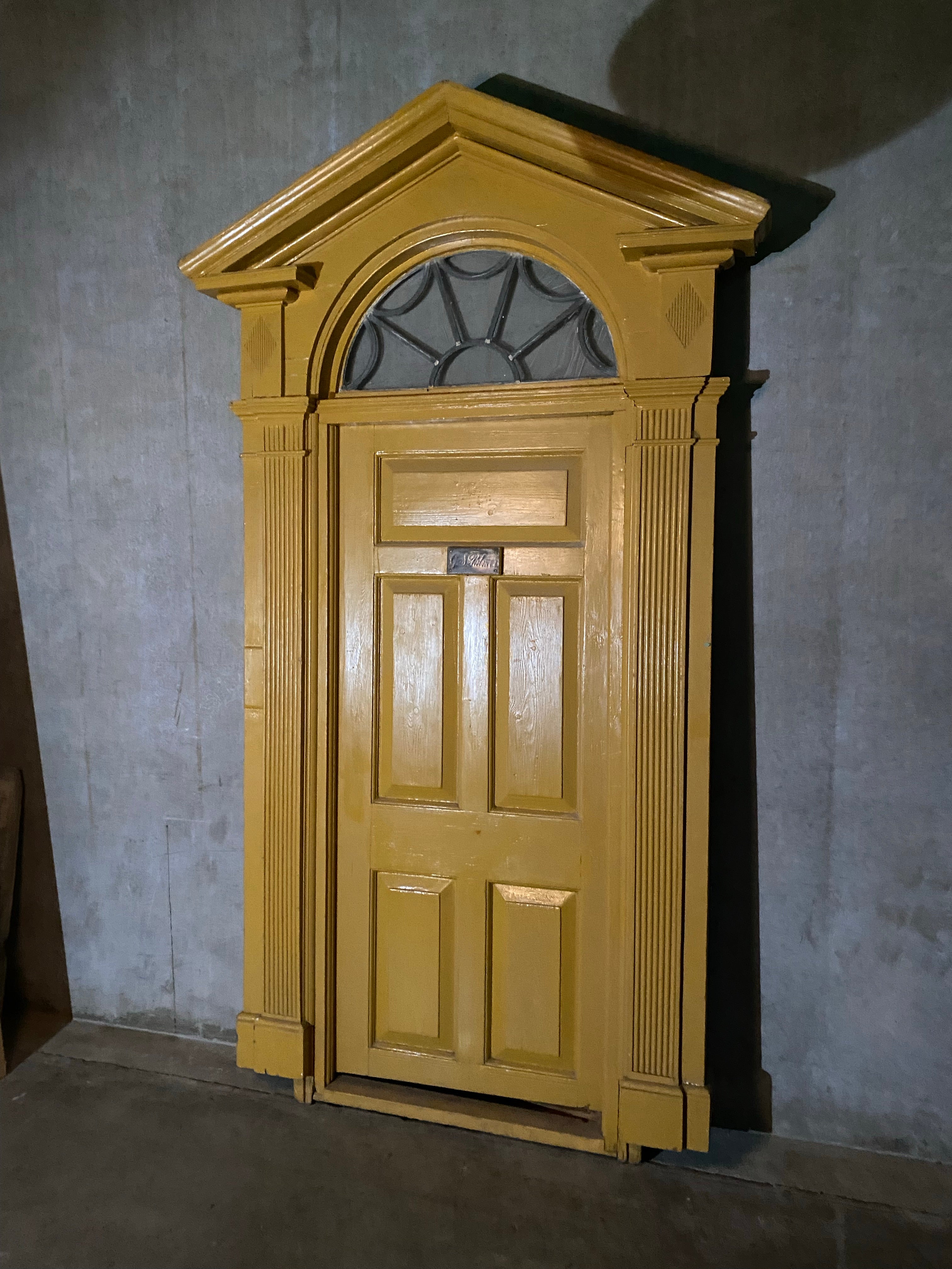 An incredibly rare early 19th century entry door, salvaged from the lost villages on the SEAWAY built in 1953 in eastern Ontario. Most of these very early homes were settles by empire loyalist at the beginning of the 19th c. This doorway with glass, wood and original door plaque, was salvaged in 1953 and kept in a private collection ever since. The Canadian government created upper Canada village museum showcasing settlers life and homestead.