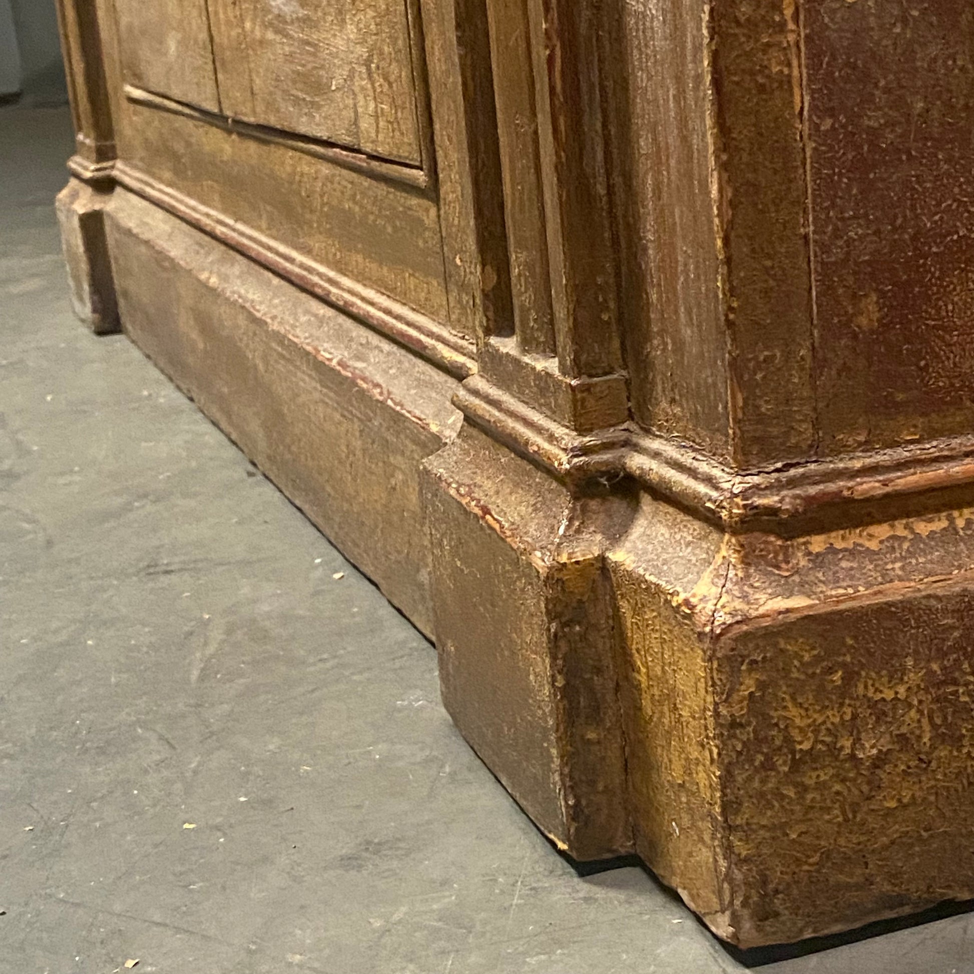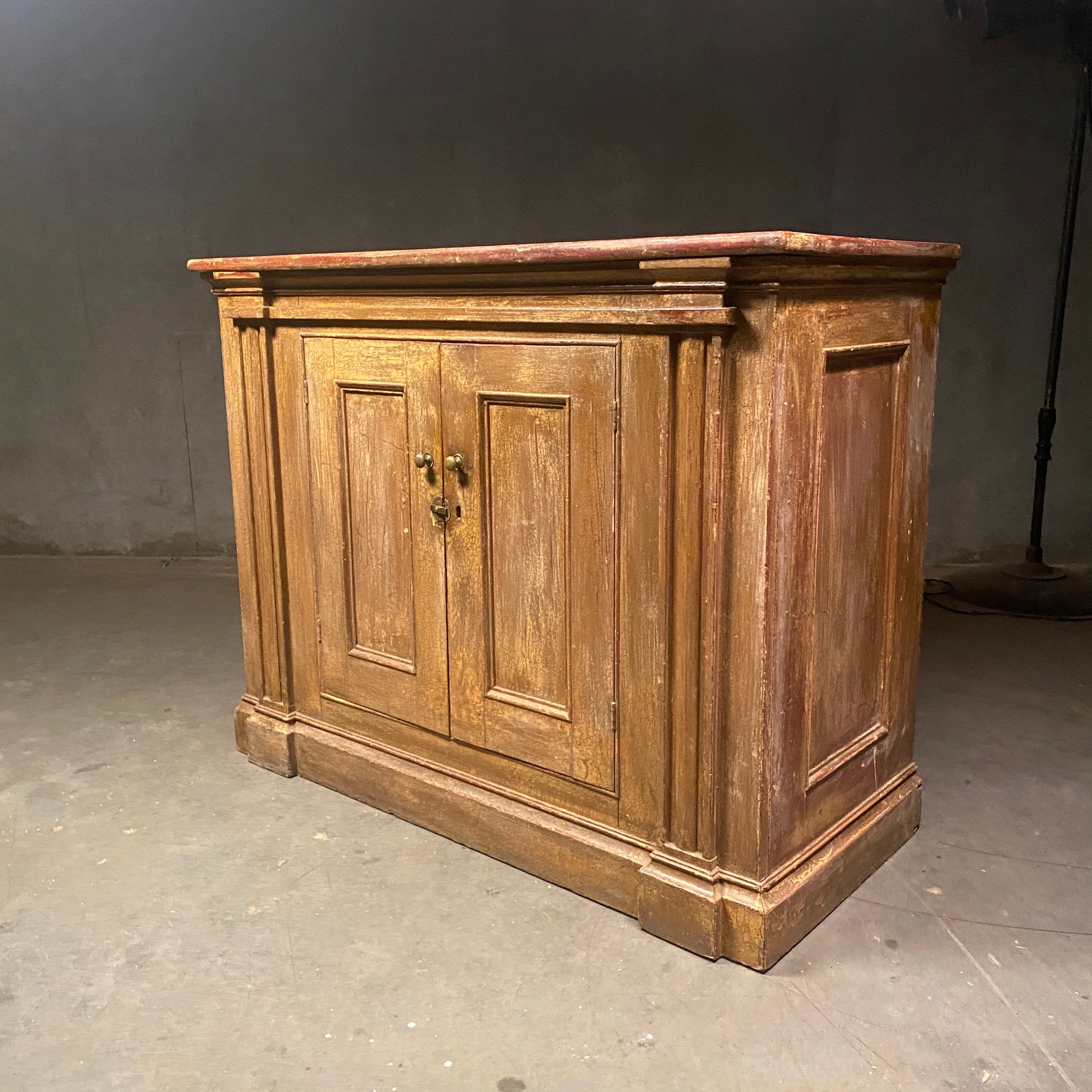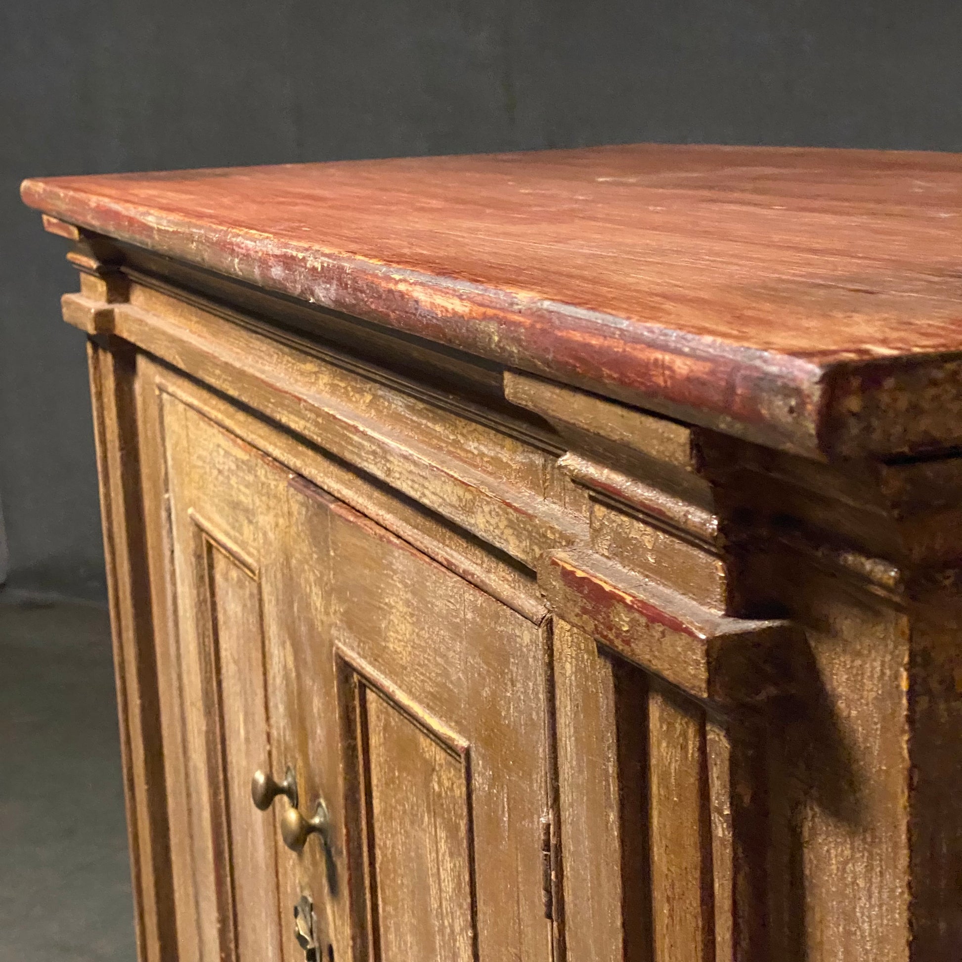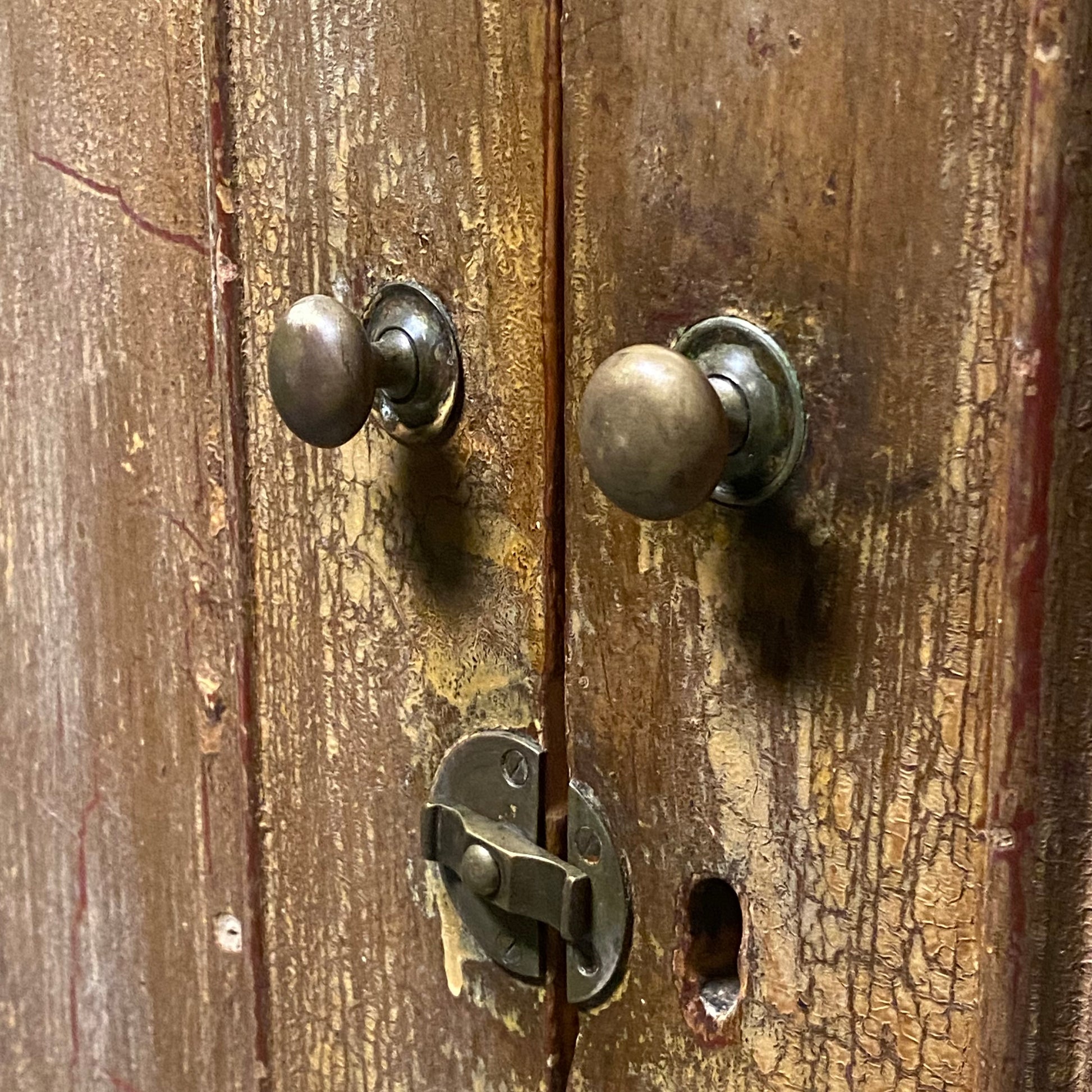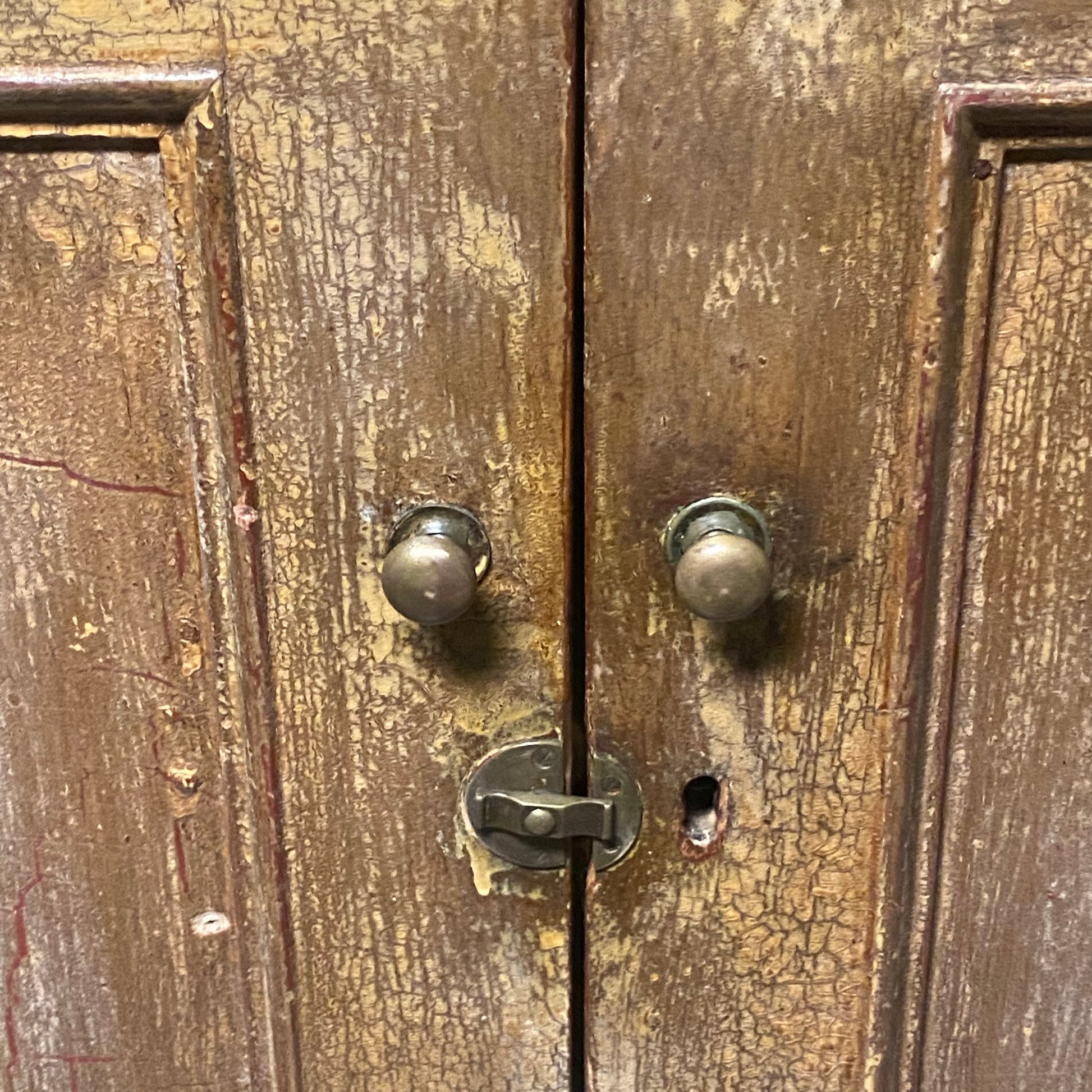 An exceptional piece retaining old age cracked original finish , architectural details , panels, forged nail contruction all in a compact well proportioned form. A very nice piece found in New -Brunswick.. Provenance- St. John collection For 50 years. 20 x 44 x 34