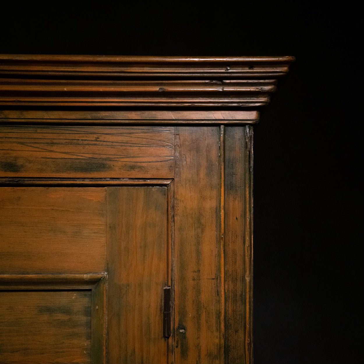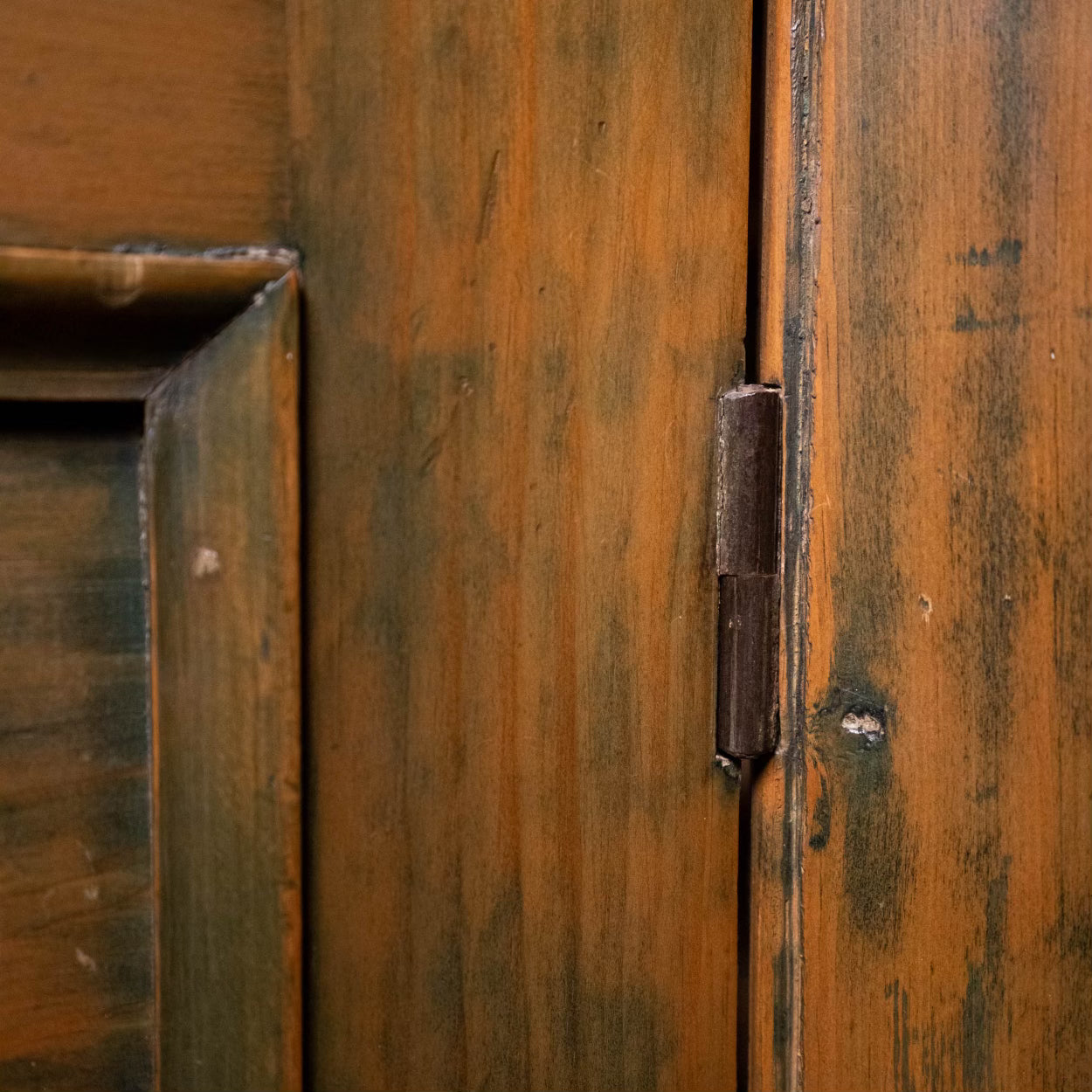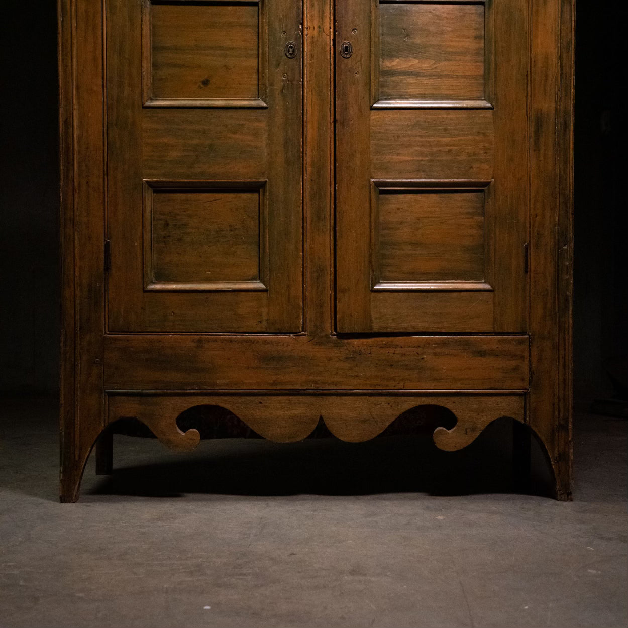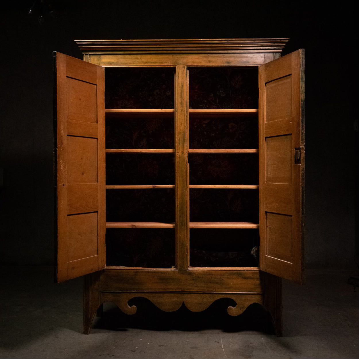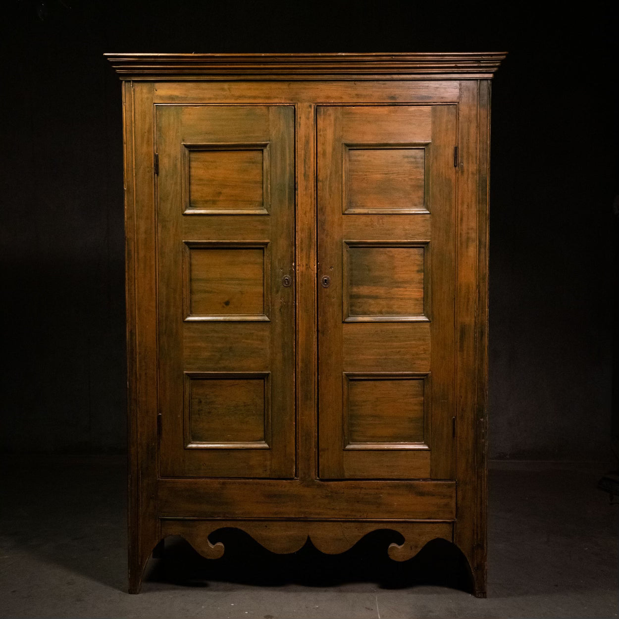An excellent example of a beautiful original Quebec armoire retaining old traces of original paint. Features multi panels & original shelves. Forged nail construction with very impressive base foot cut out.
