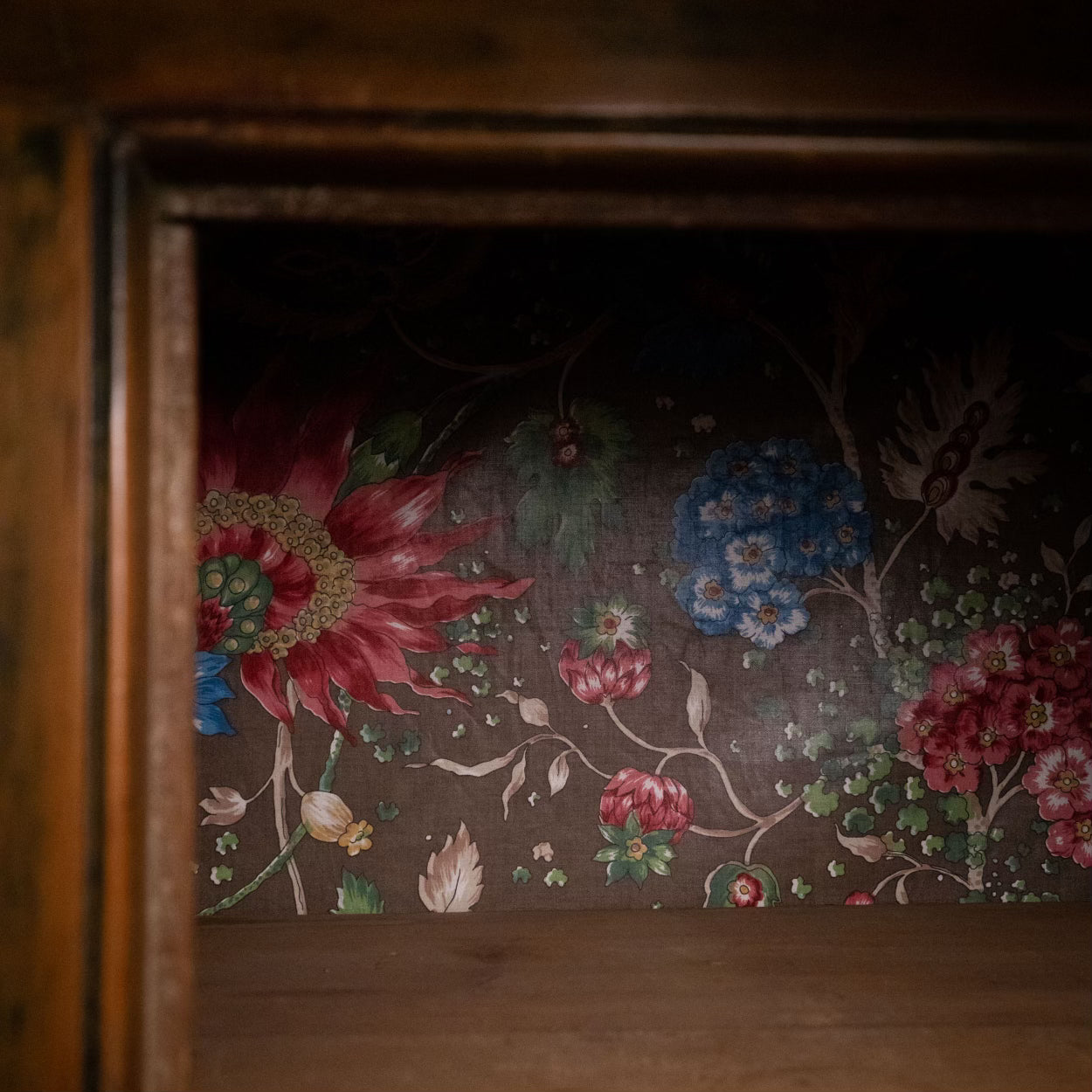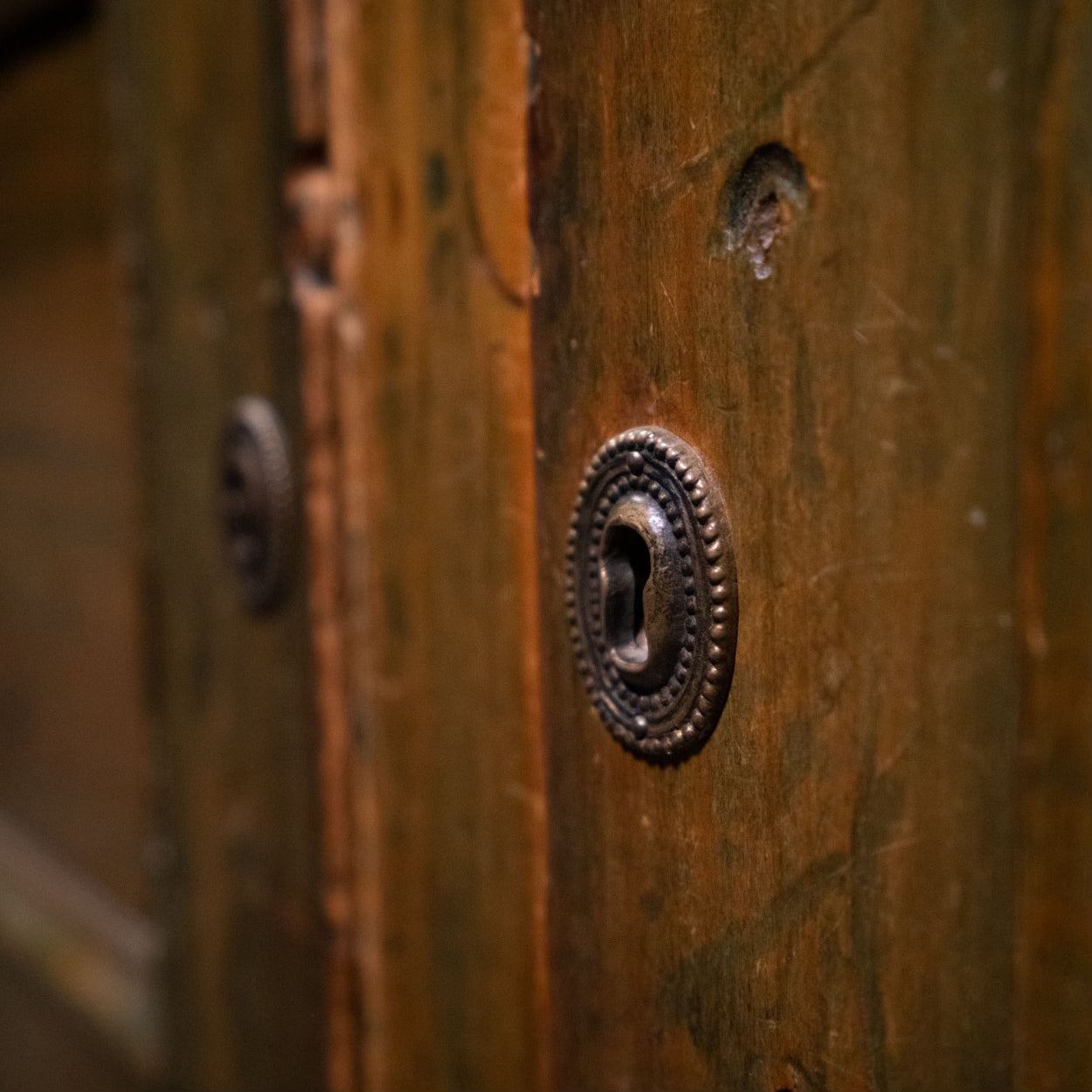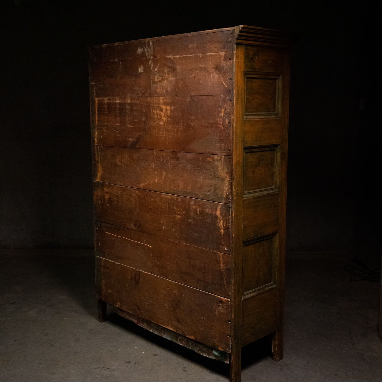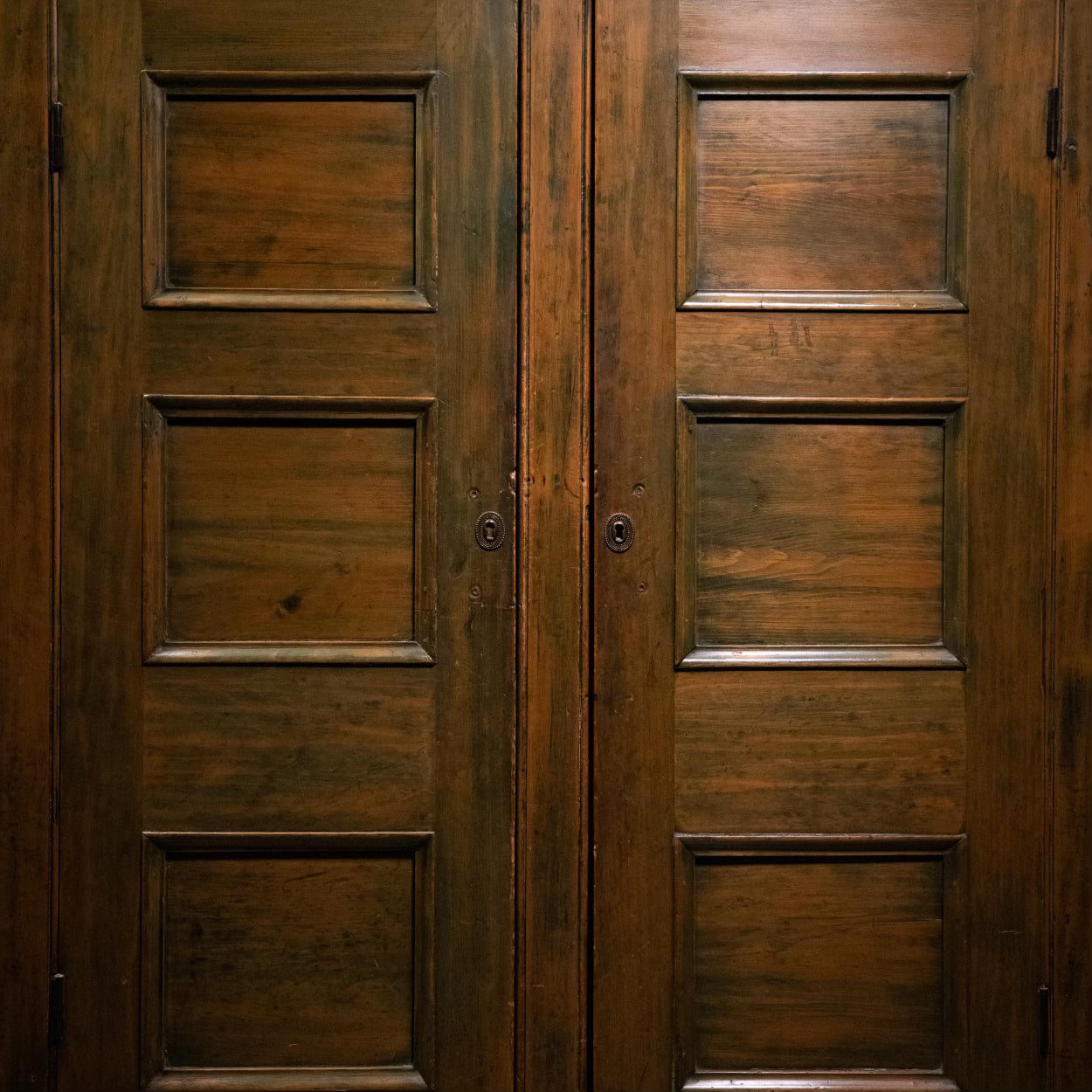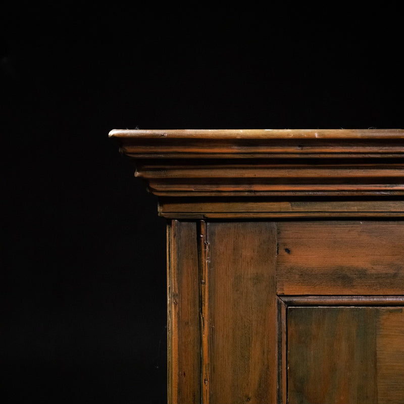 An excellent example of a beautiful original Quebec armoire retaining old traces of original paint. Features multi panels & original shelves. Forged nail construction with very impressive base foot cut out.