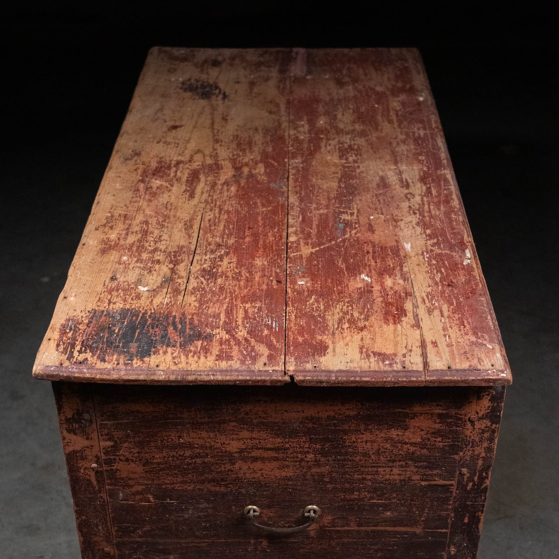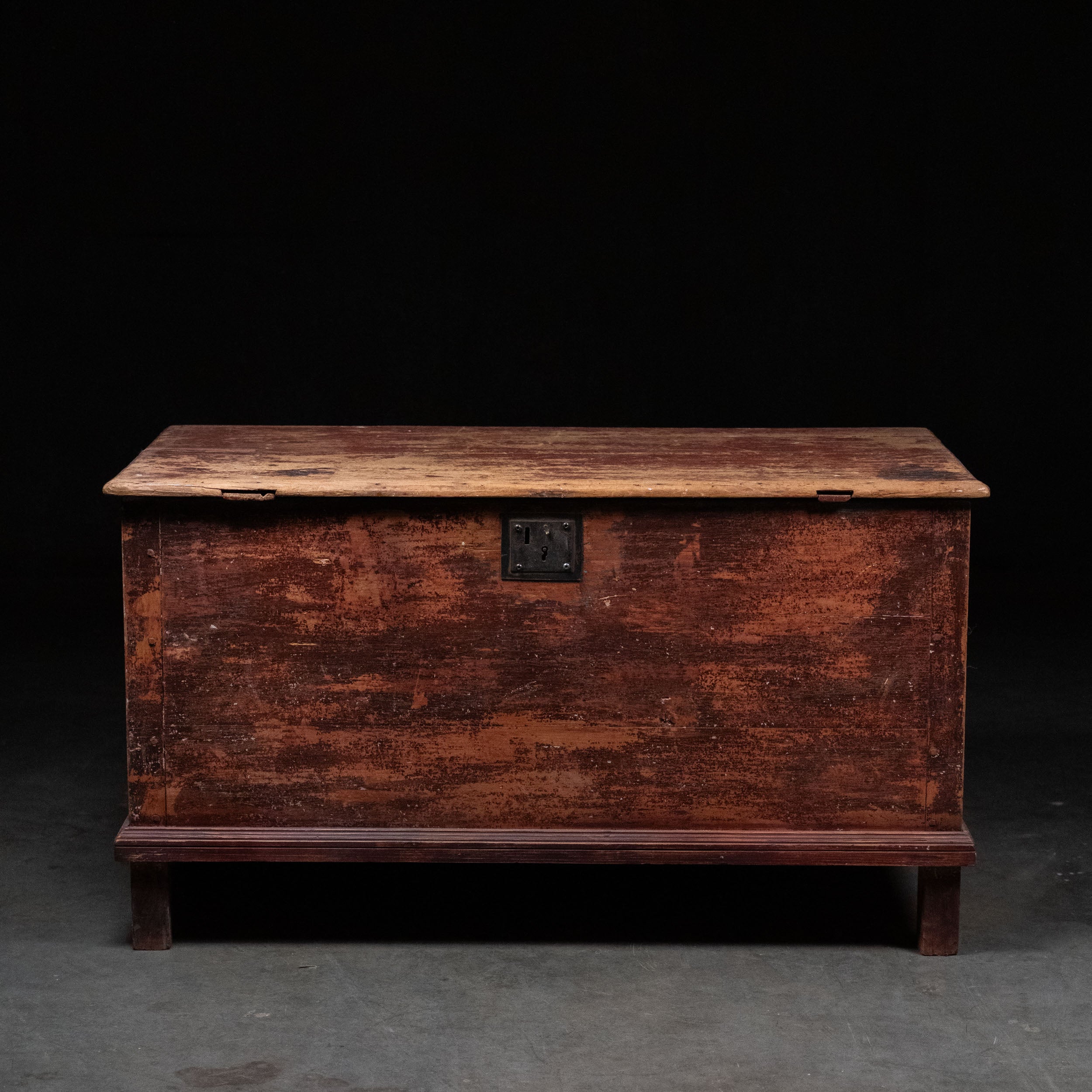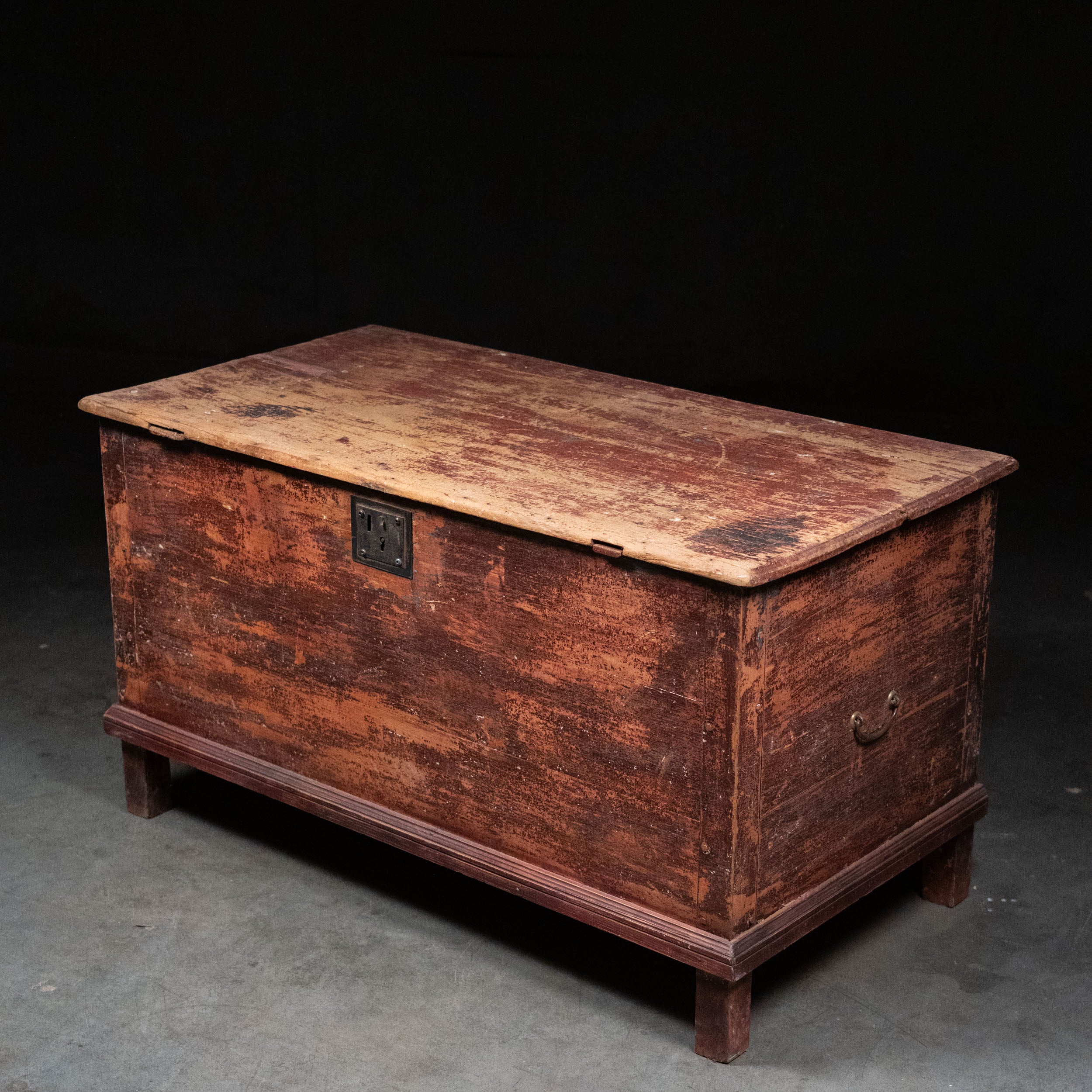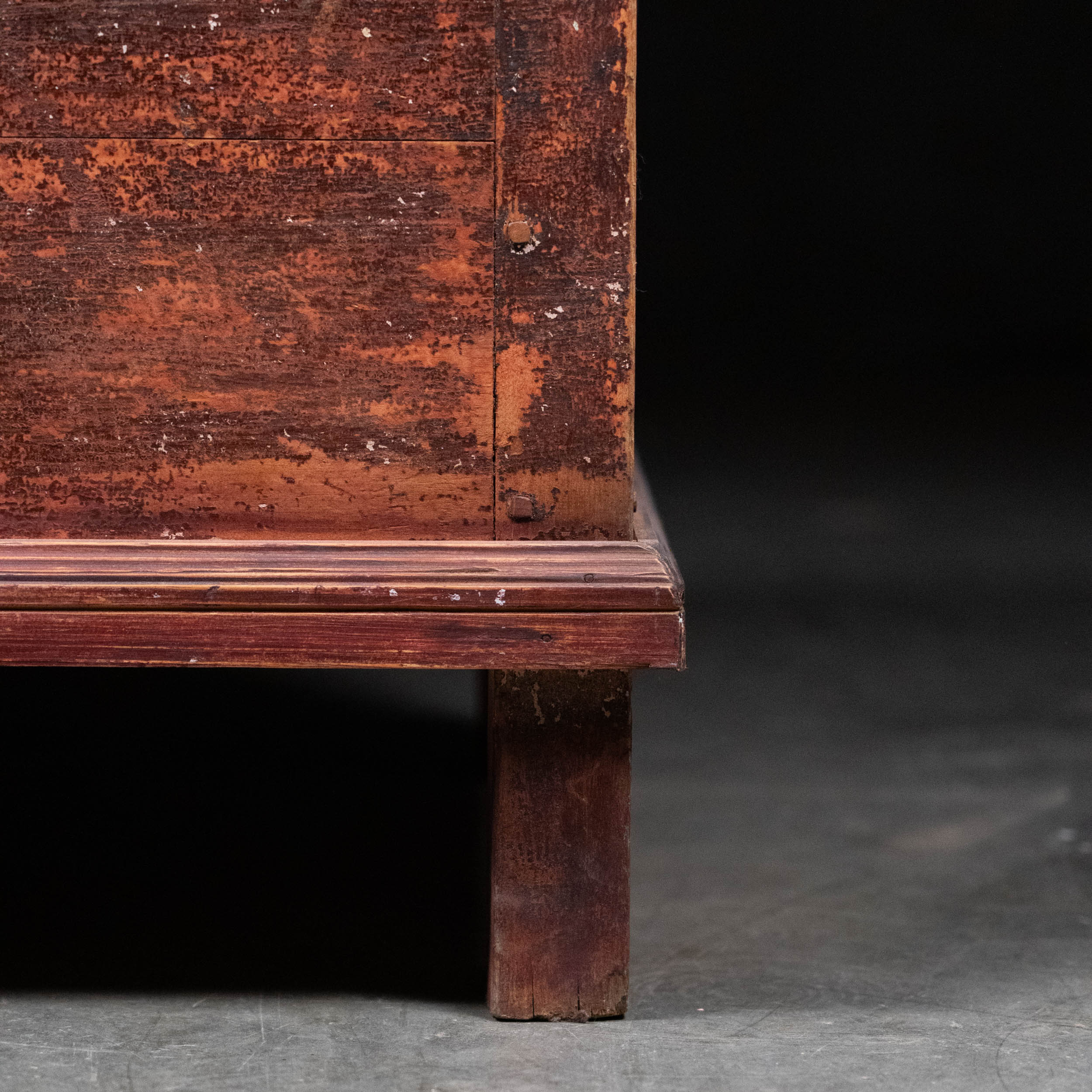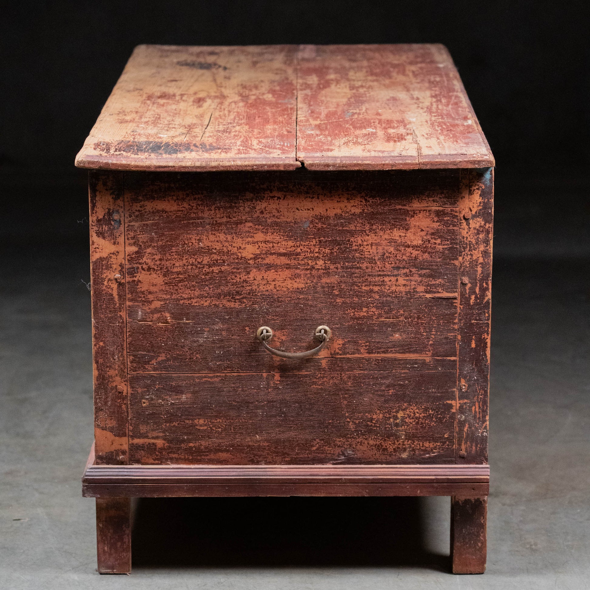 A true Quebec box in old crusted red paint, featuring cast forged hinges and nails. This is an early piece with minor restoration to molding.