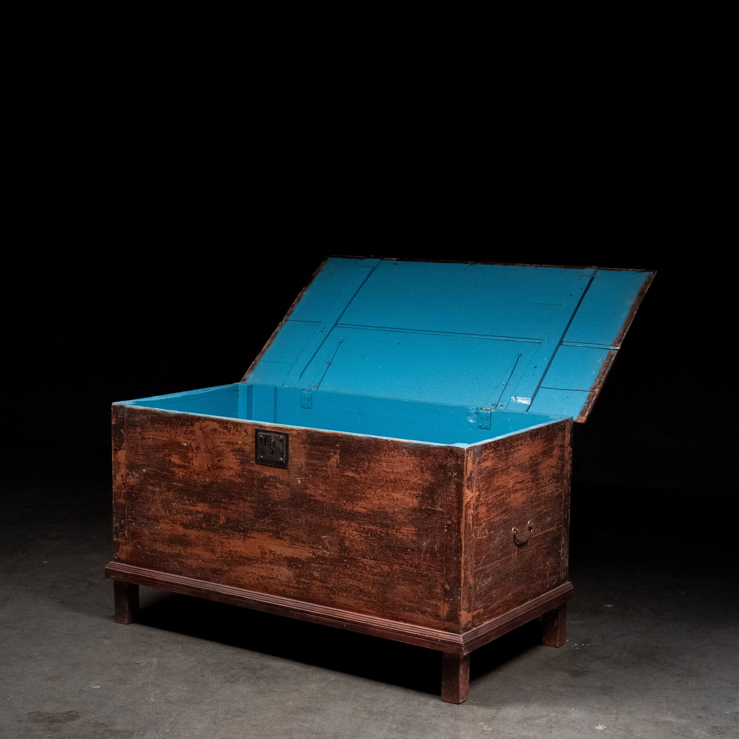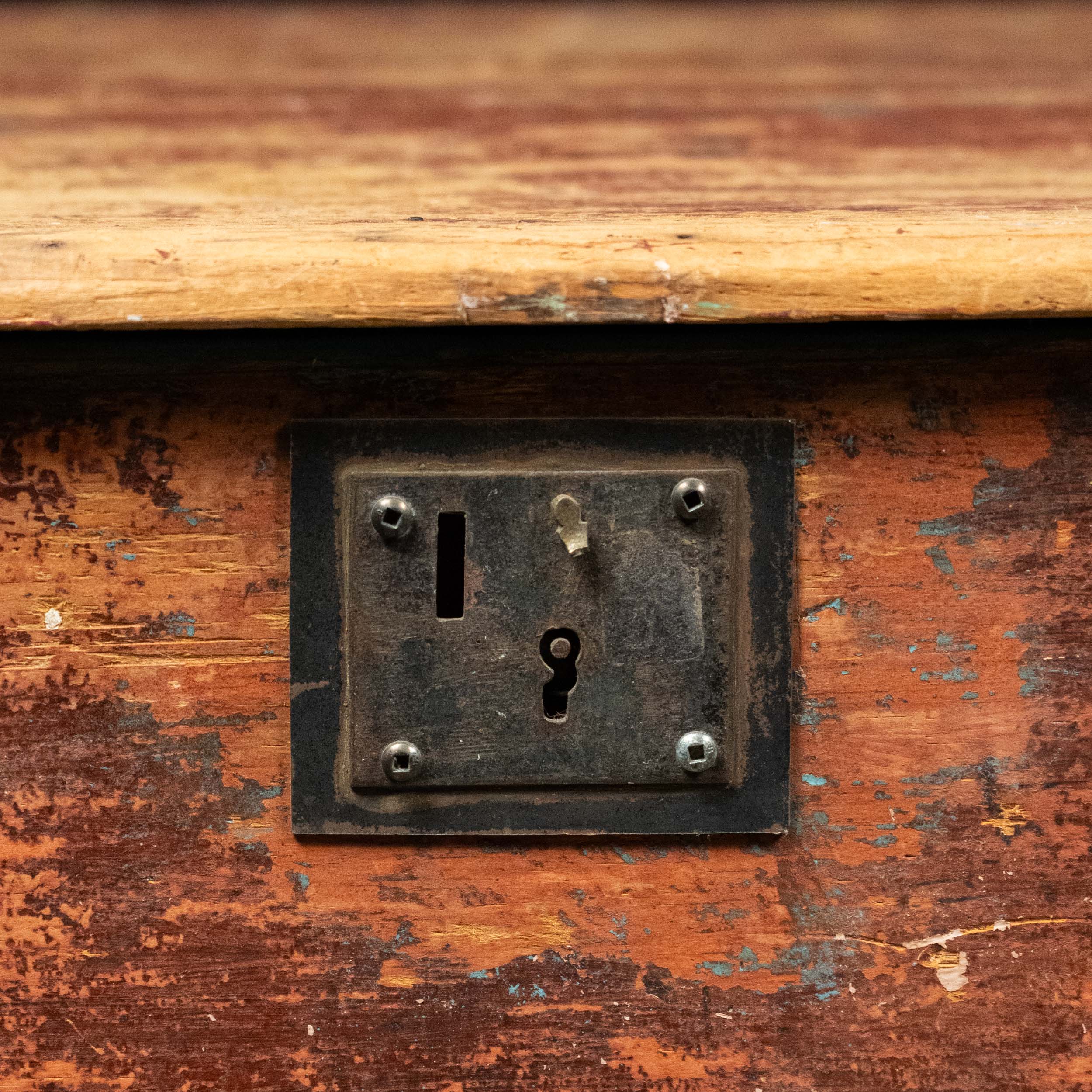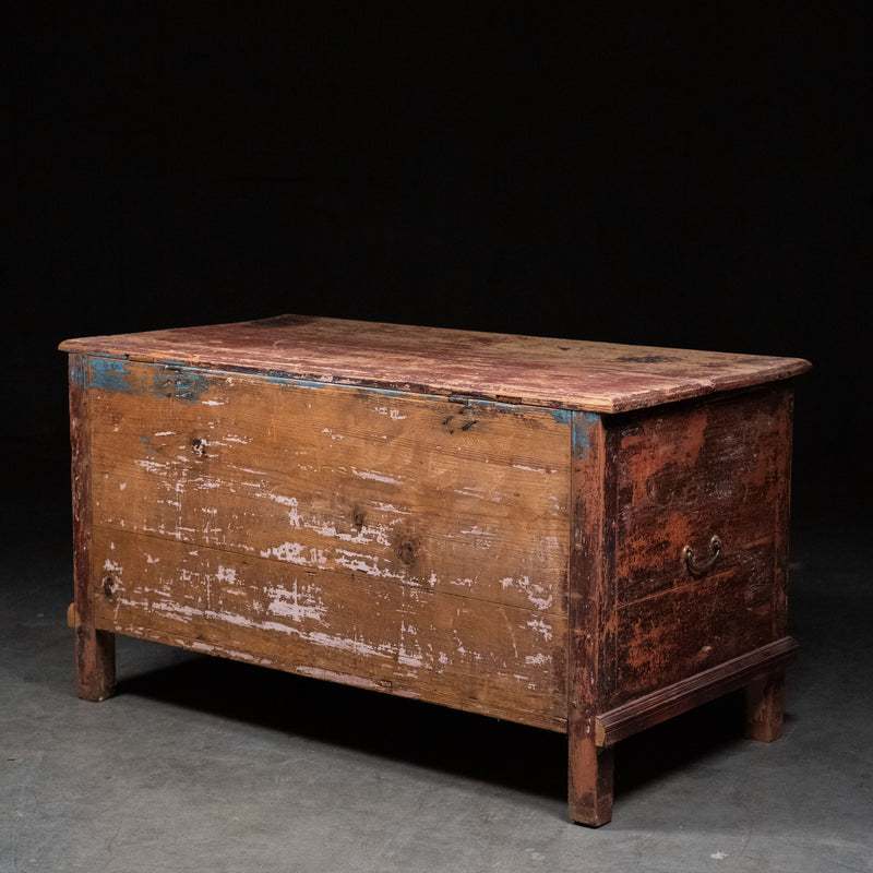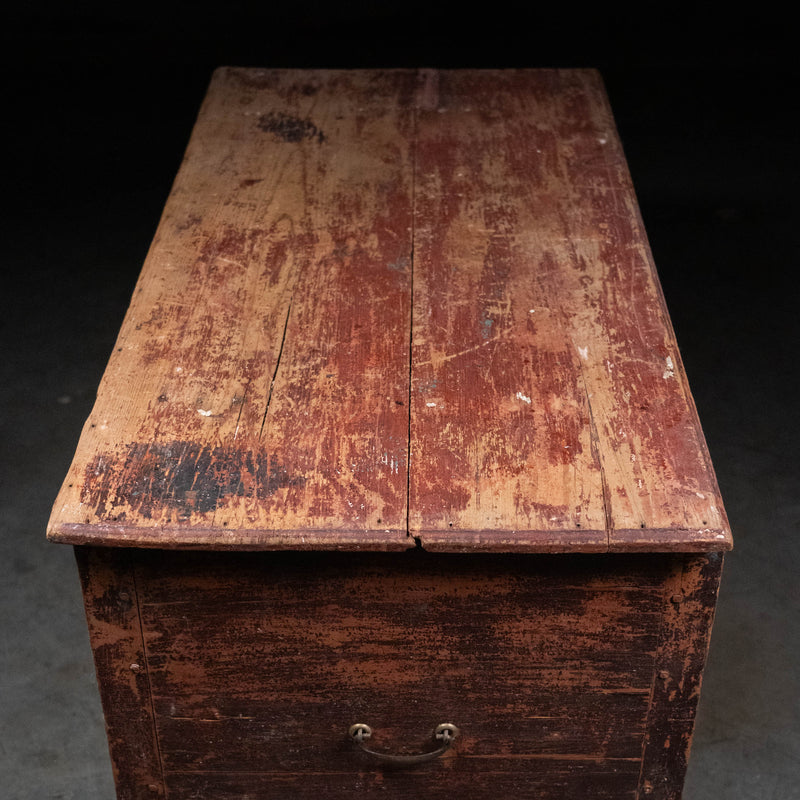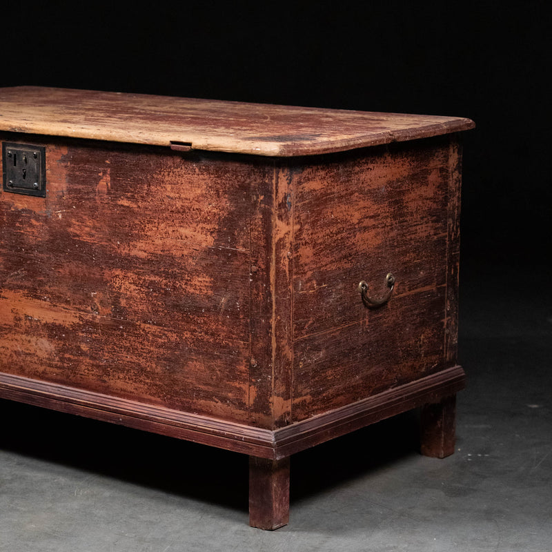 A true Quebec box in old crusted red paint, featuring cast forged hinges and nails. This is an early piece with minor restoration to molding.