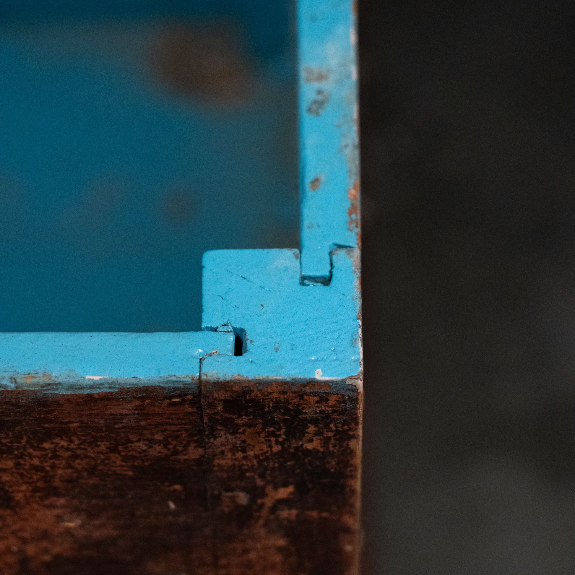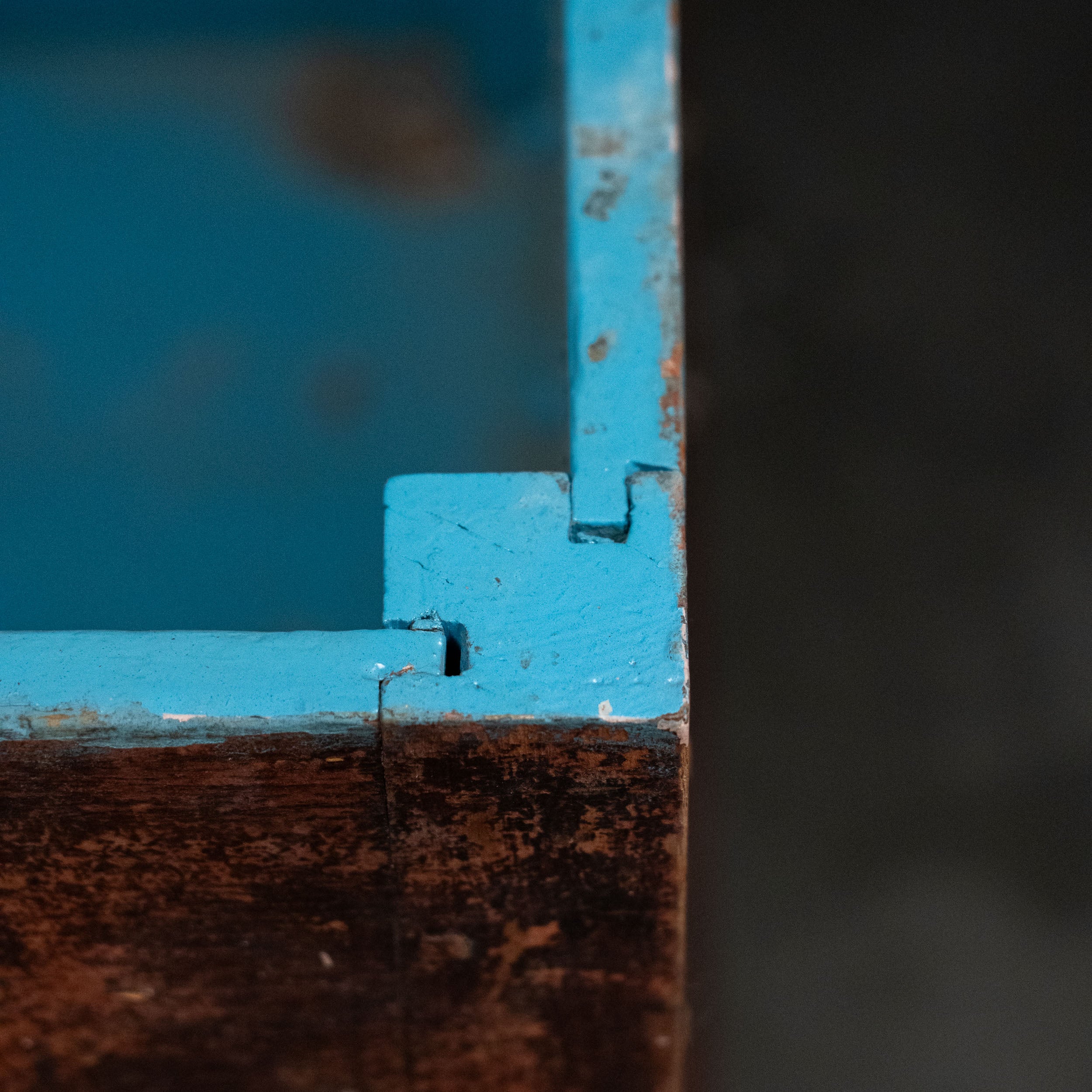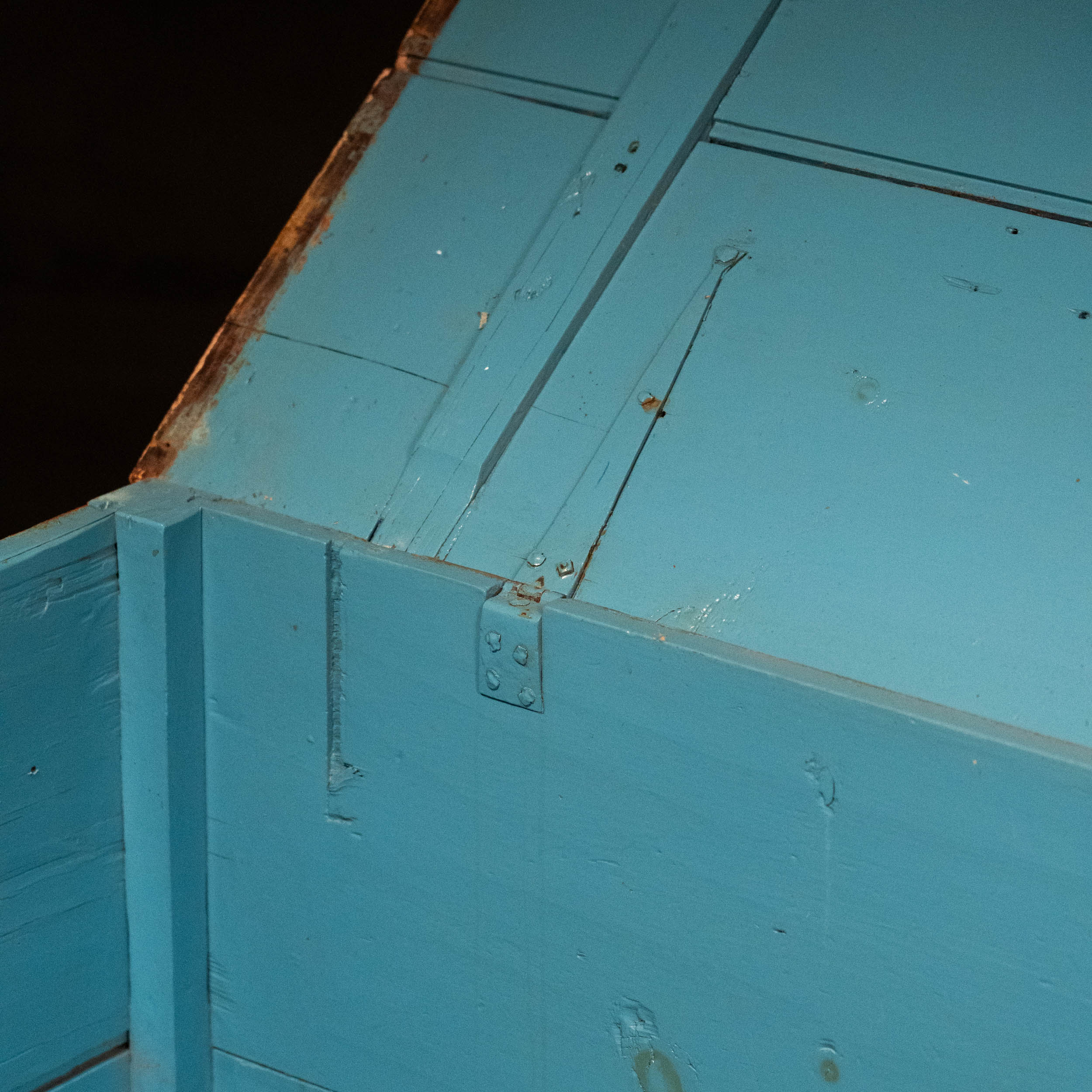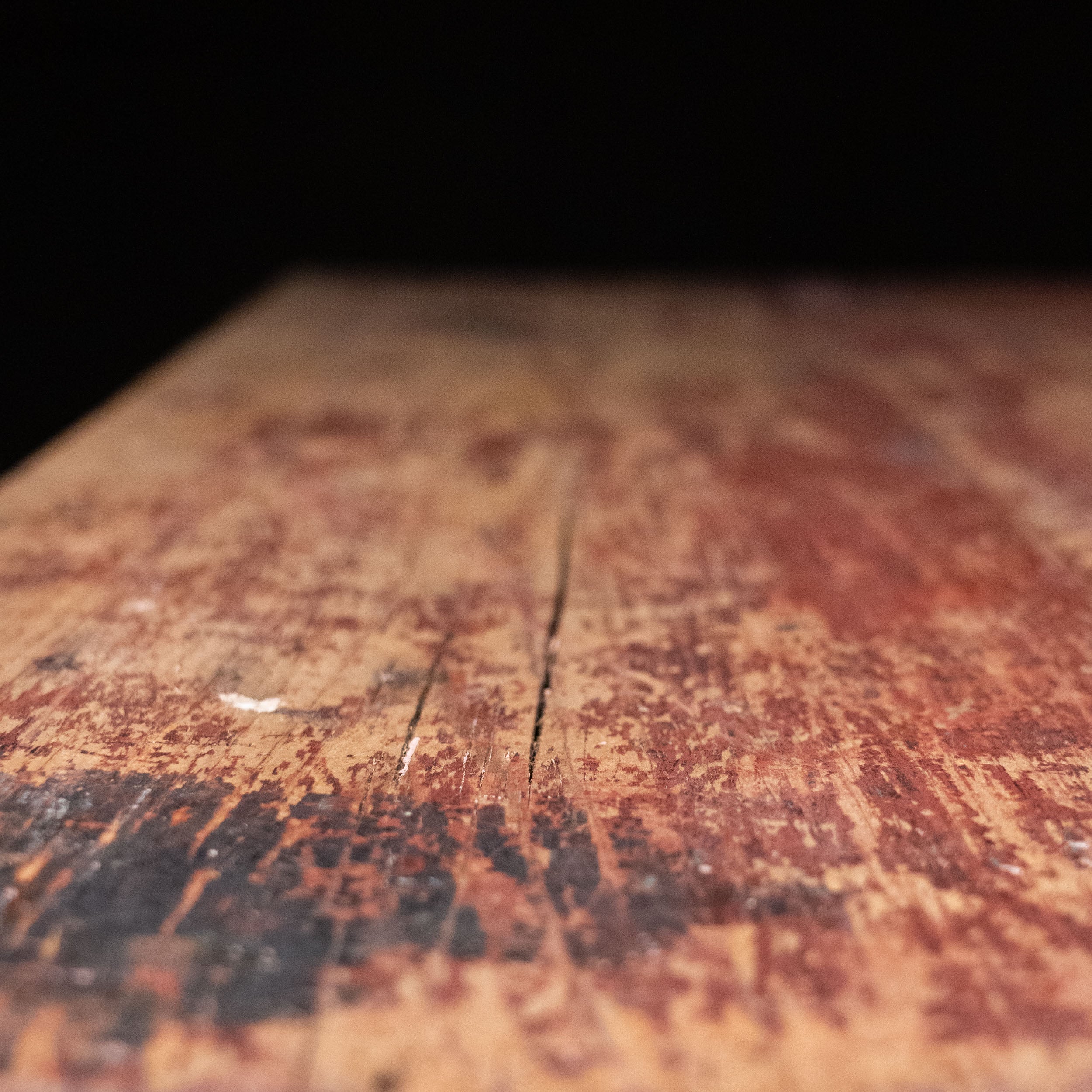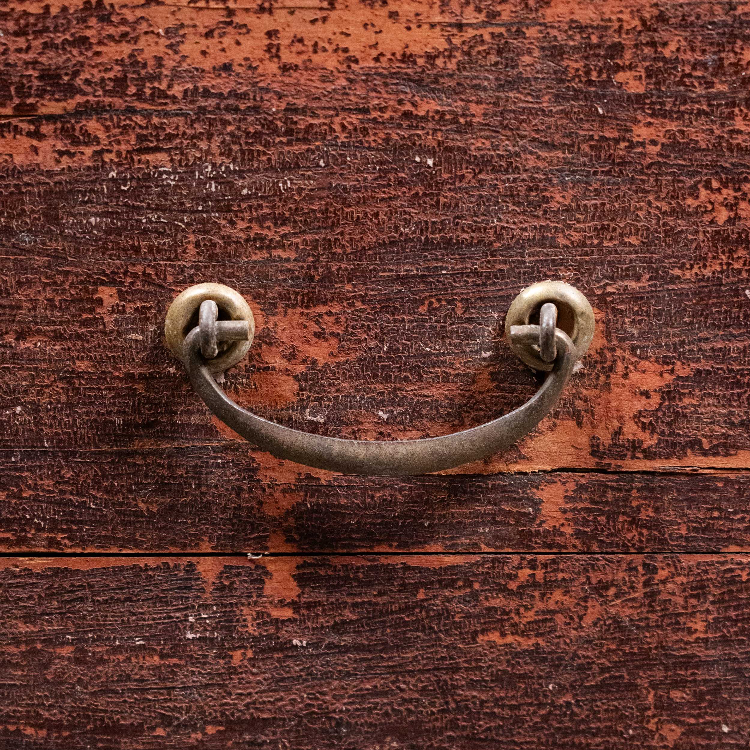 A true Quebec box in old crusted red paint, featuring cast forged hinges and nails. This is an early piece with minor restoration to molding.