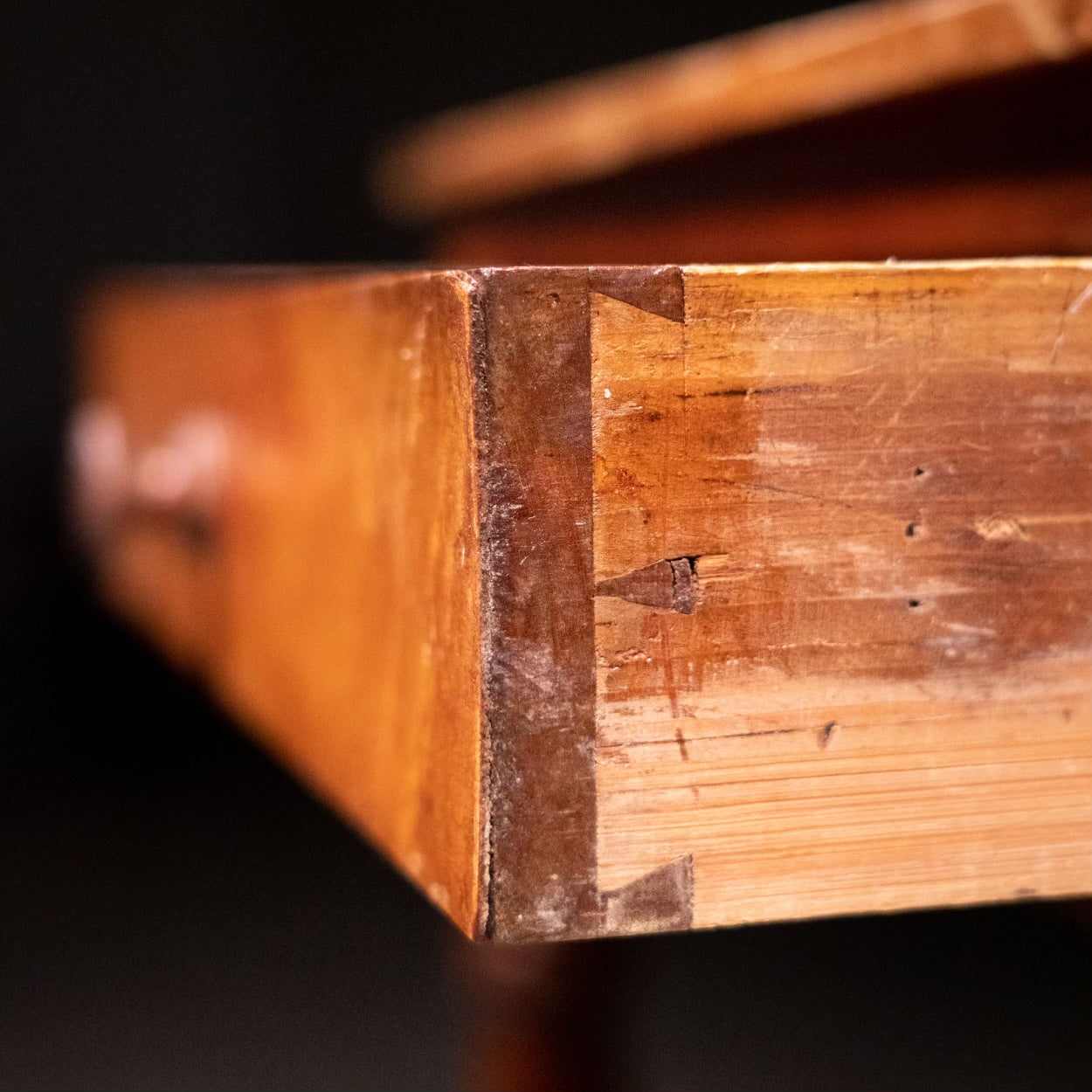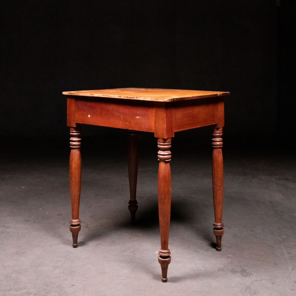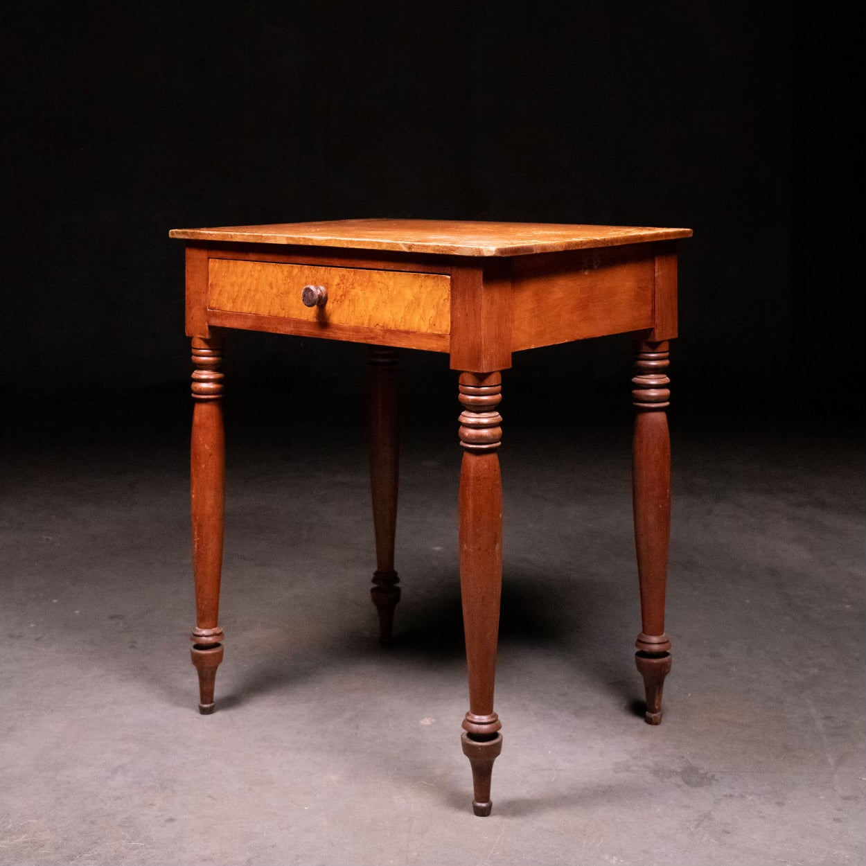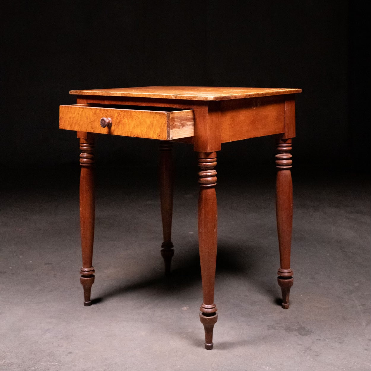 A very nice simple turned leg , one drawer stand with strong figured maple drawer , old finish and a beautiful turned foot. Found in upper NY.