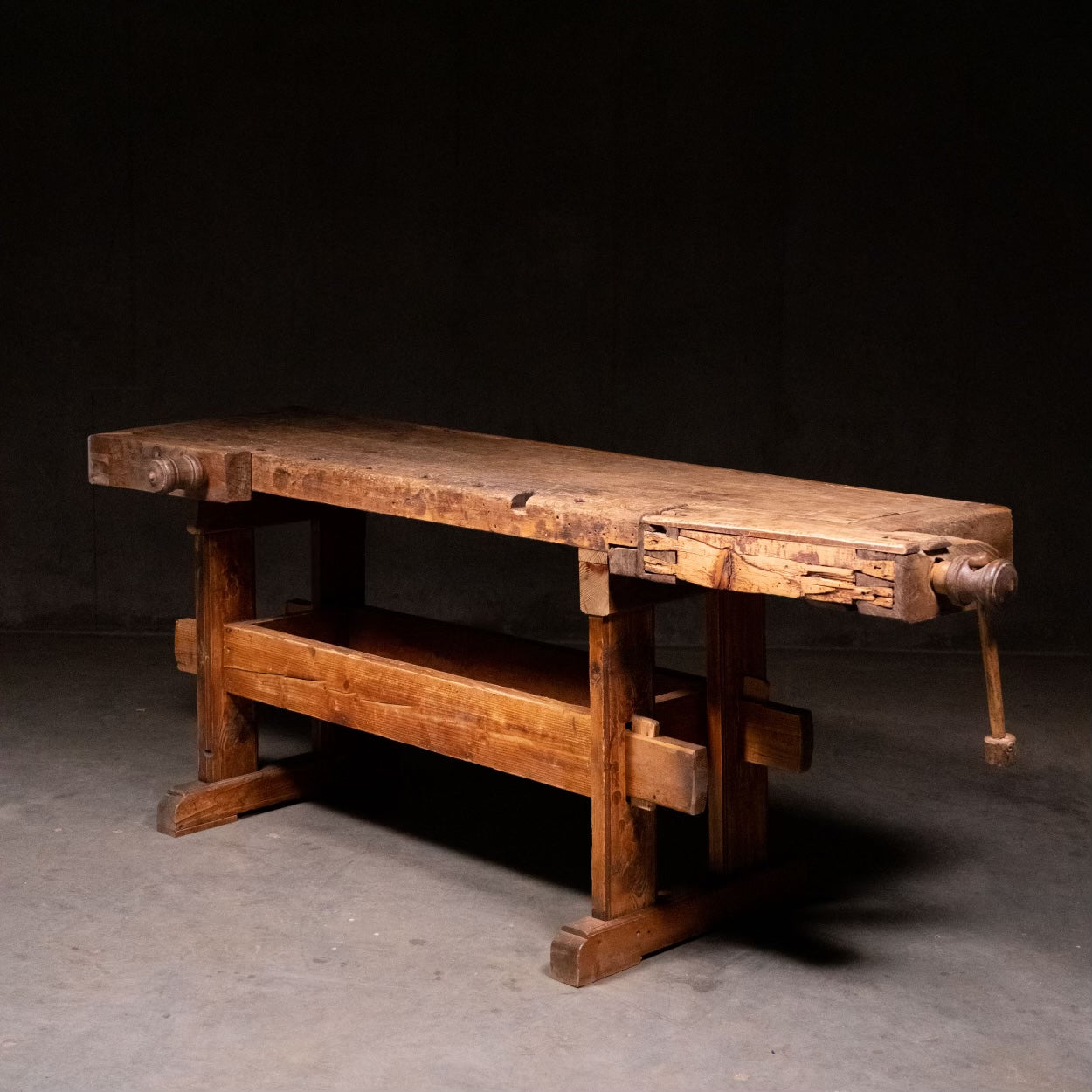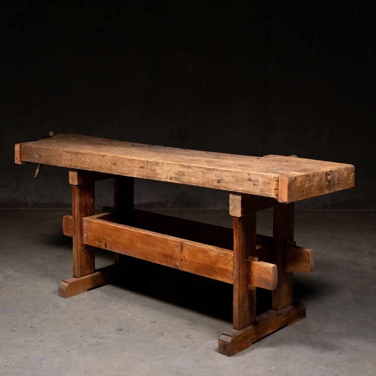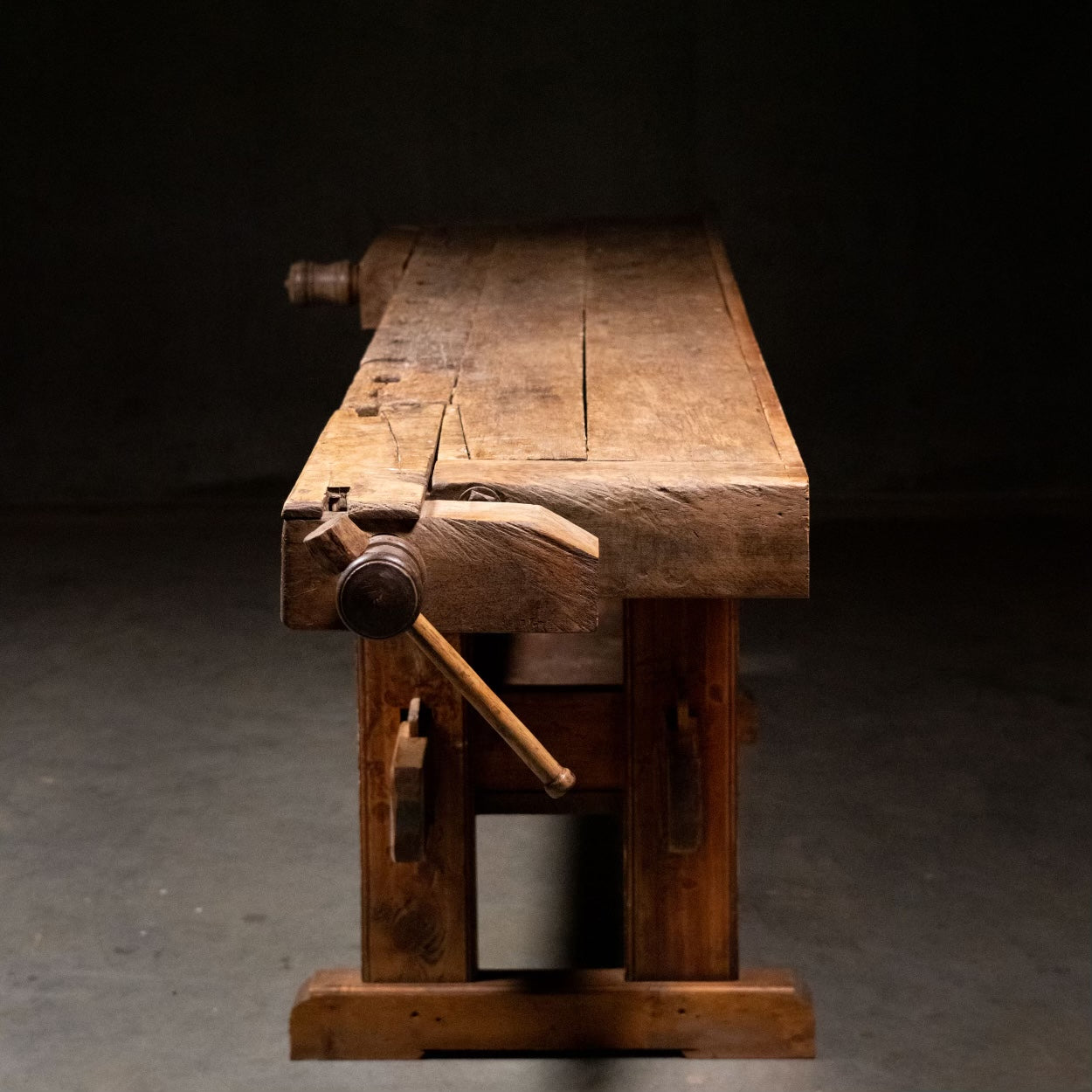 A beautiful example of a work bench with great tones, molded details , nice thick maple top with old wooden vise. Found in Quebec this is an early example , featuring a narrow depth .