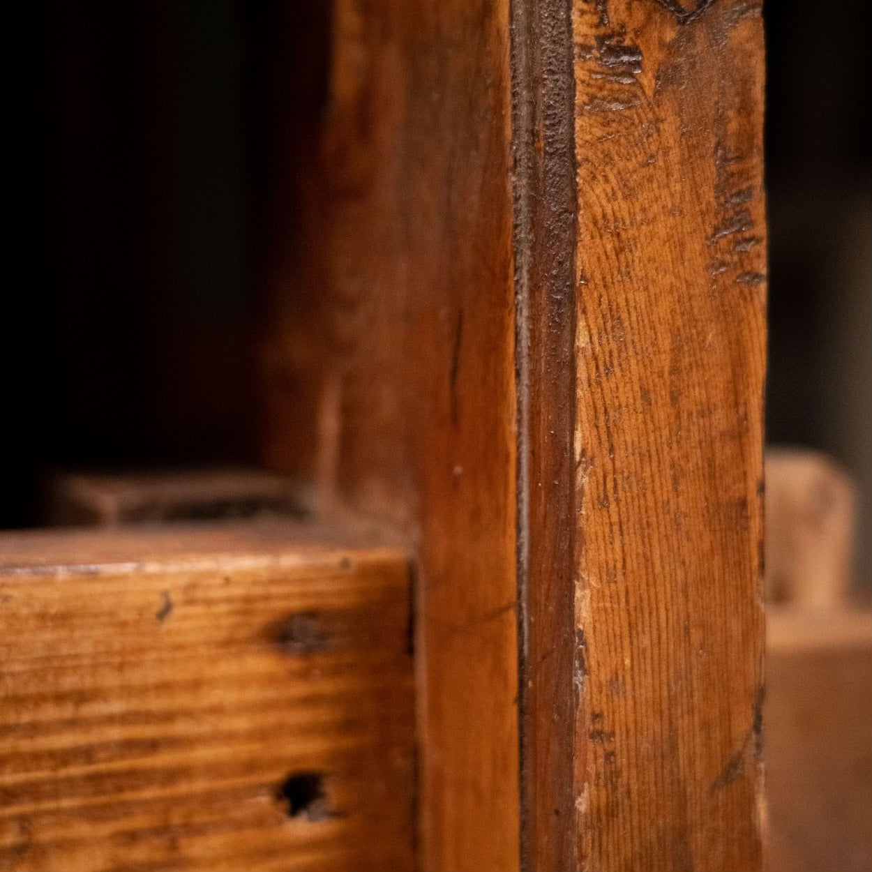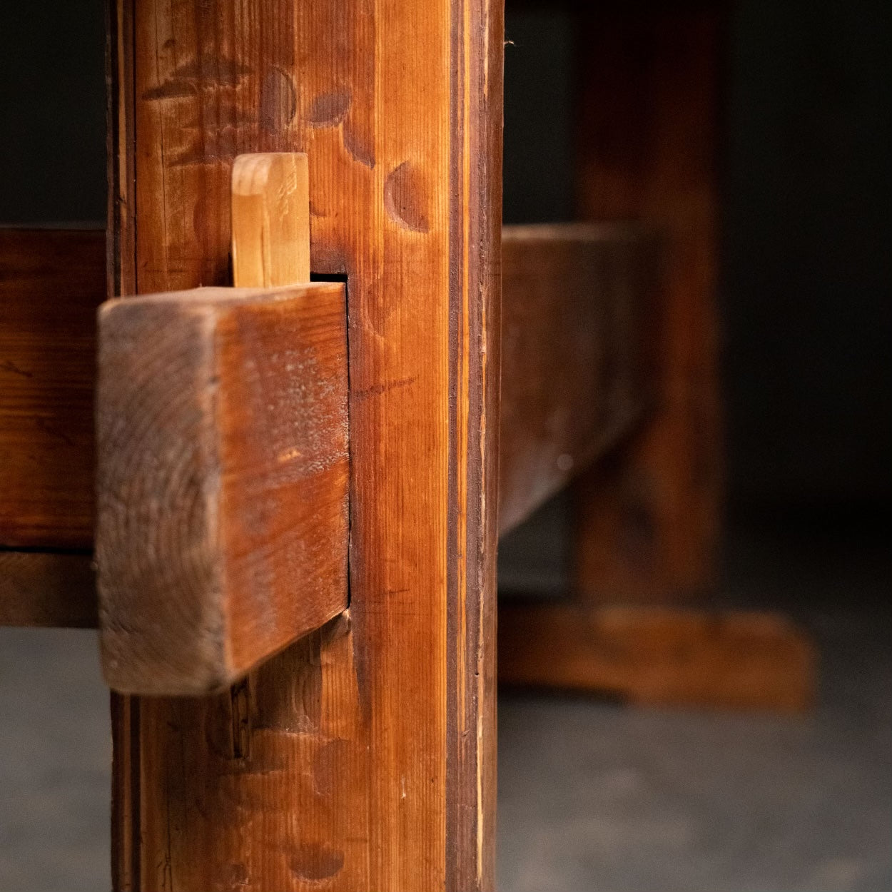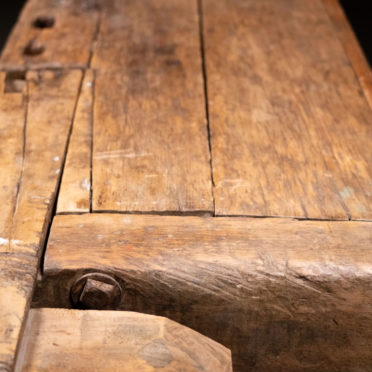 A beautiful example of a work bench with great tones, molded details , nice thick maple top with old wooden vise. Found in Quebec this is an early example , featuring a narrow depth .