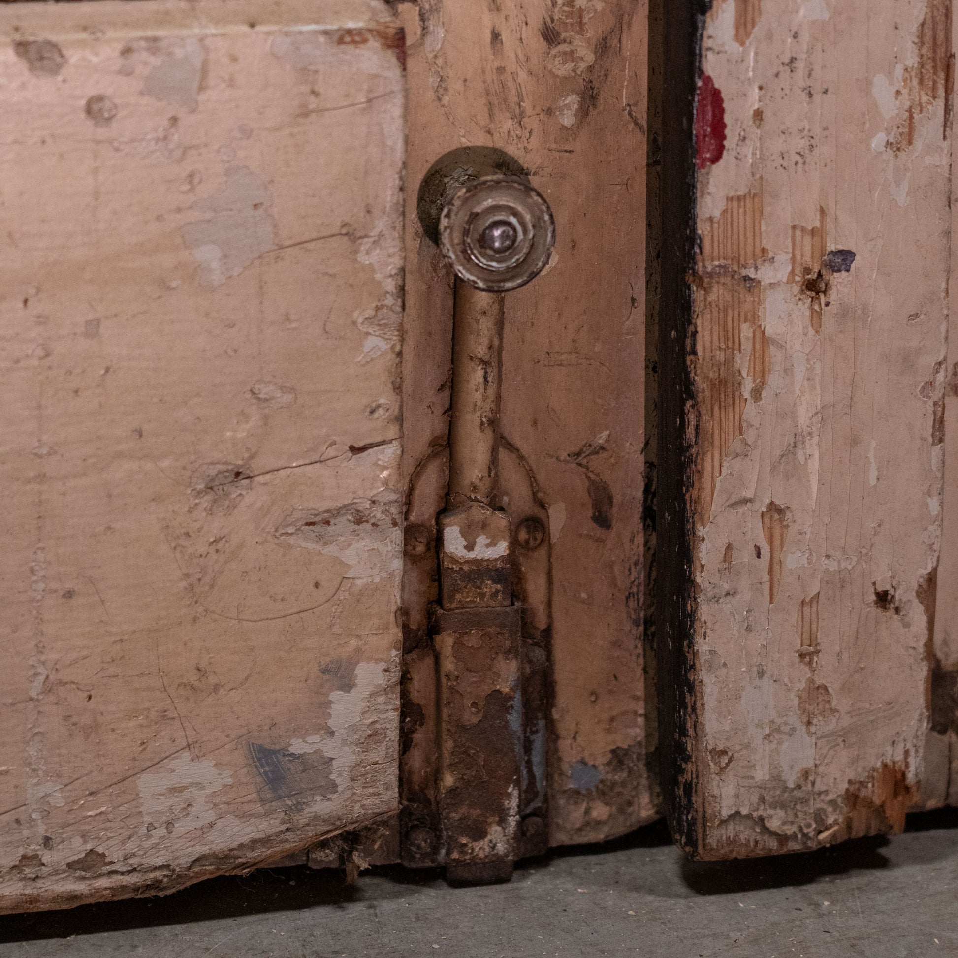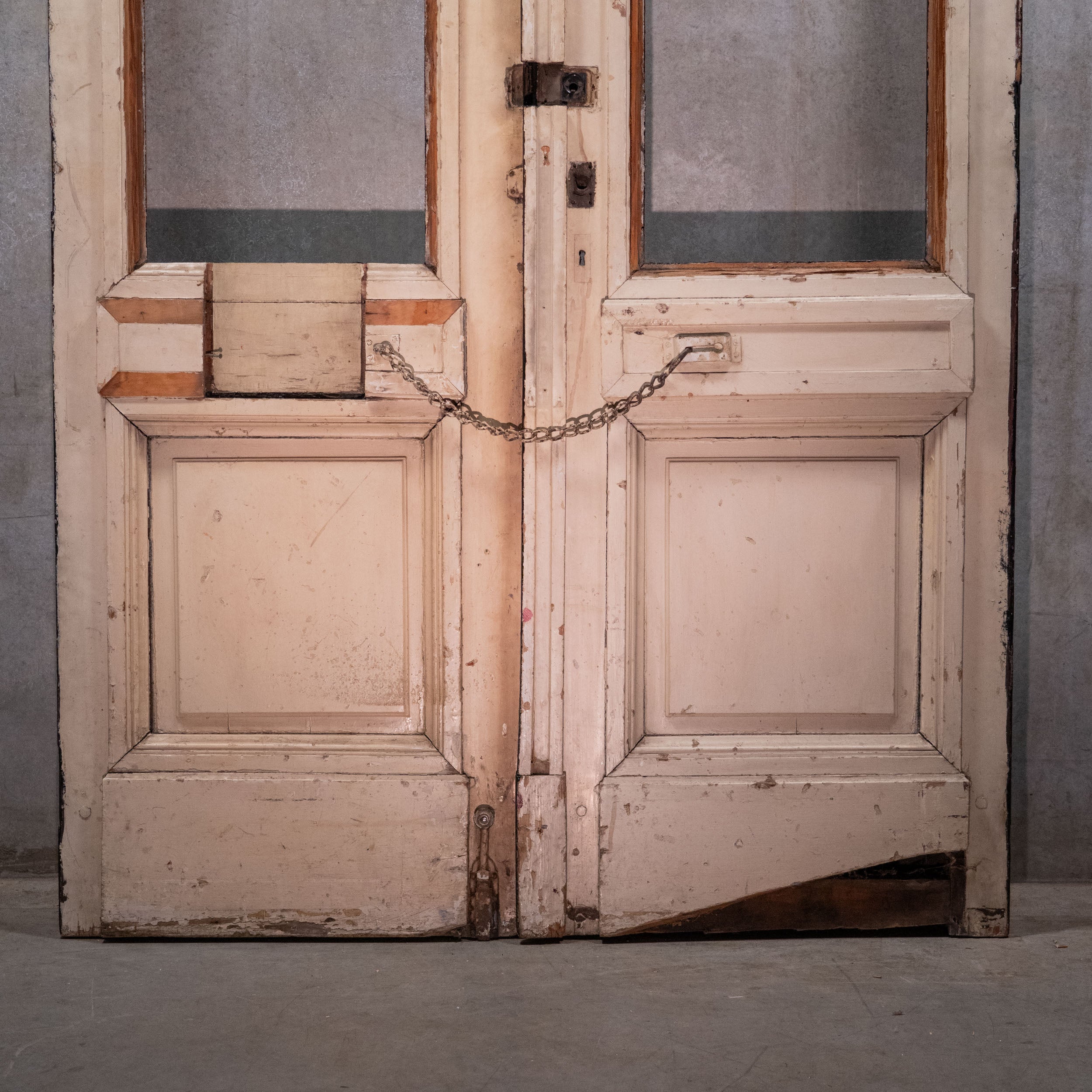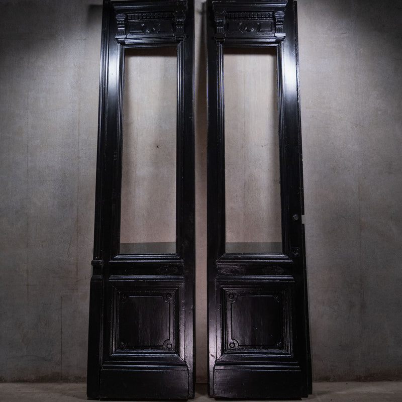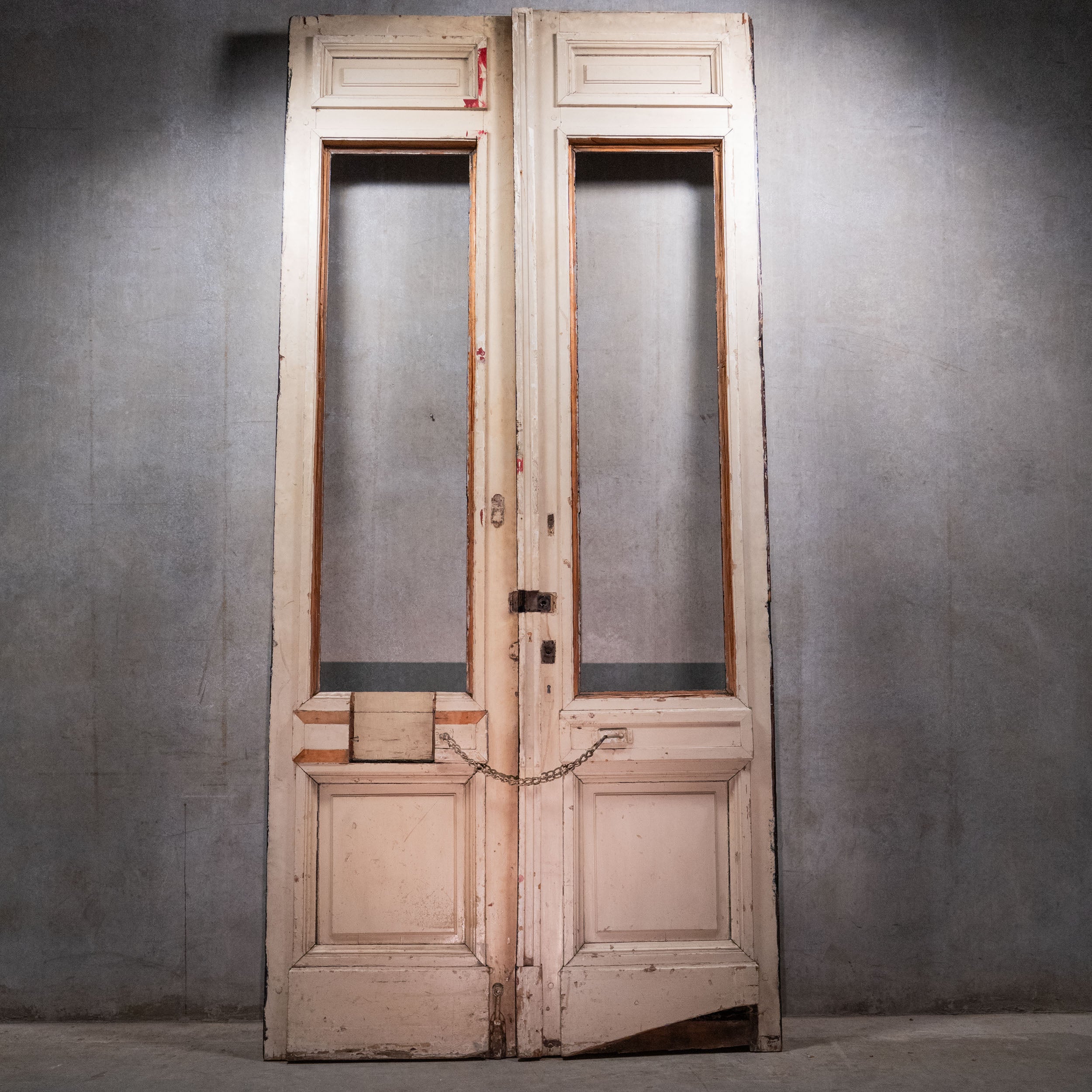 A matched pair of tall (10-foot high) doors salvaged from a commercial building in PNW. Dating from the 1880s, these solid wood doors retain their original paint. Nice hand-carved details in the wood; ready for your choice of glass.