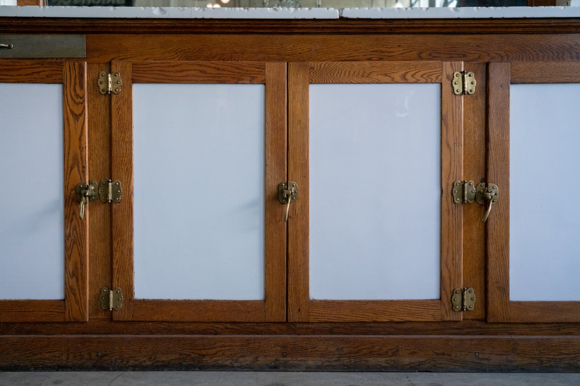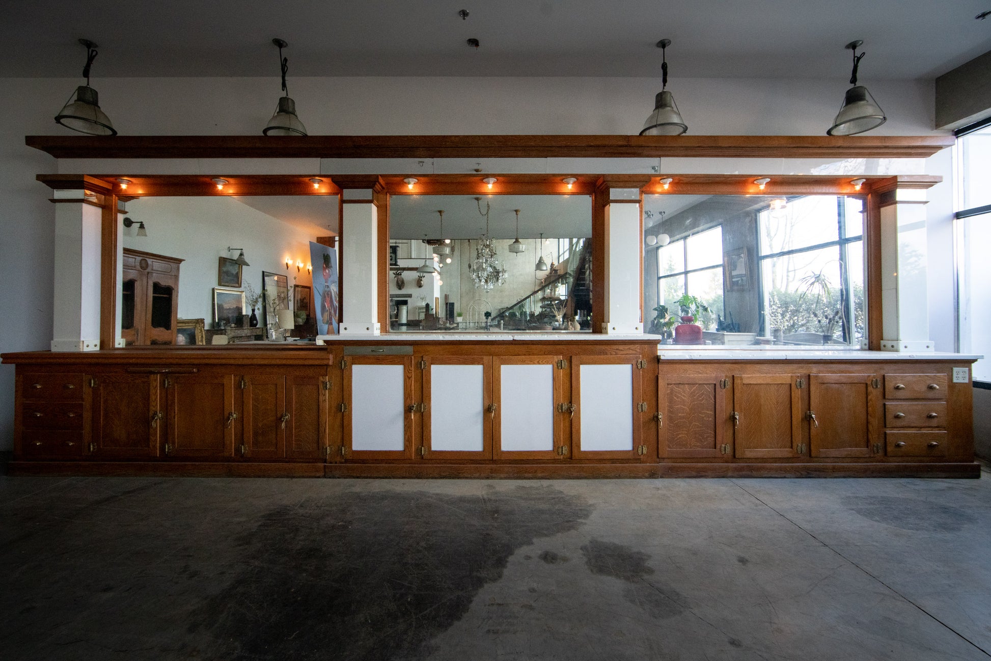 Featuring a rare original Back bar in solid oak, vitrolite , large mirrors , cool storage and lighting … salvaged years ago from a hotel in Portland , Oregon. This piece requires a bit of restoration , however can be left as is . This is a big 26 ft. Beauty. Please call for pricing and dismantling package .