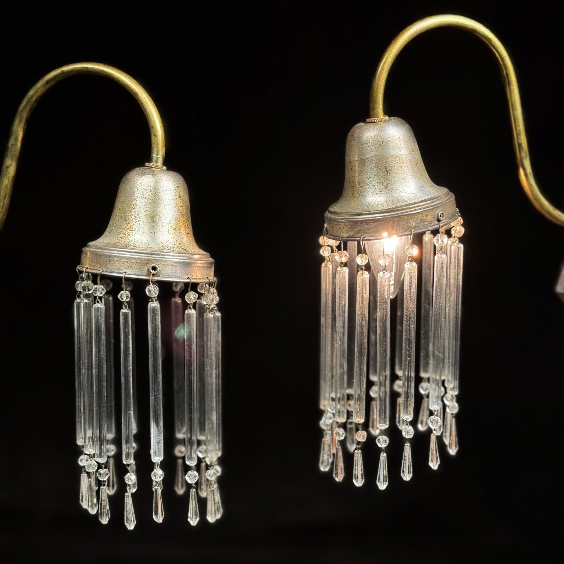 A beautifully crafted brass sconce set, featuring delicate turned piping and unique, shimmering crystals. The sconces are mounted on a silver-finished patina fitter, adding an elegant touch of vintage charm. Originally discovered in the Eastern United States, these fixtures blend artistry and history in a distinctive way.
