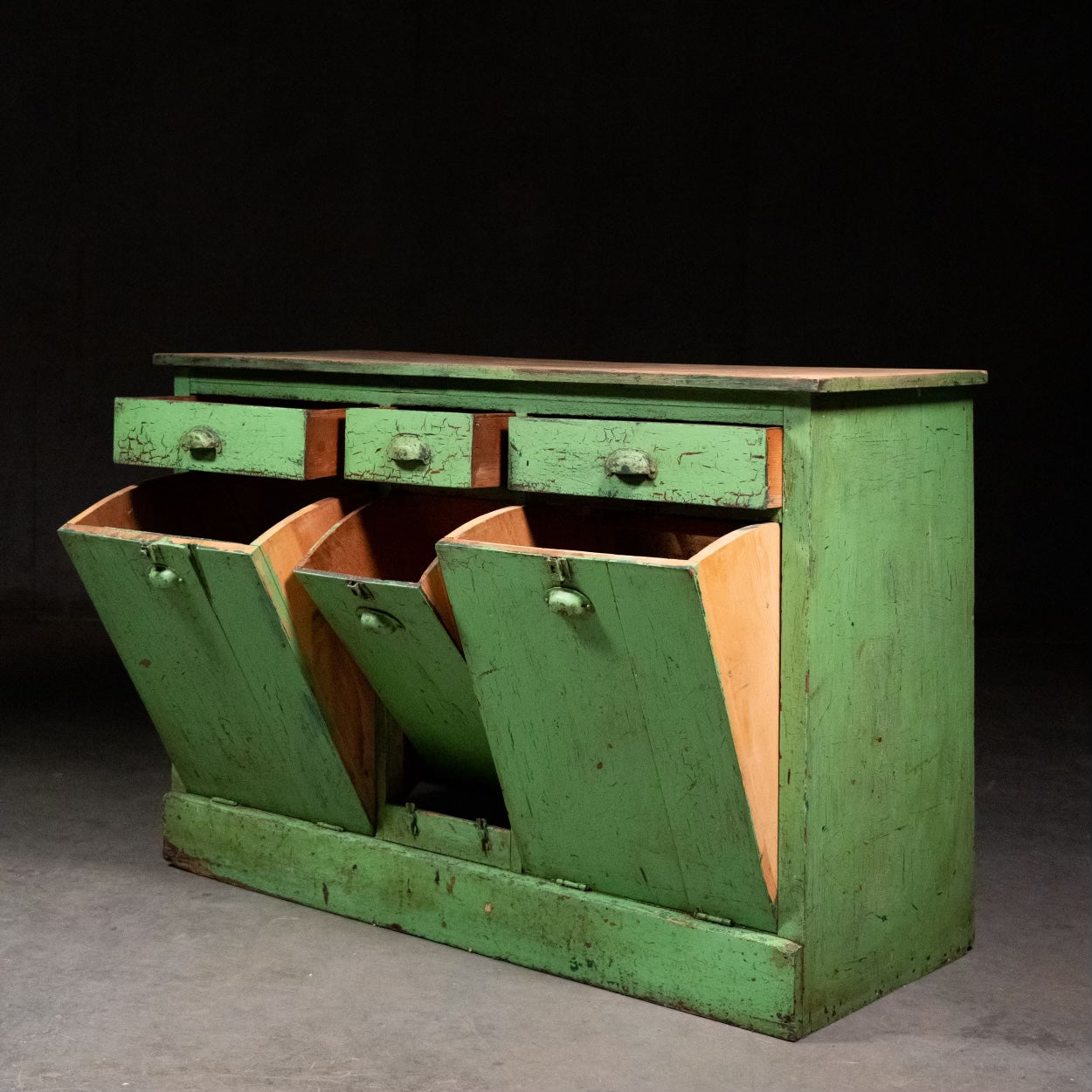 A simple cabinet , local to BC in perfect old paint with three bins and working drawers .. built in the first quarter of the 20th century this piece retains all components and is all original . Working sideboard.