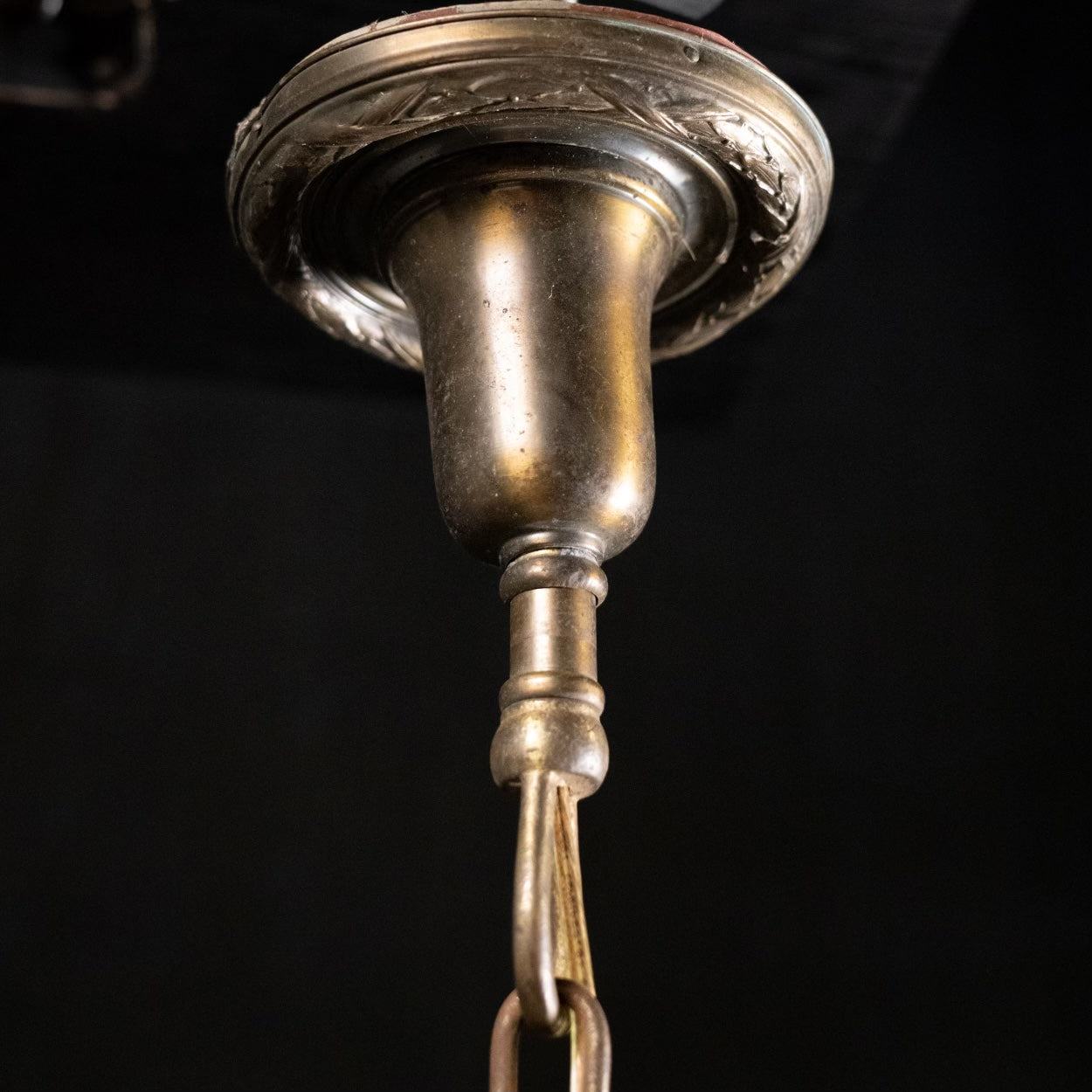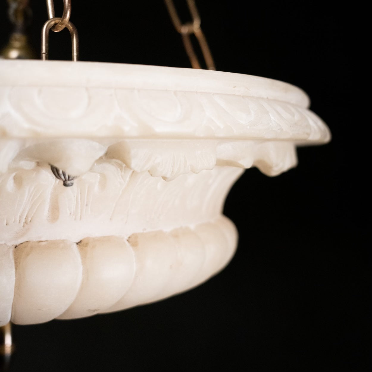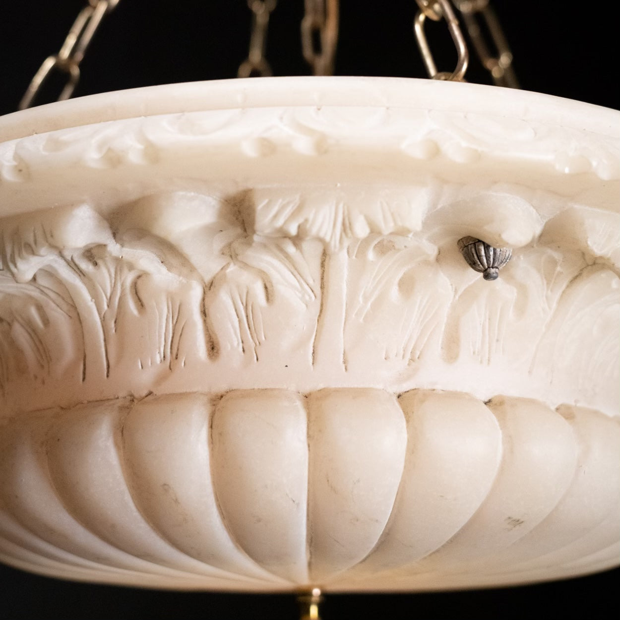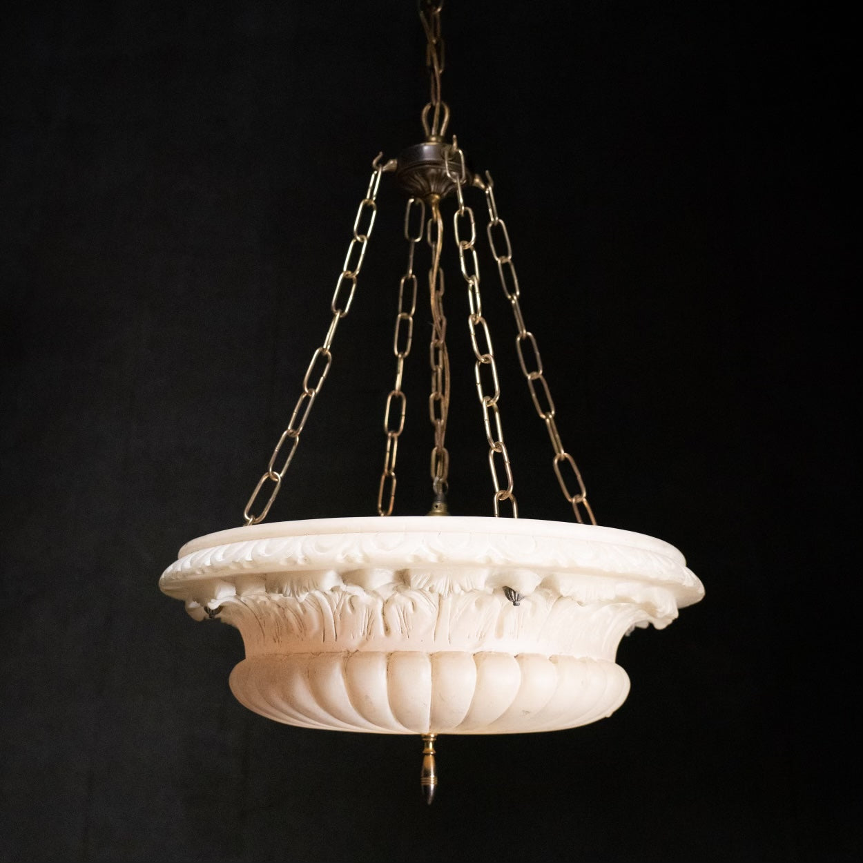 Elegant pendant shaped carved alabaster light fixture with brass hardware. Recently re-wired and ready to install. We can adjust the the chain measurement to buyers specification. Found in Vancouver heritage home in the 1960’s. CSA approved.