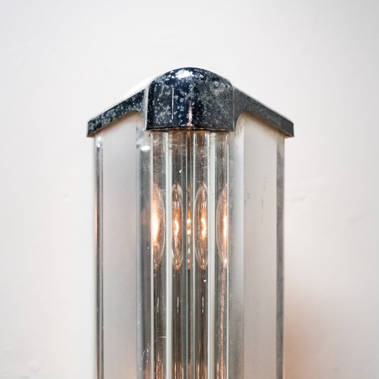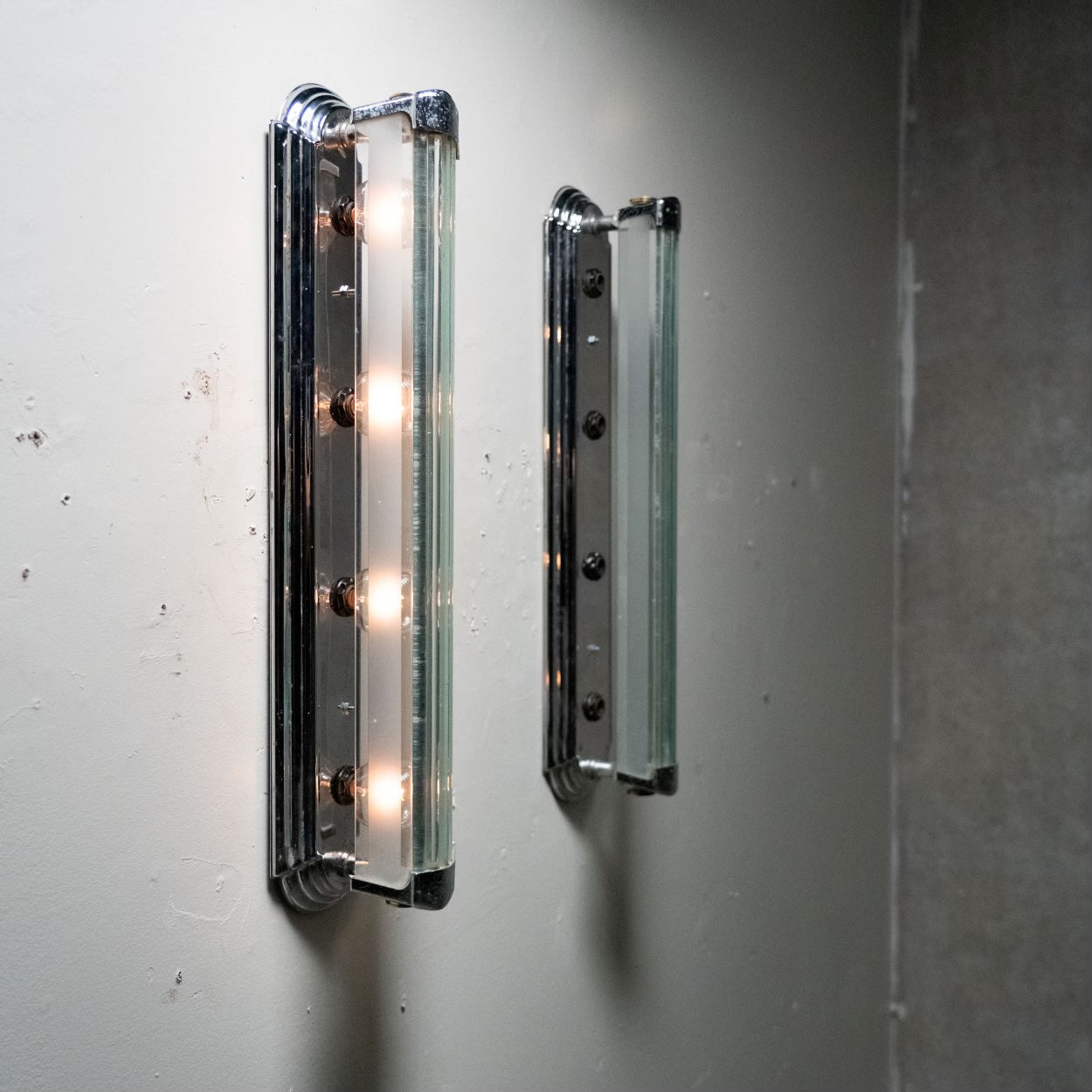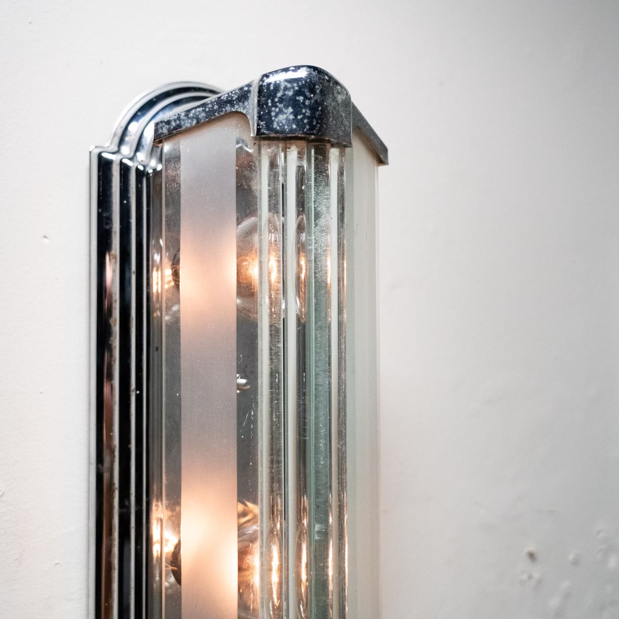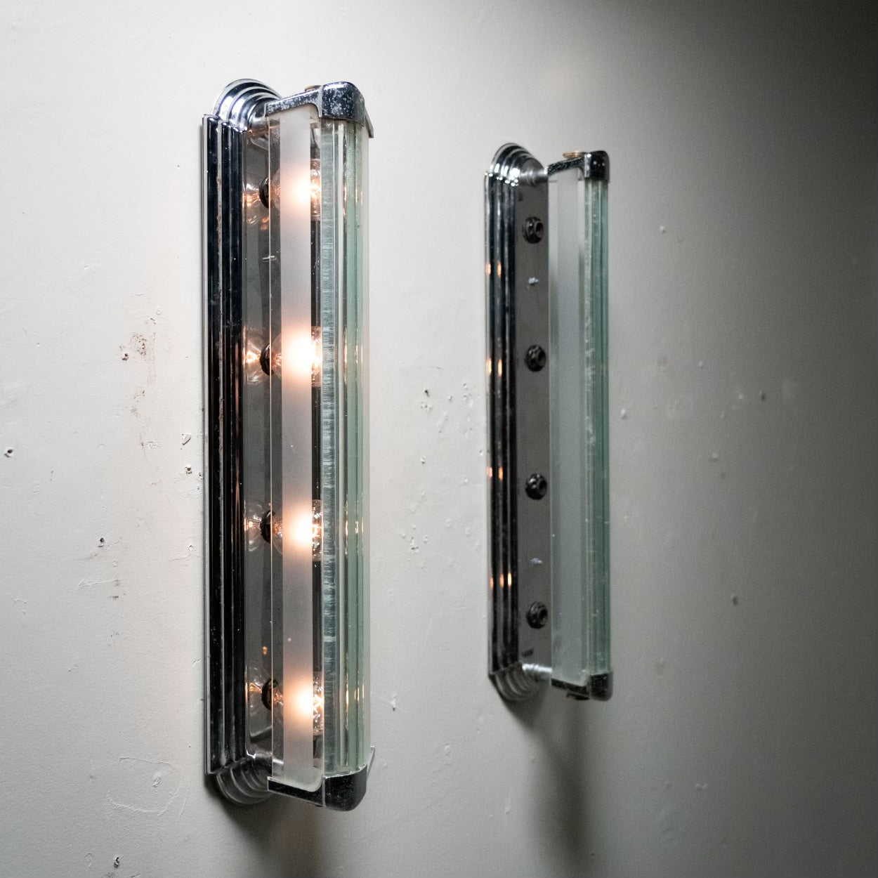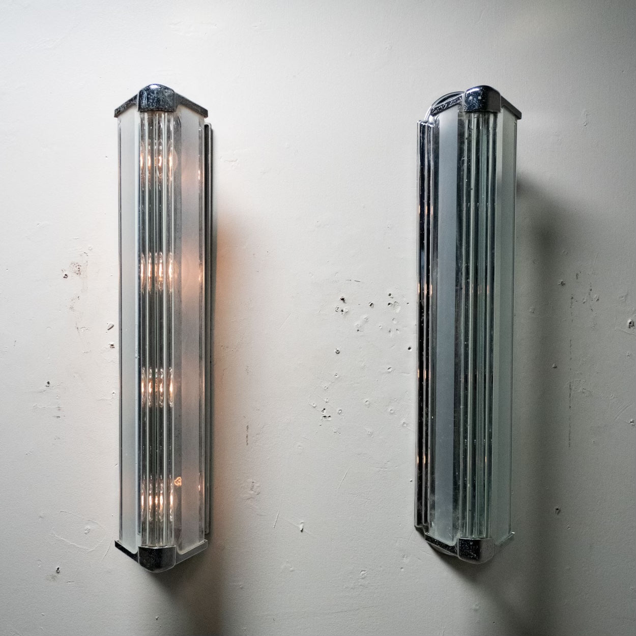 Sold as a pair, nice rare sconce lights with glass rod reflectors with worn chrome finish . Lights were salvaged in Pittsburgh and have been rewired and tested.