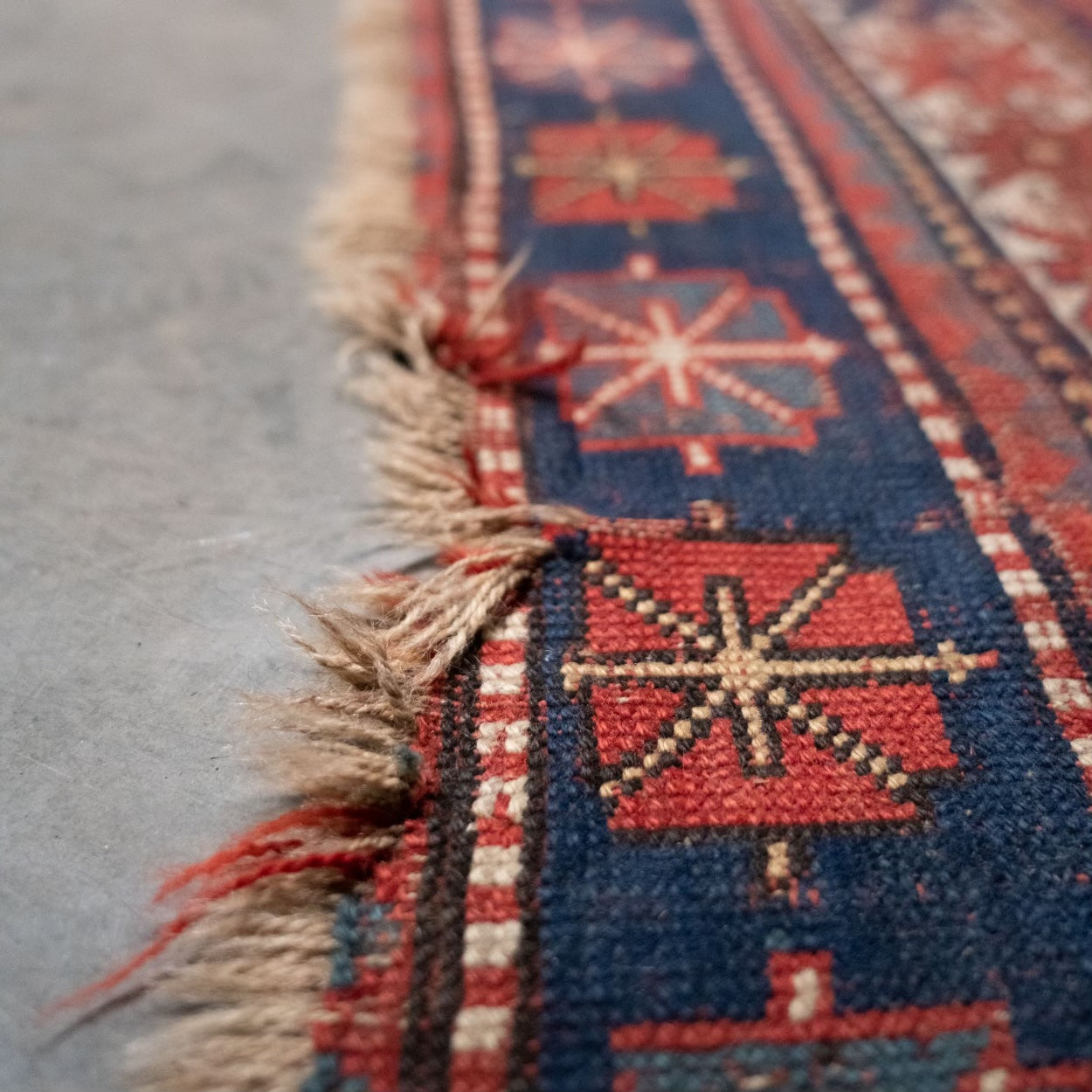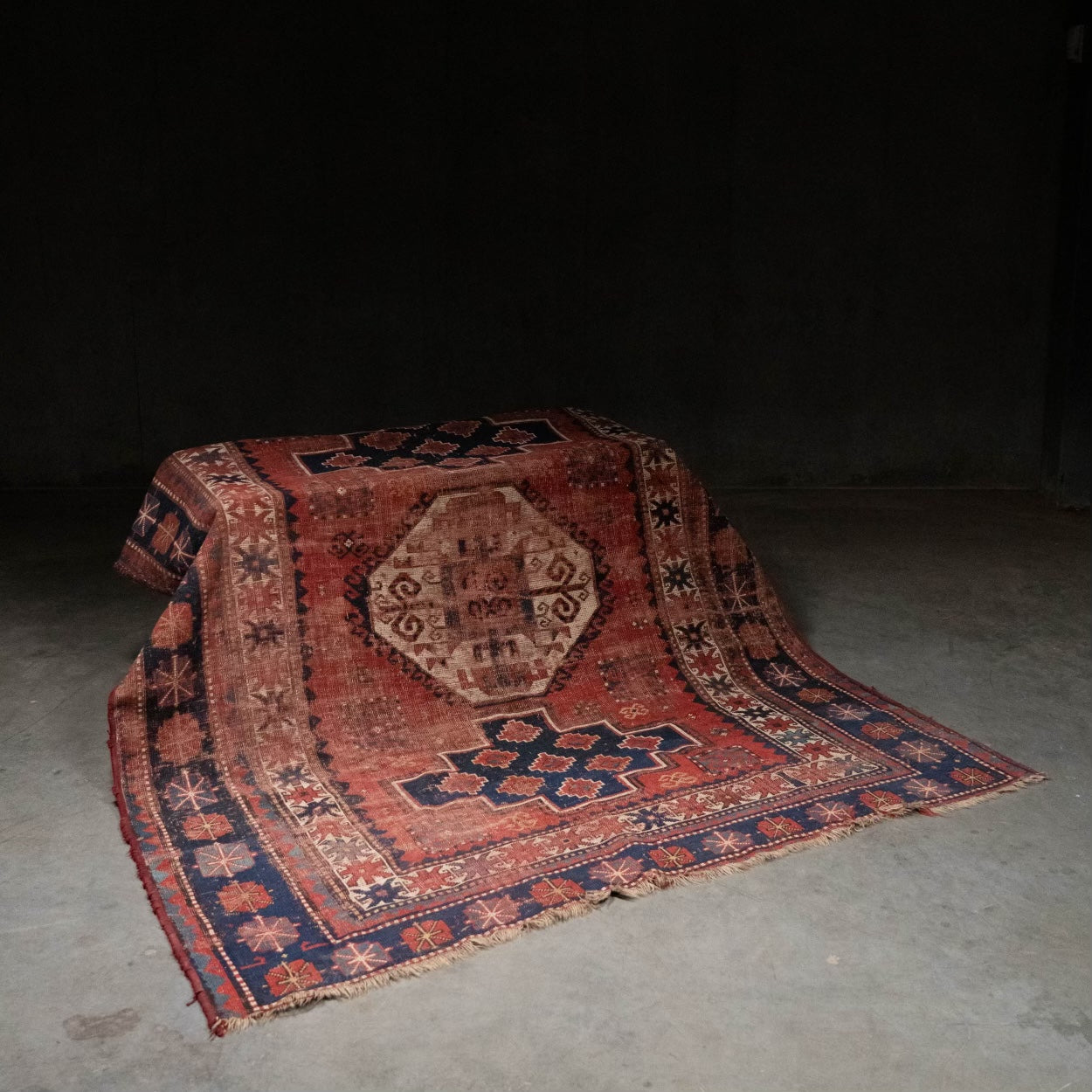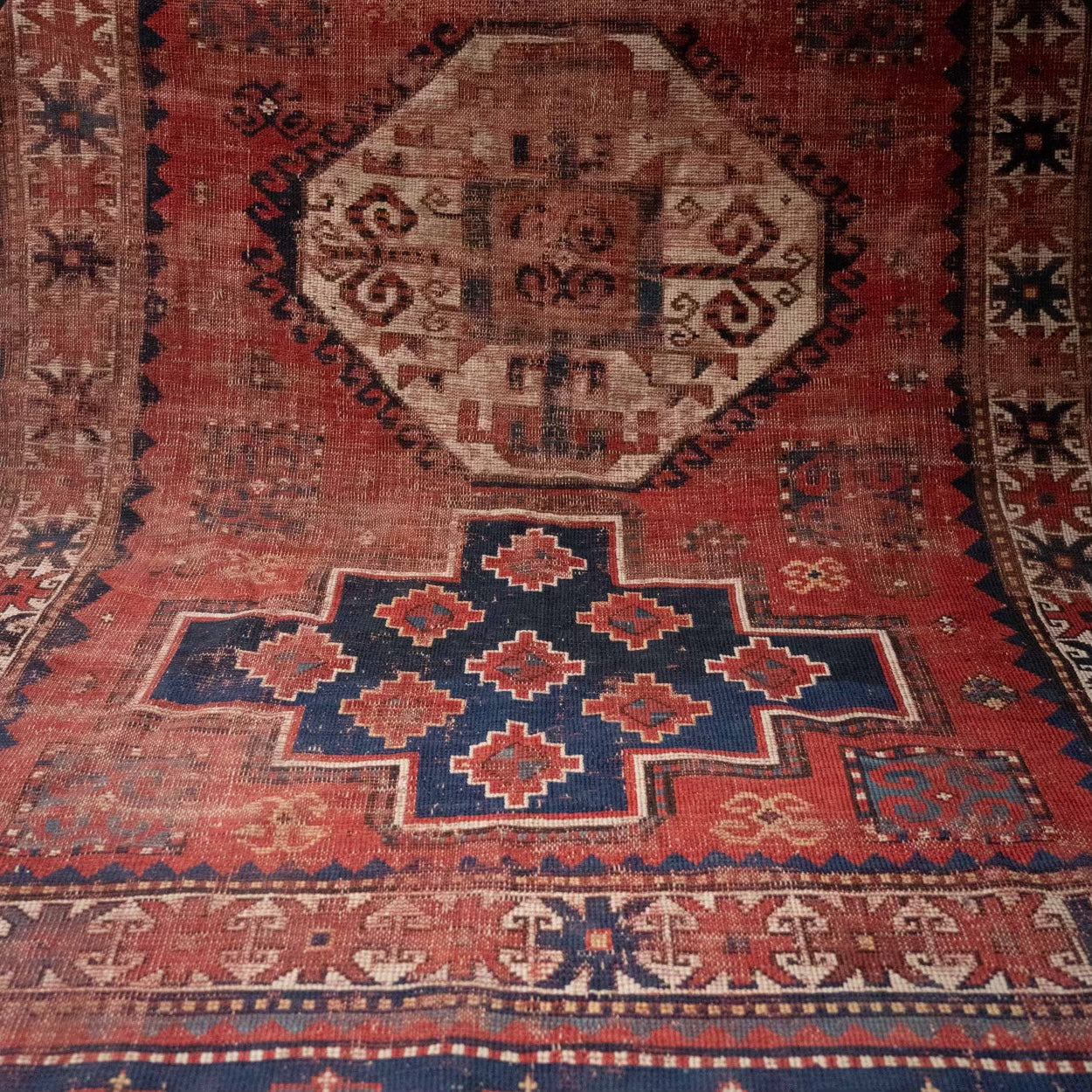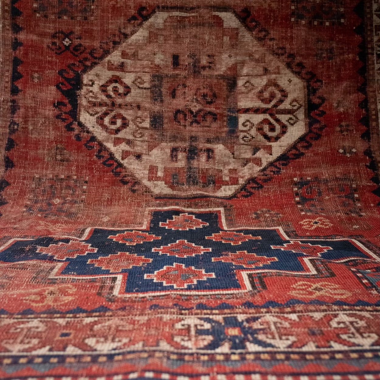 A well used authentic antique rug showing perfect wear and colors .. a great one