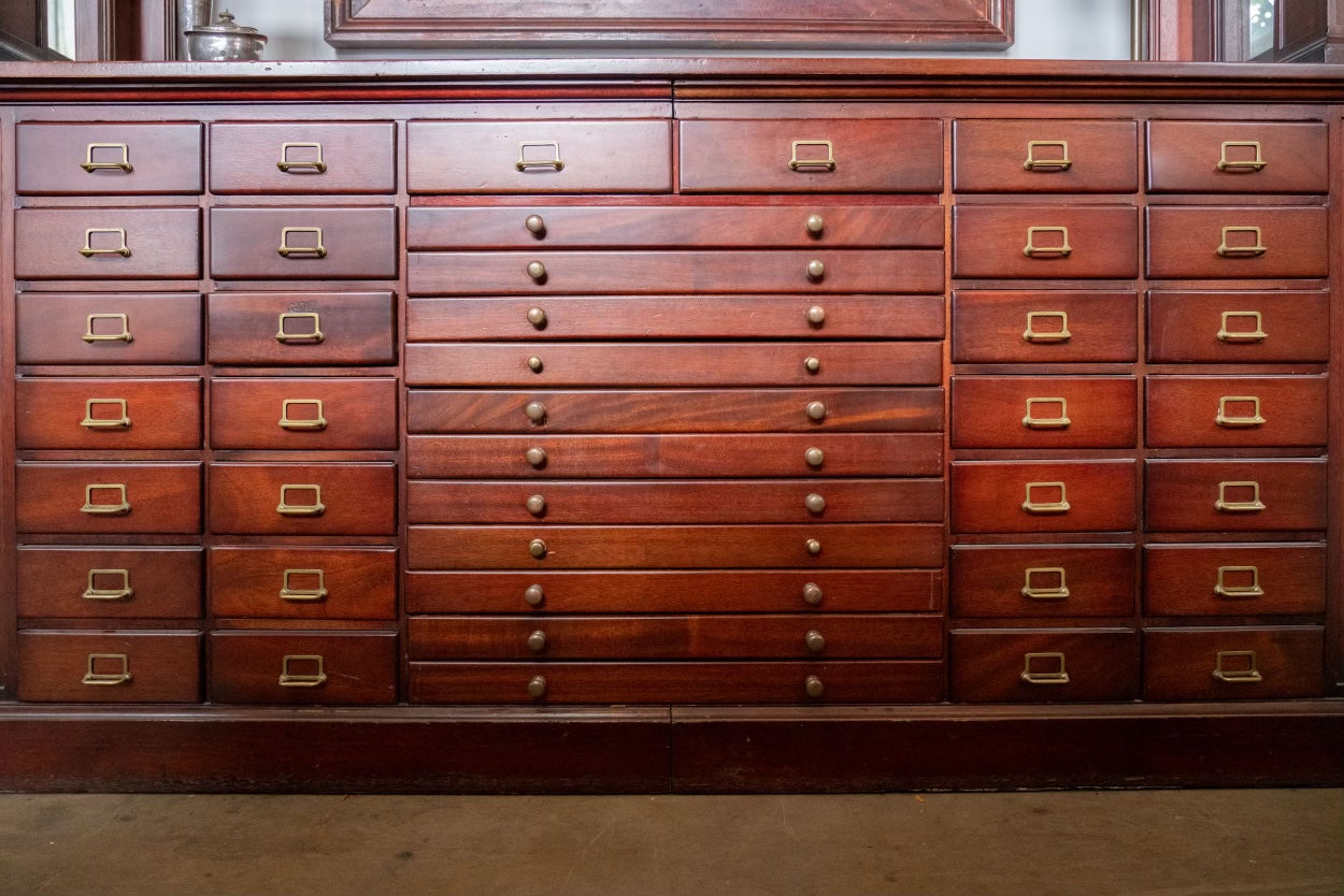A fantastic preserved example of an old multi drawer pharmacy cabinet , made of solid mahogany. Brass details .< adjustable multi glass shelves and properly made for easy install. Cabinet was acquired from an eye glass head office where it has been in use for 30 +years. A great example of a rare piece that would be an excellent back bar or library cabinet.