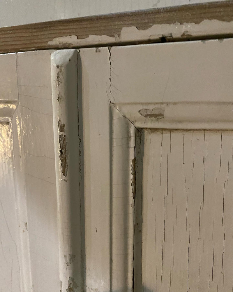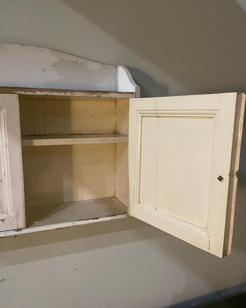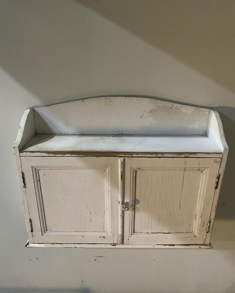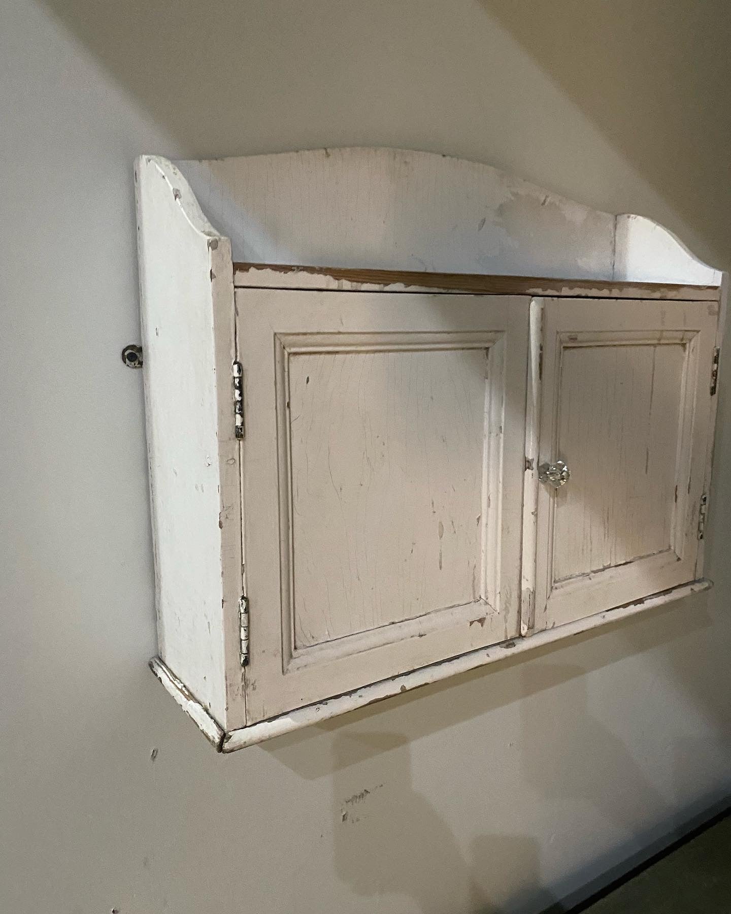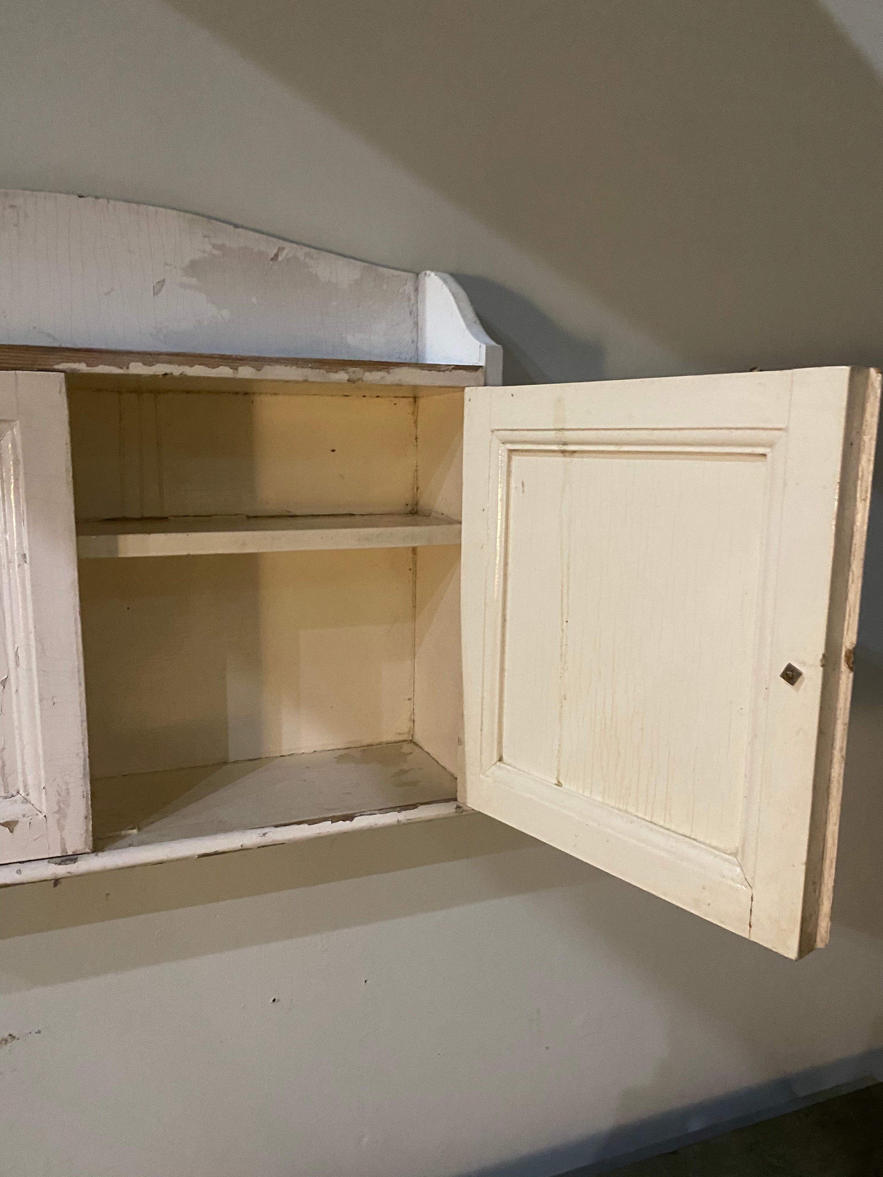 A beautiful detailed little cabinet, with panelled doors, scalloped detail top, strong age cracked paint with brass hardware and glass knob. A very nice example of simple country crafted millwork. A survivor over 100 years old. Found in Bc .