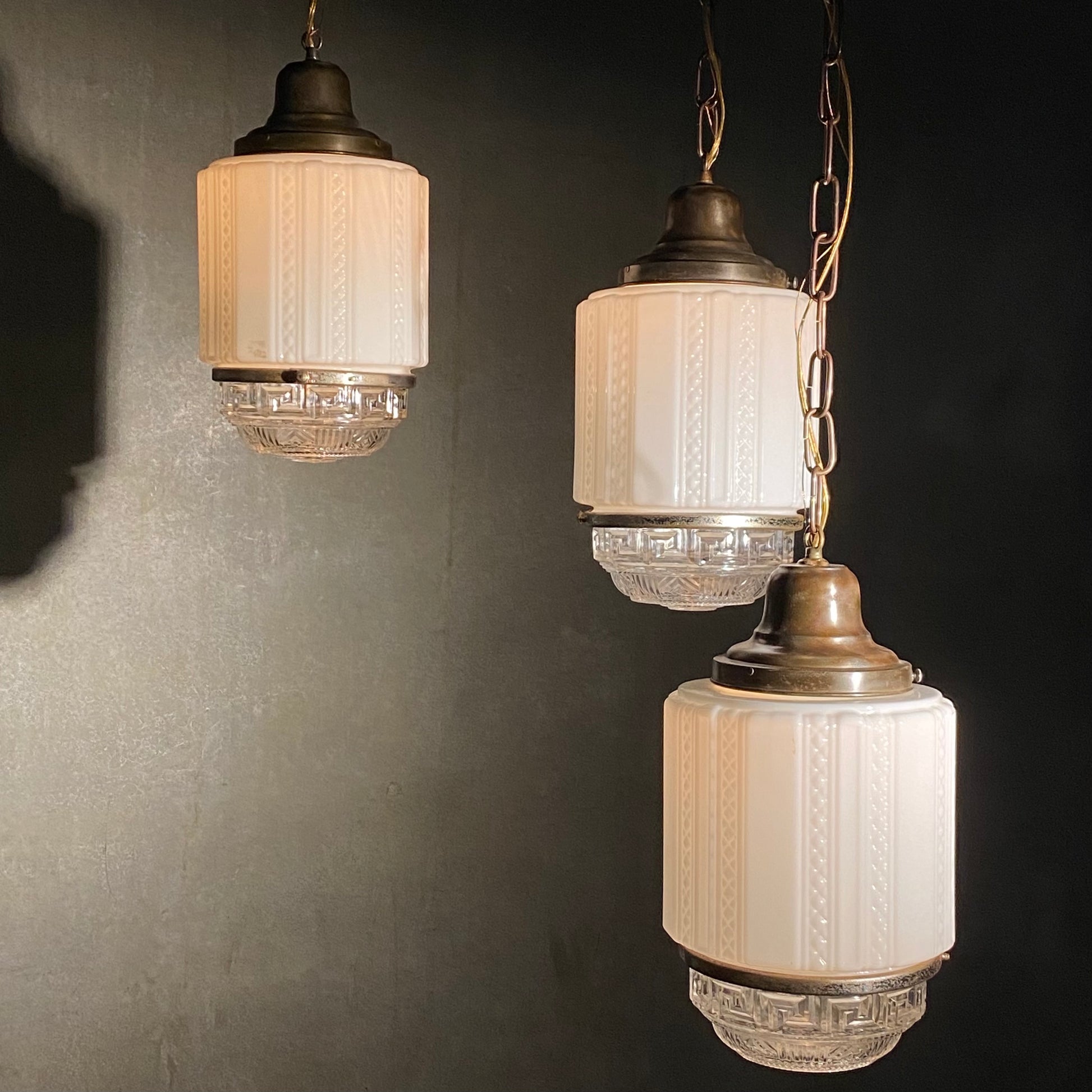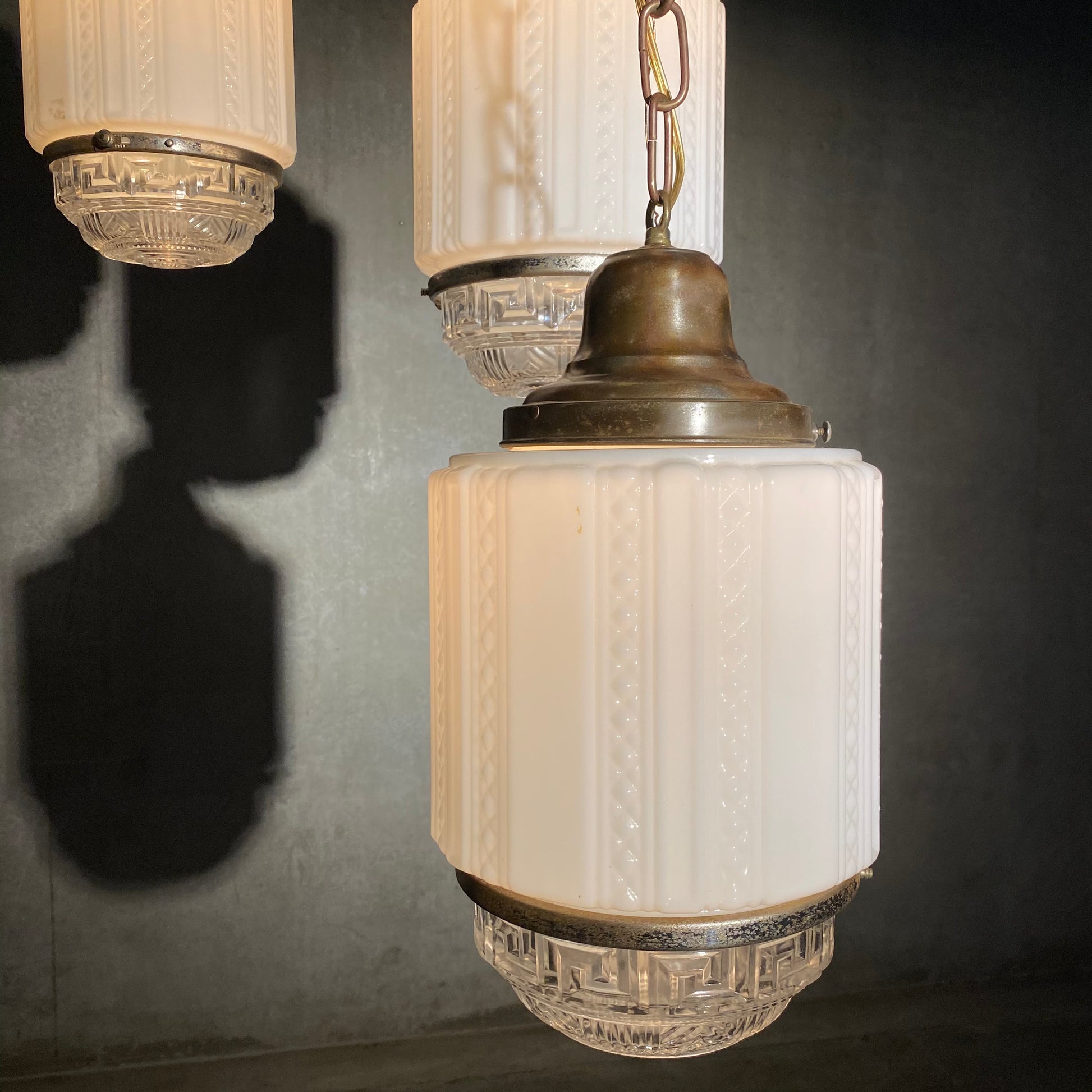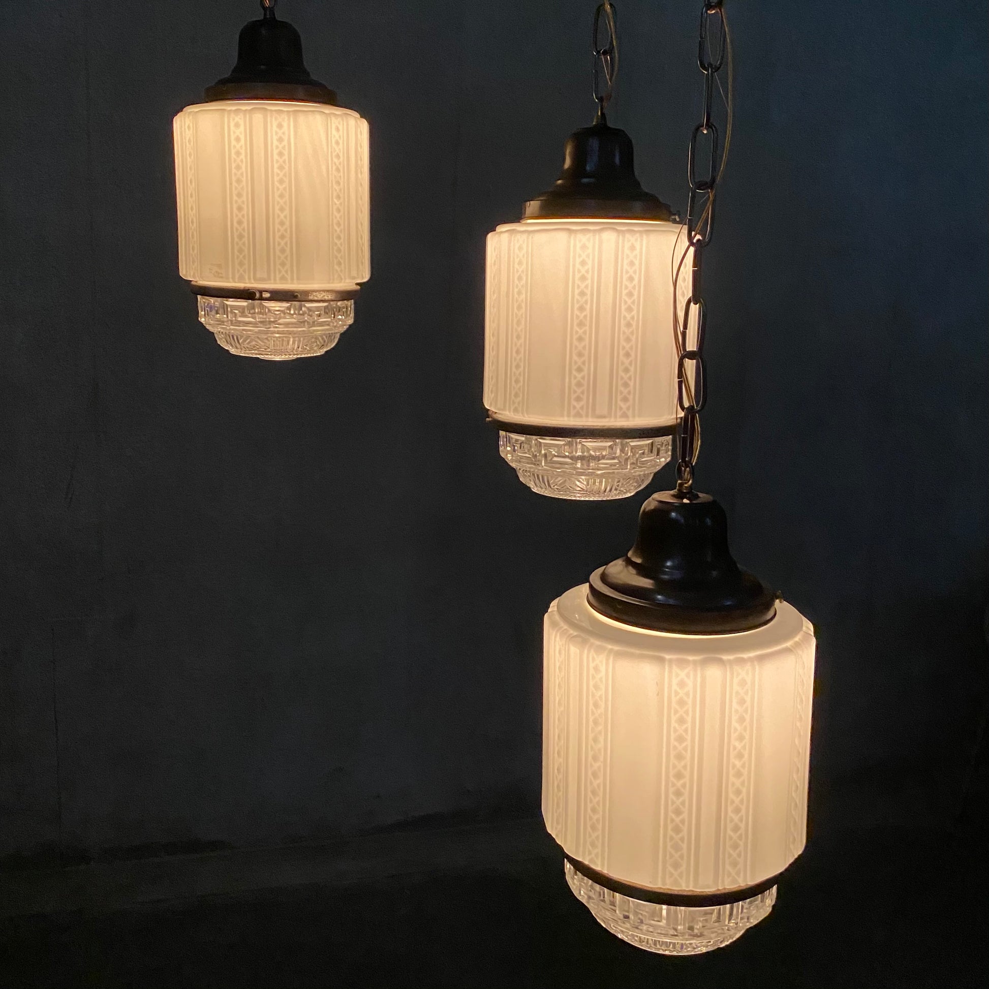 Set of 3 Original Skyscraper Pendant Lights salvaged from a bank in St. Louis.