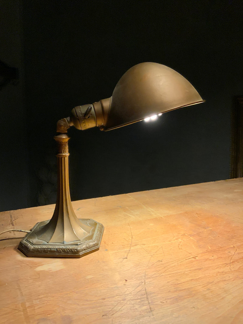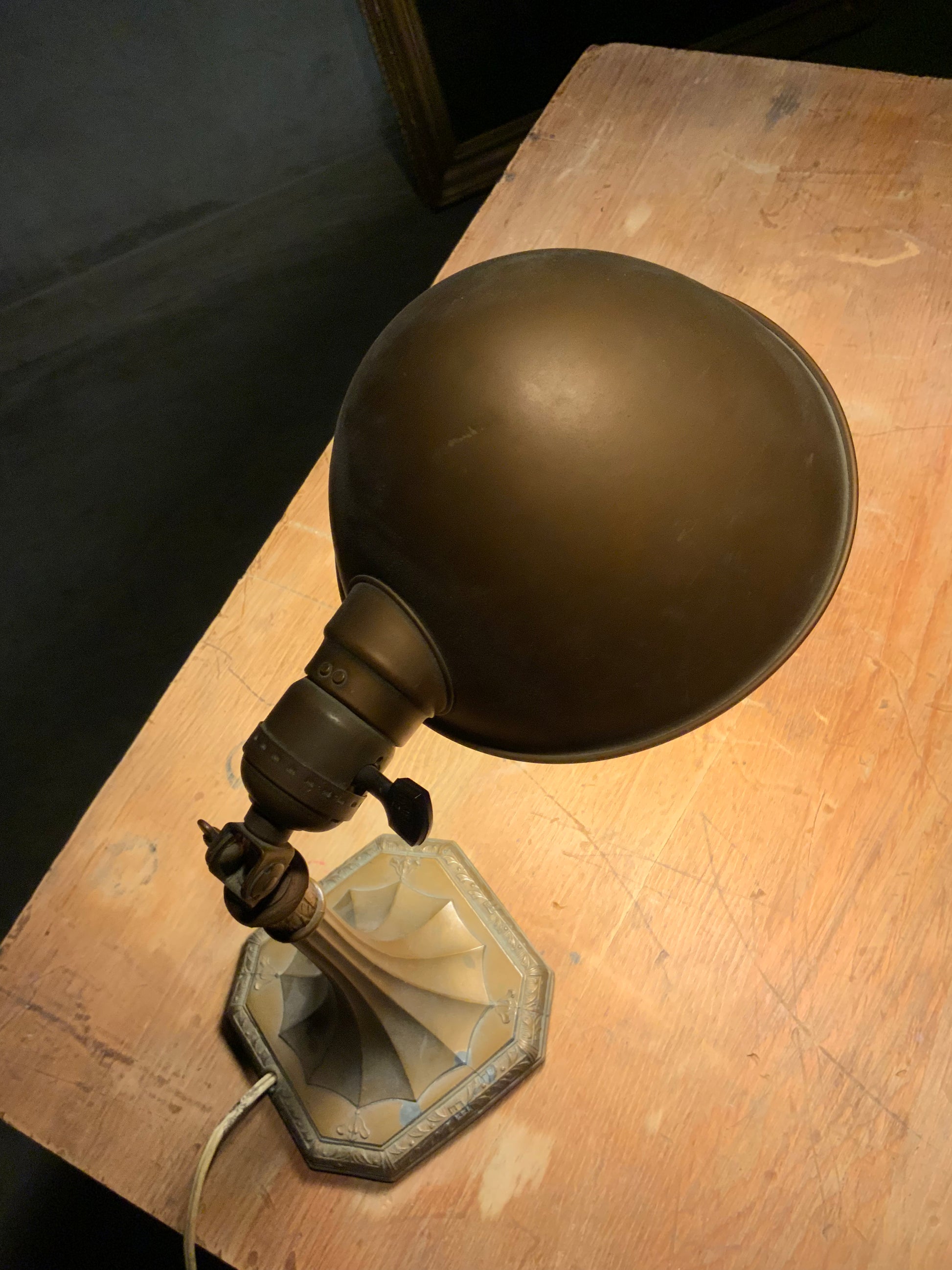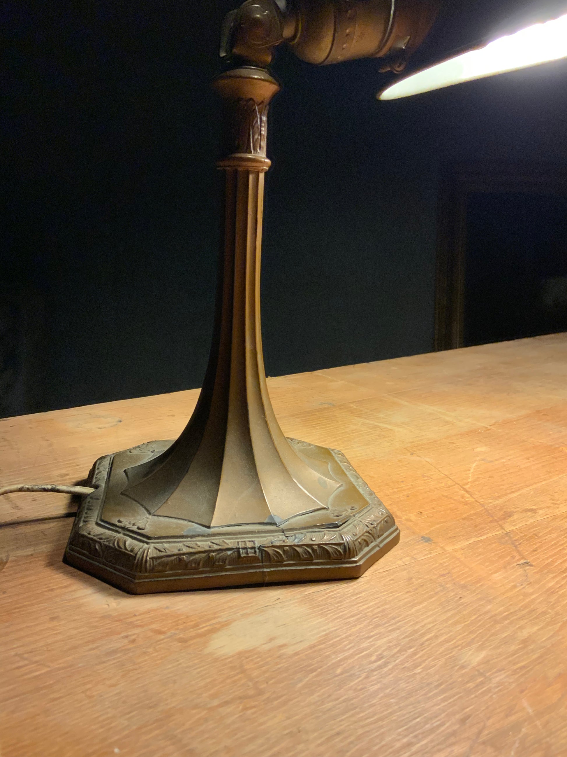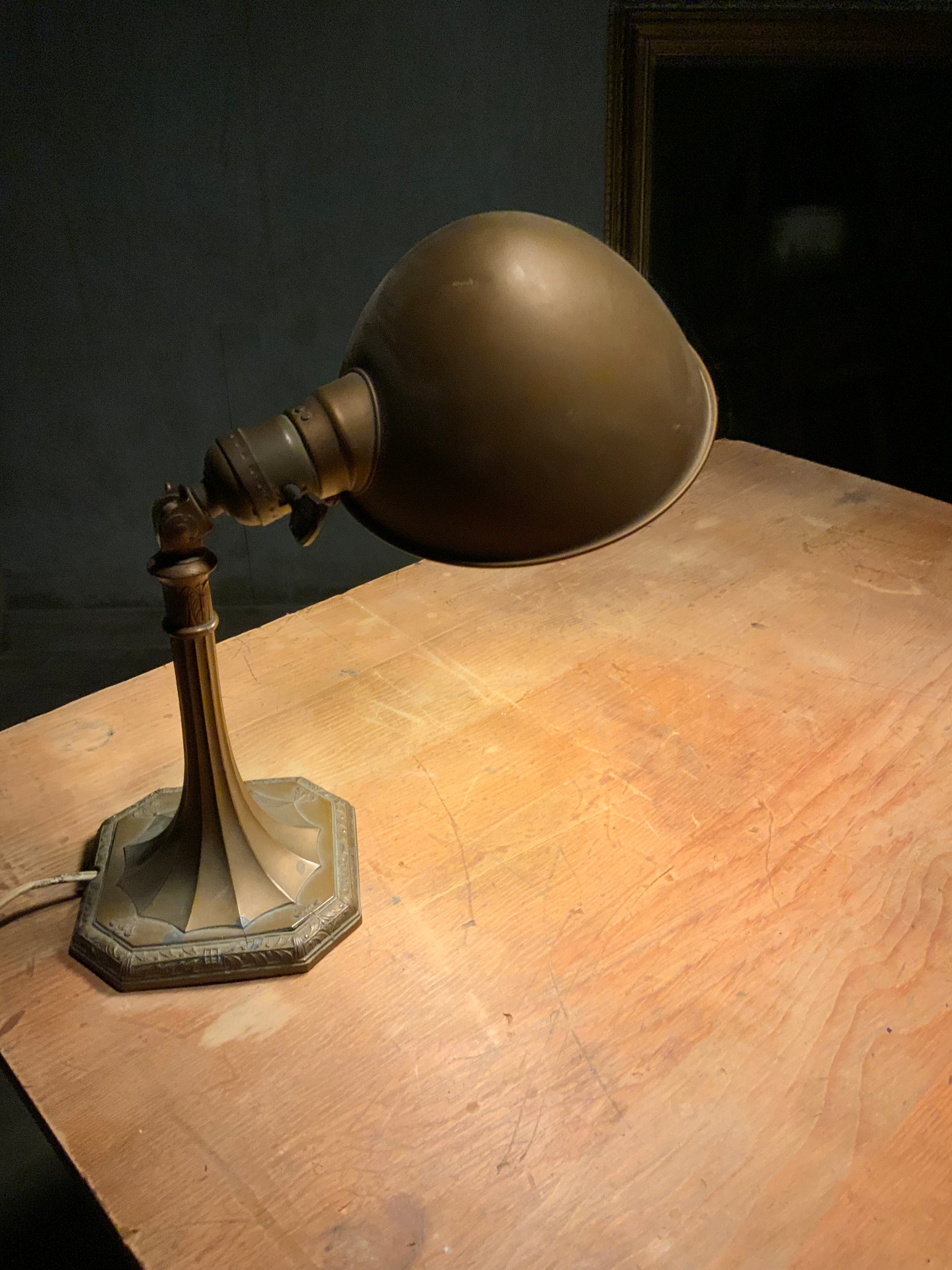 A very simple but well designed desk lamp in great patina. Functional as well as a very cool find. Possibly made by Bradley- Hubbard.