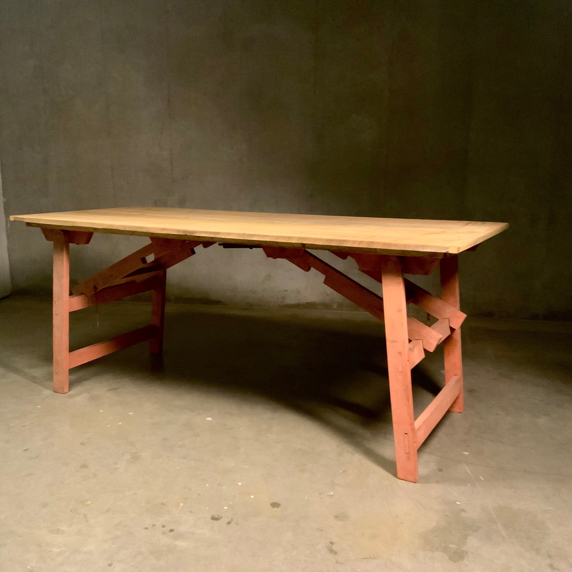 Excellent soft salmon colour on this original folding table , for easy storage as well, as on the spot usage .. top has been restored using reclaimed wood . Excellent craftsmanship with mortise ten on construction .