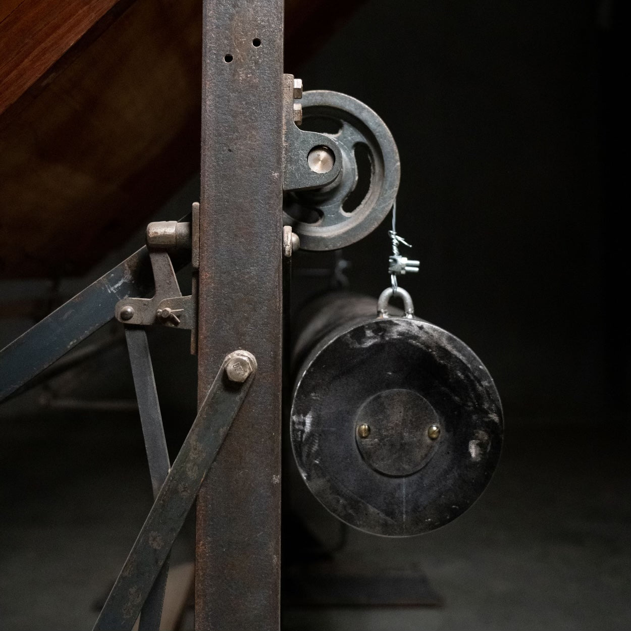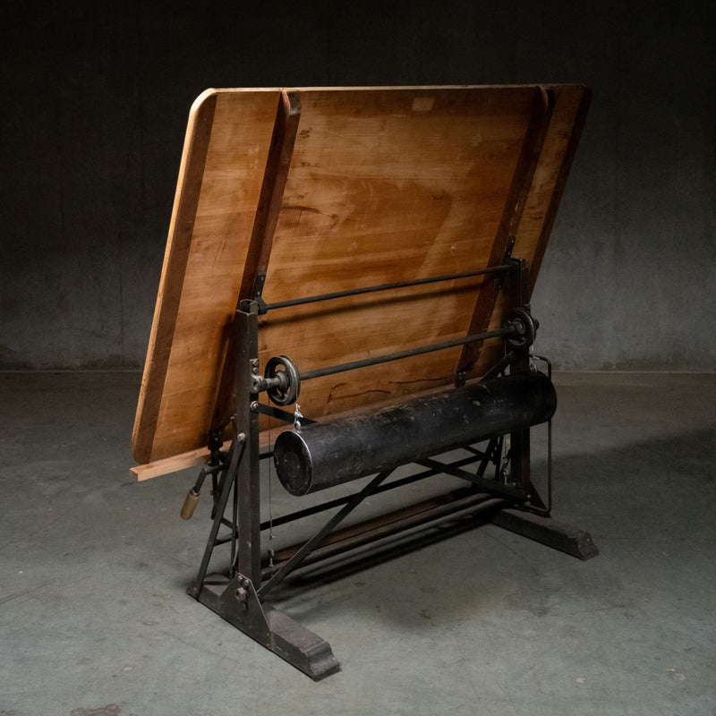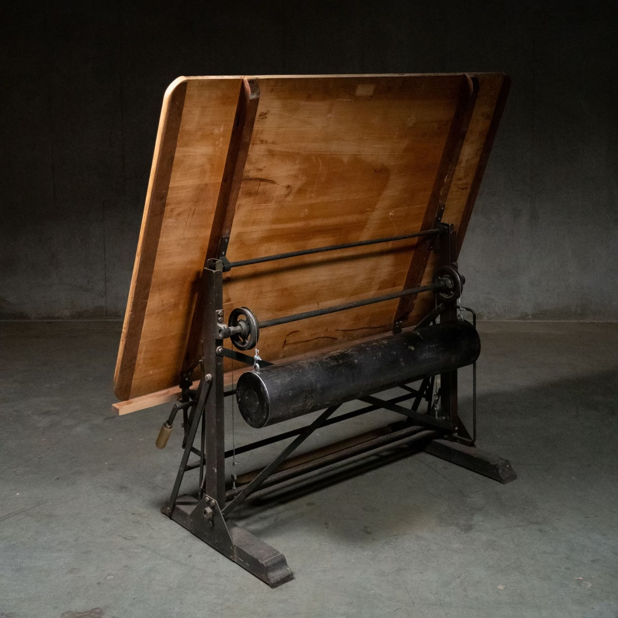 A very rare counter weight adjustable drafting table from France in old finish nicely aged patina wood top. A French Industrial style mechanical architect's drafting table with original metal base and large solid pine original top. The platform is fully modular, using the wood pedal on the front it is possible to raise and lower the top and it may be tilted to any angle, from flat to vertical. The wood drawing surface has an nice patina with some old ink marks and there is a large wood trough for holding pencils and ink. The mechanism is in excellent condition and functions smoothly with a large heavy cylinder weight. Note: this weight will be removed for shipping. A heavy, sturdy, functional table, in excellent condition.