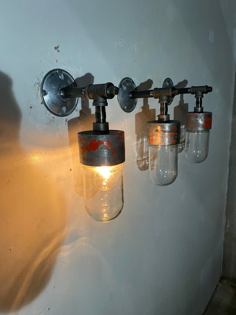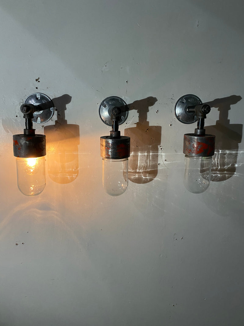 We have a set of 13 of these industrial sconces that were salvaged from an old crane. These are manufactured by Appleton Lighting co. & are very well made. Easy set up for install inside or out. CSA and rewiring complete.