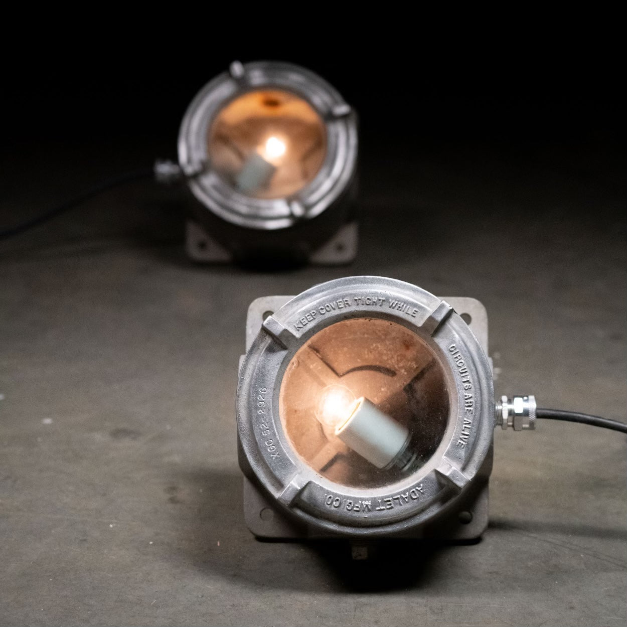 We got a pair of lights from a factory in the okanagan by Crouse hinds. These are rewired and plug in set up for easy mood lighting from the floor. Very rare and small for easy set up and use.