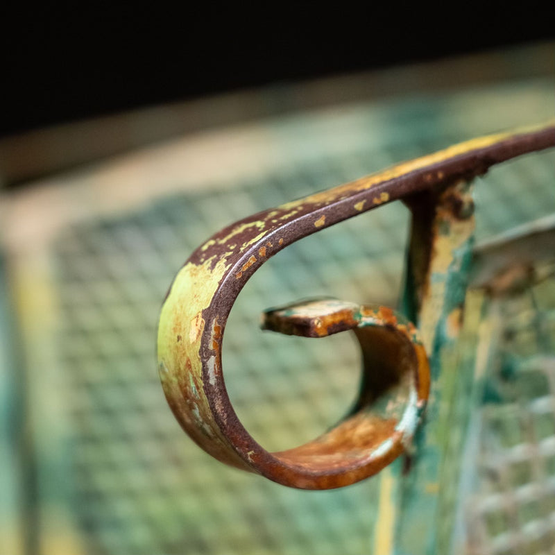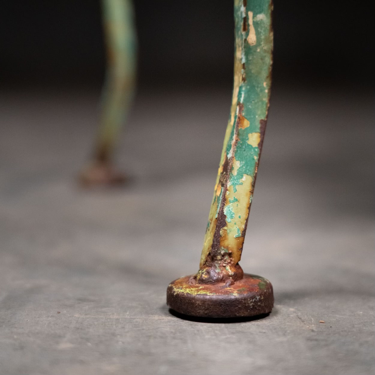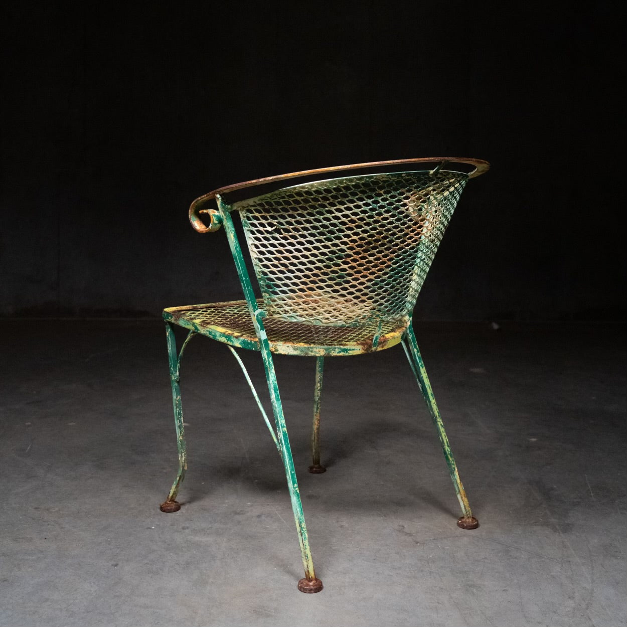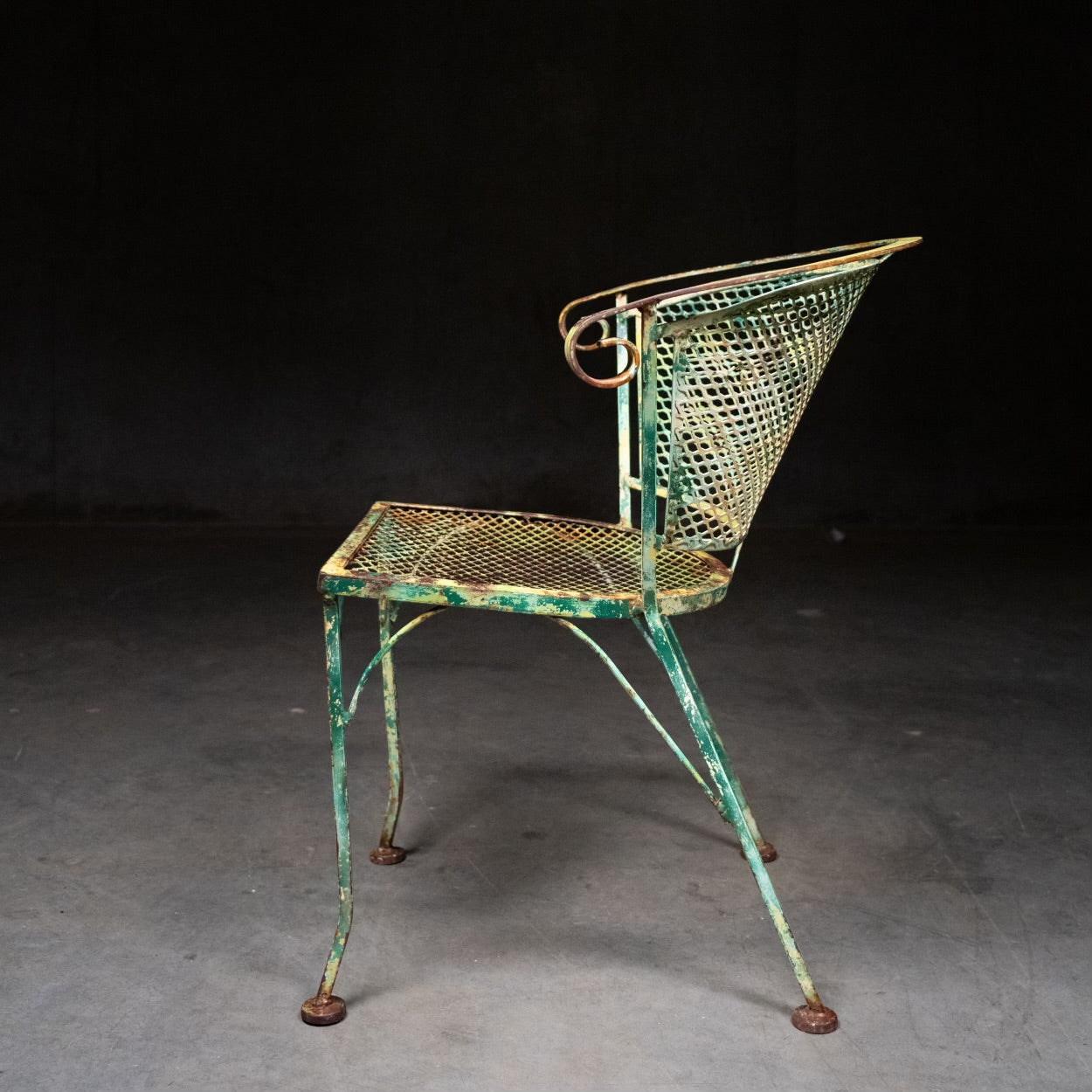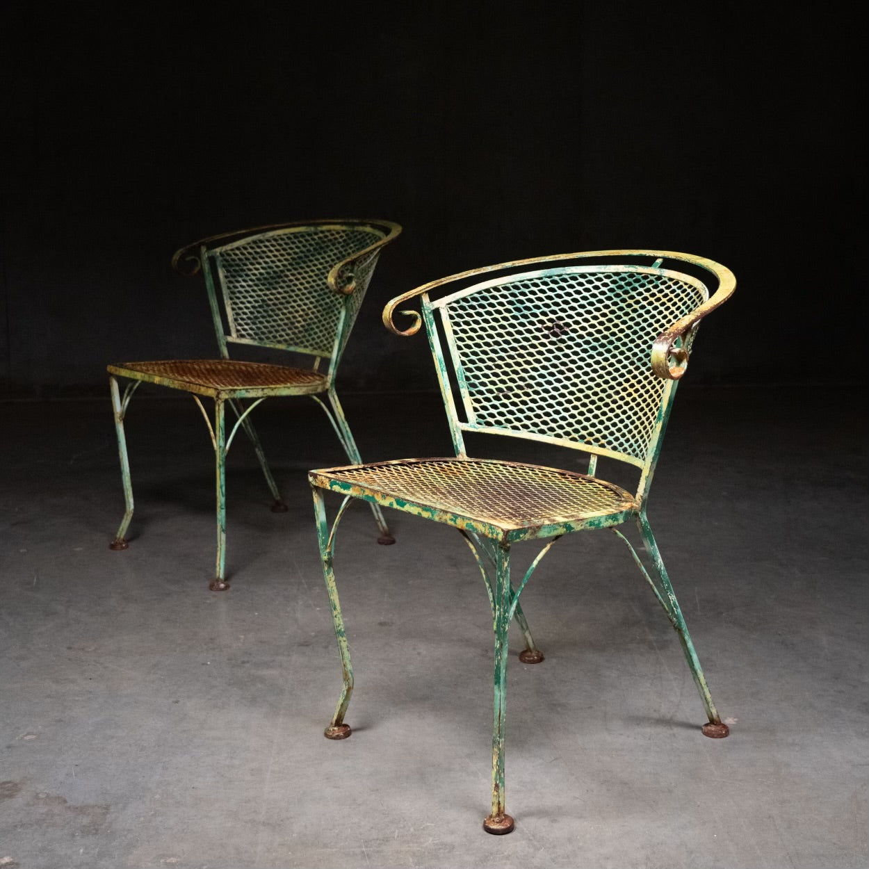 Pair of perfect polychrome painted SALTERINI garden wrought iron chairs. A solid form comfortable and stylish …found in Texas. SOLD AS A SET OF 2 The postwar boom in prosperity and leisure time led to the expansion of homes in America to include patios, which needed to be furnished with stylish outdoor furniture. Launched in 1934, Salterini offered some of the most exquisite, high-end outdoor furniture of the mid-century period. While John B. Salterini designed ornate wrought-iron garden furniture for patios and lawns, he specifically sought to match the forms of indoor furniture and also advocated the use of his furniture indoors “because it brings into your home the freshness and gaiety of a flowery summer garden” (per his print advertisements