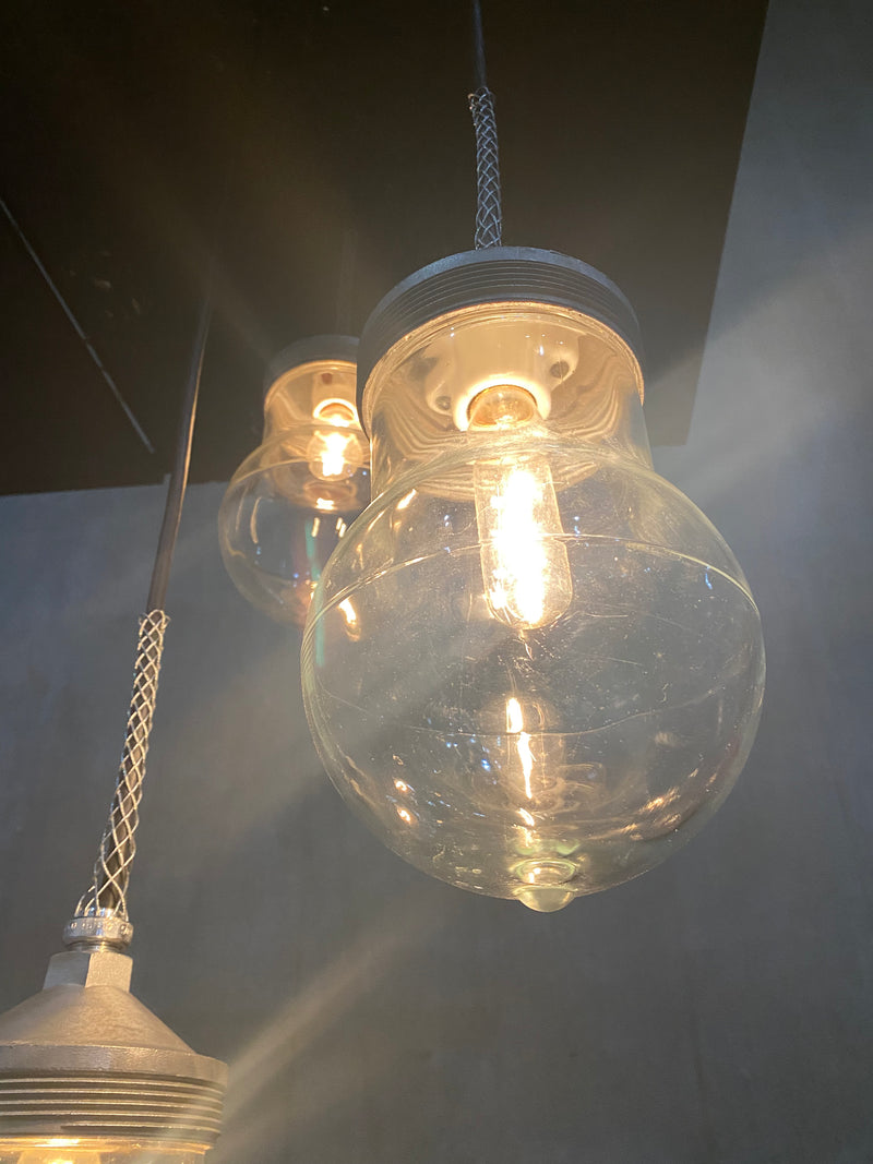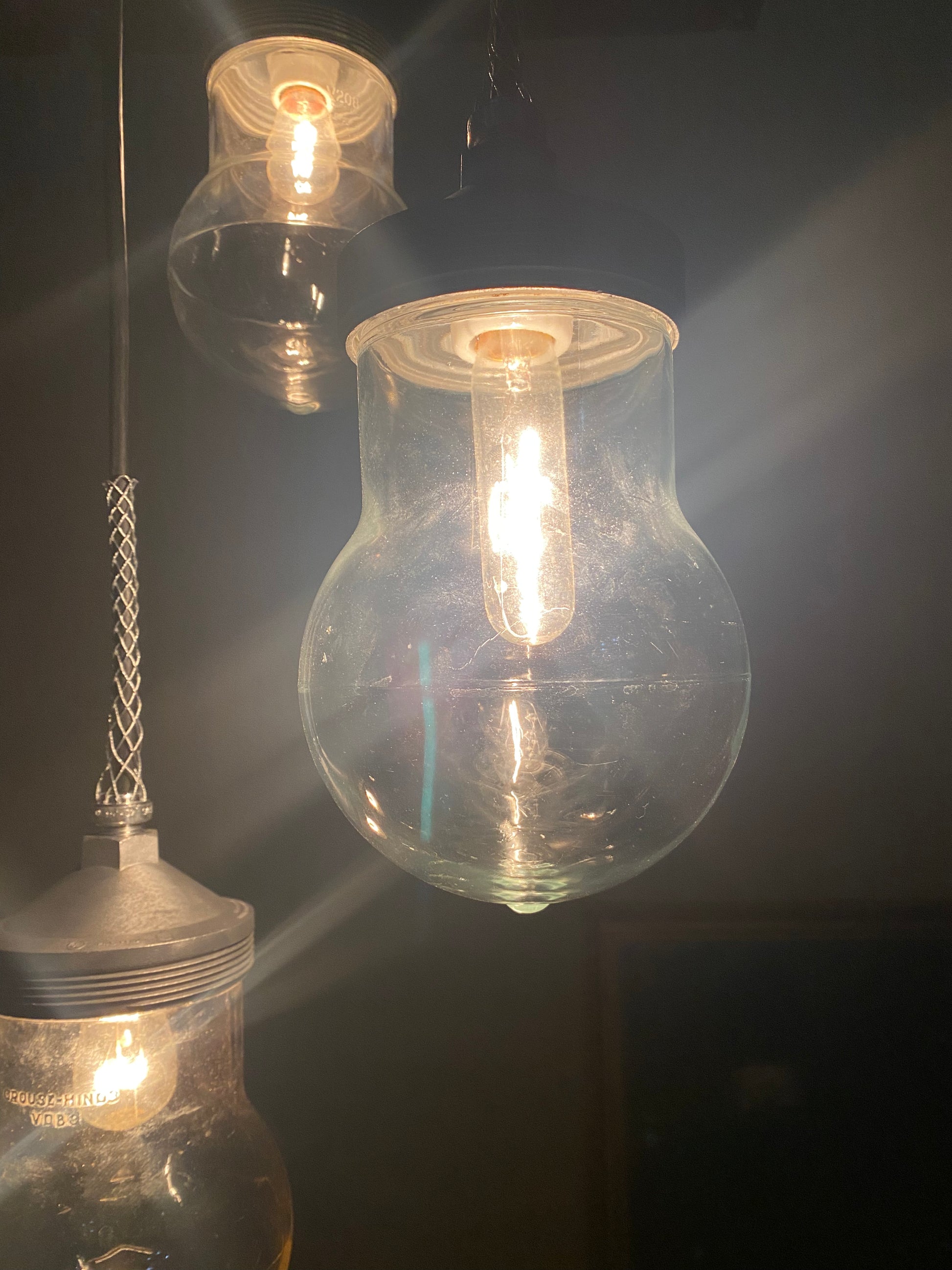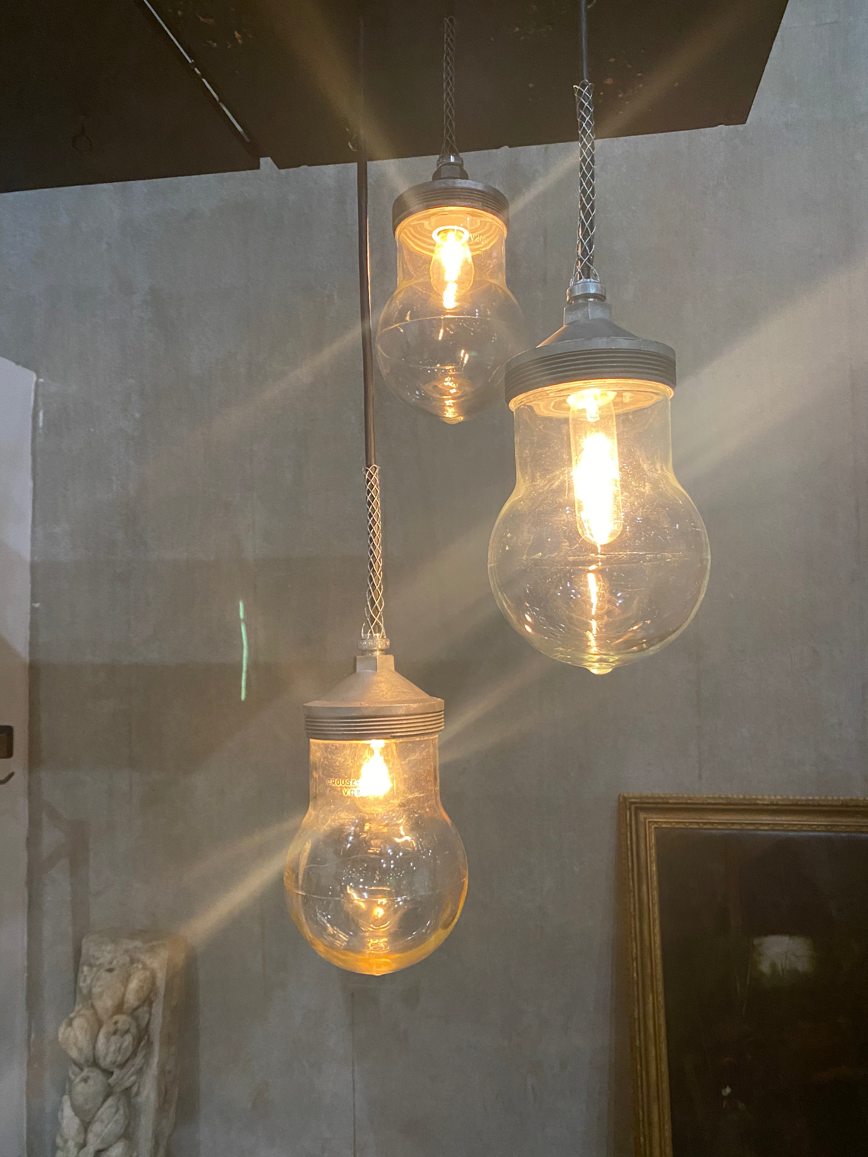 A nice set of industrial lights , with clear glass and aluminum fitter ..found in a building demo in Washington state. PRICE PER LIGHT