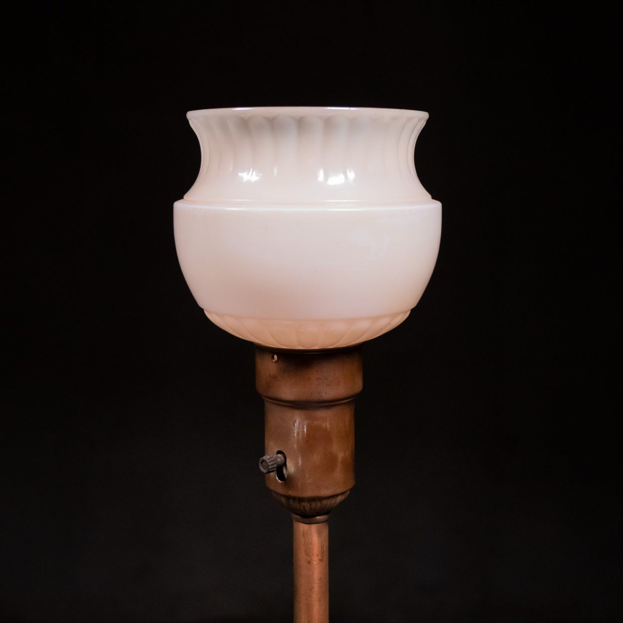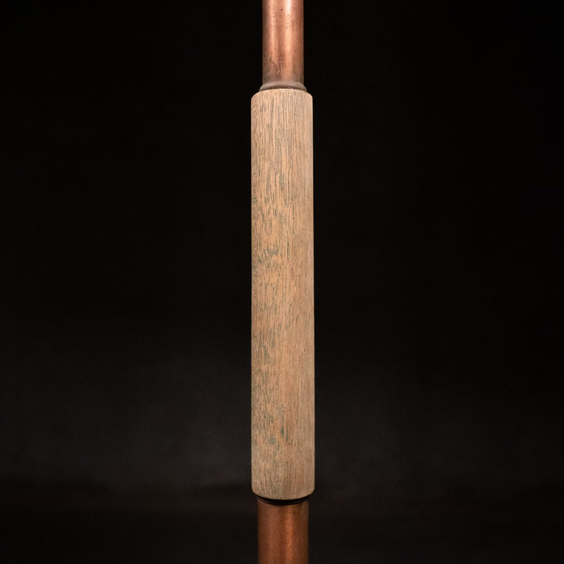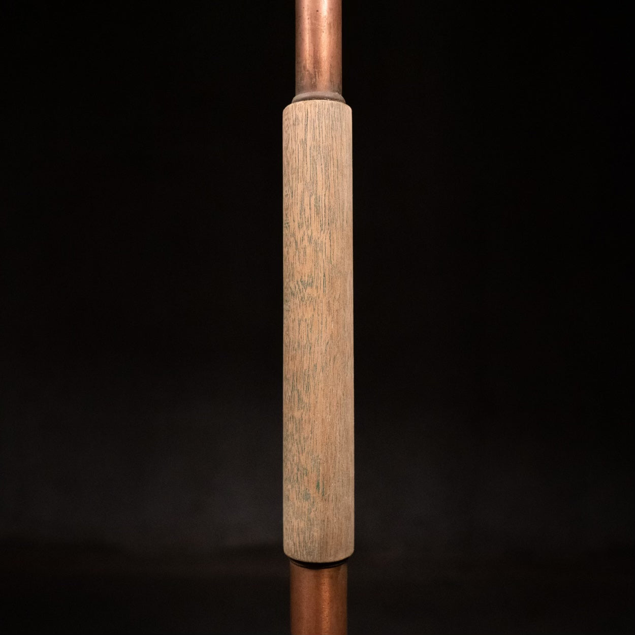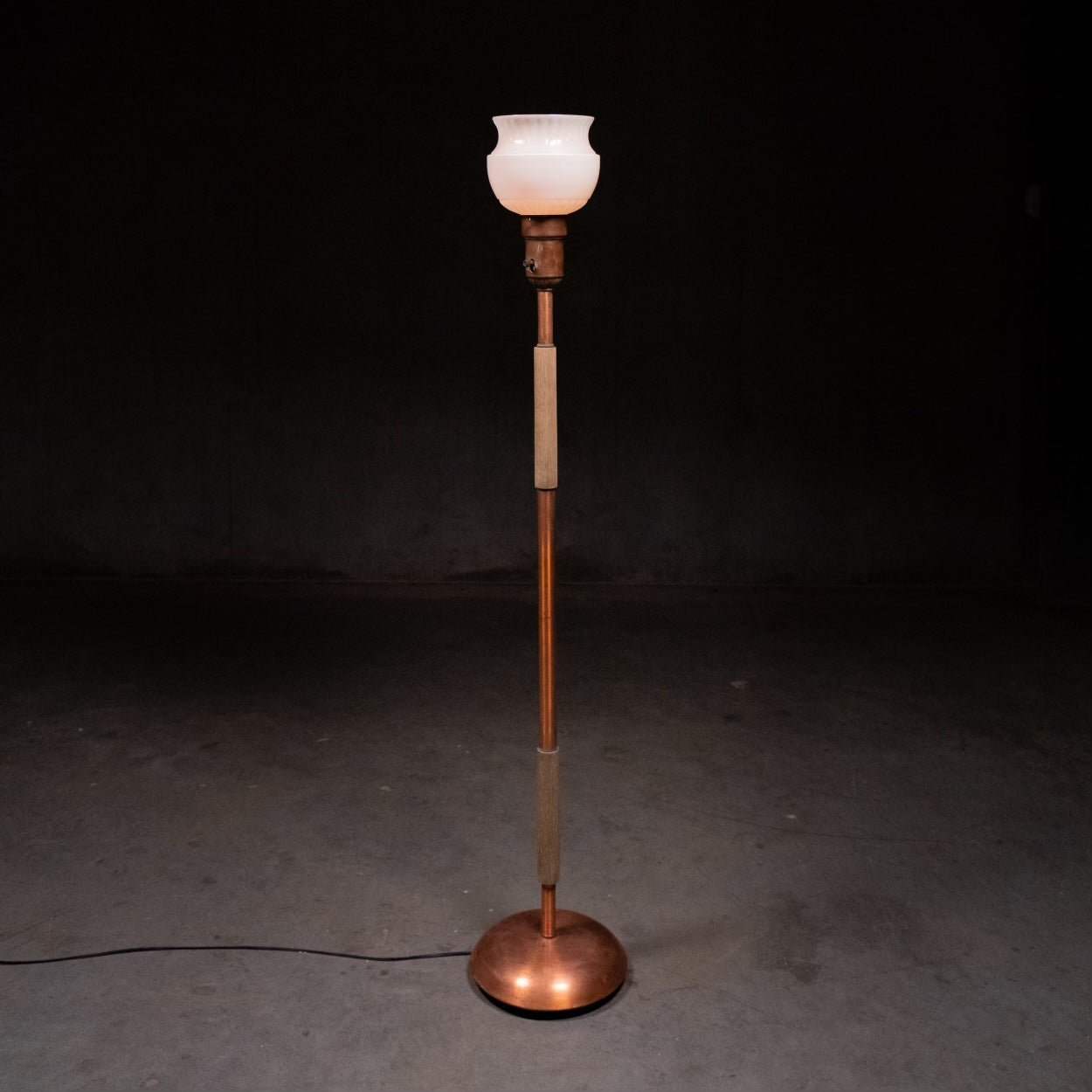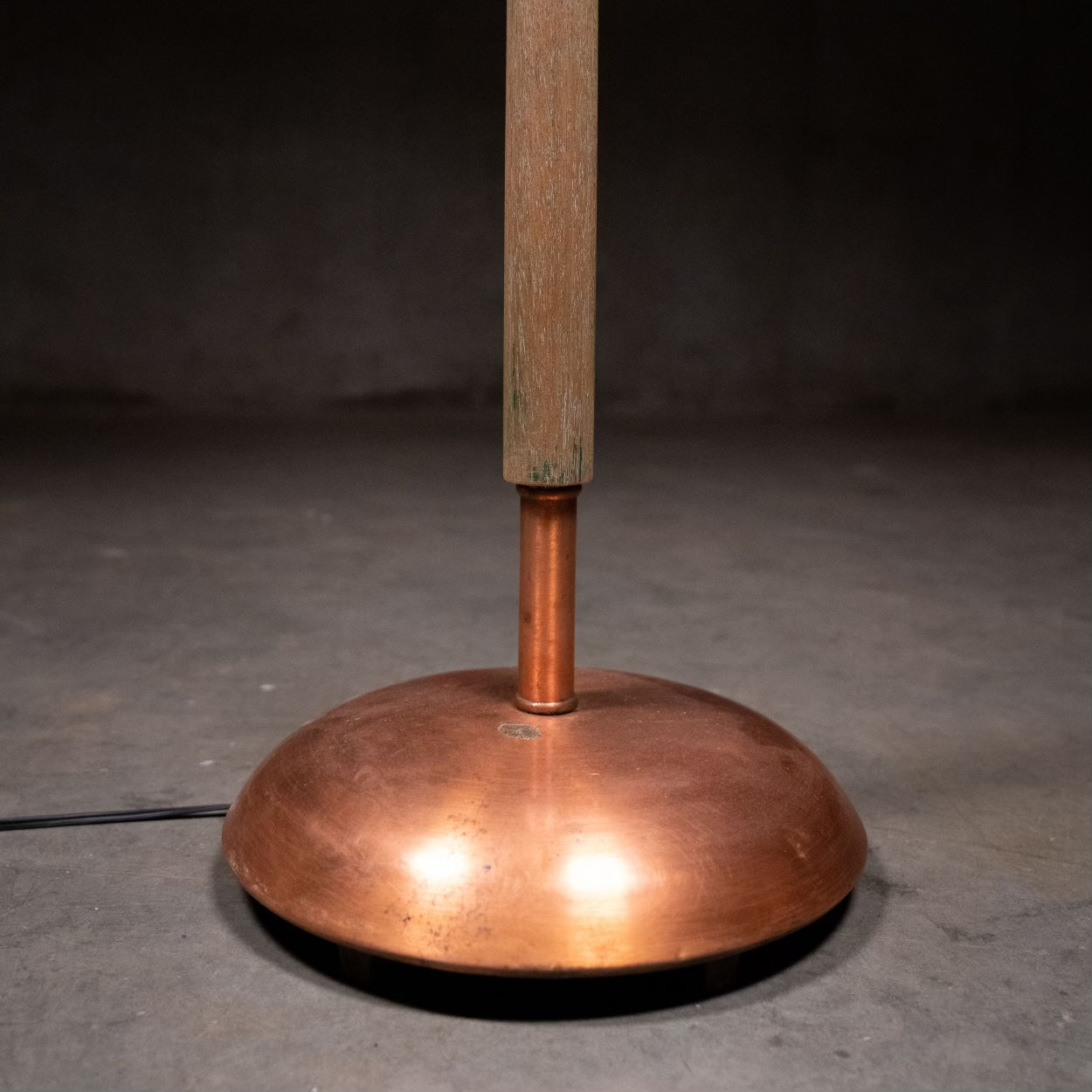 Fully functional rewired floor lamp with original shade in cross over mid century design. Solid copper with wood highlights. C 1955-65.