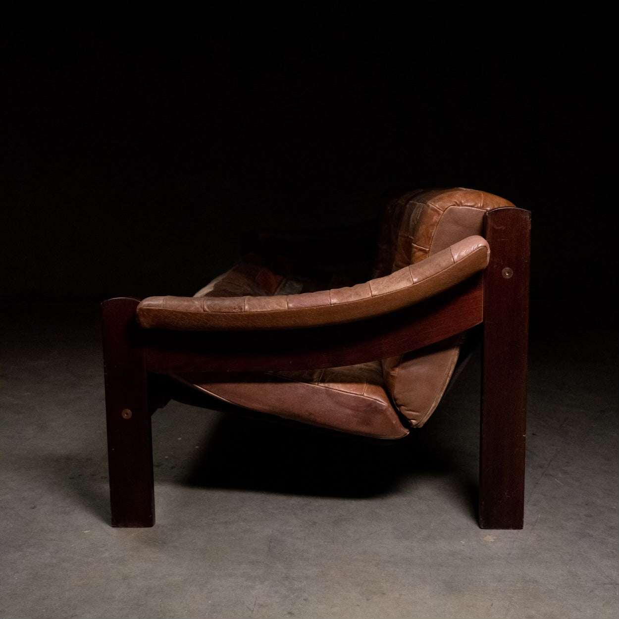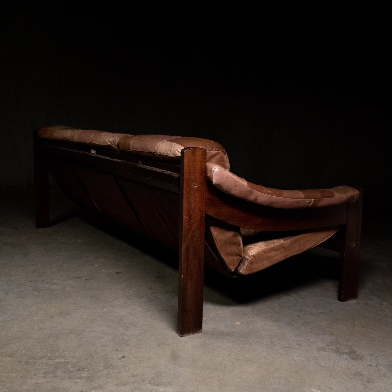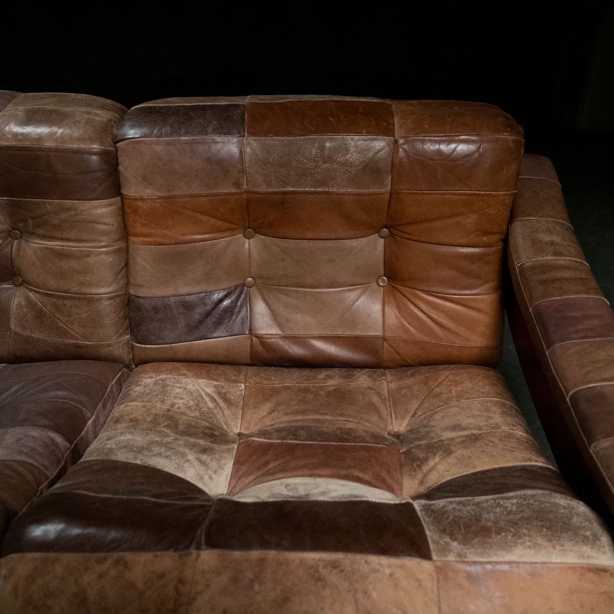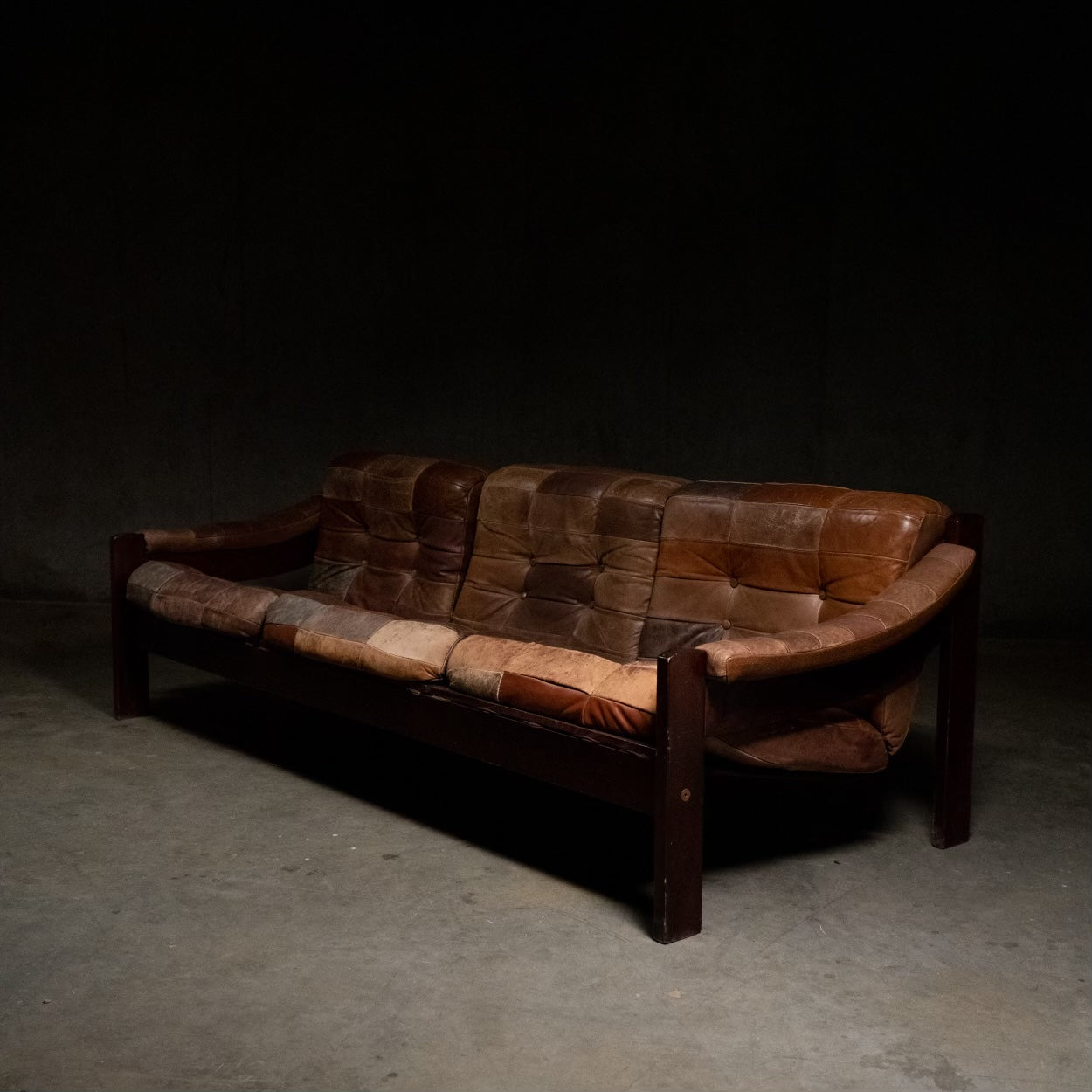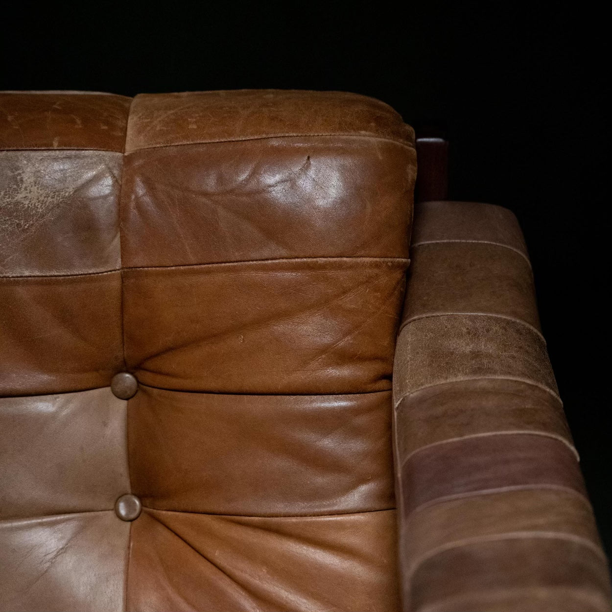 A lean quality leather low MCM SOFA FEATURING PATCH WORK DETAILS, strong teak frame , low profile made in Norway.