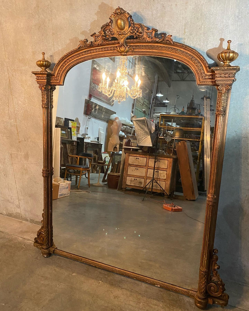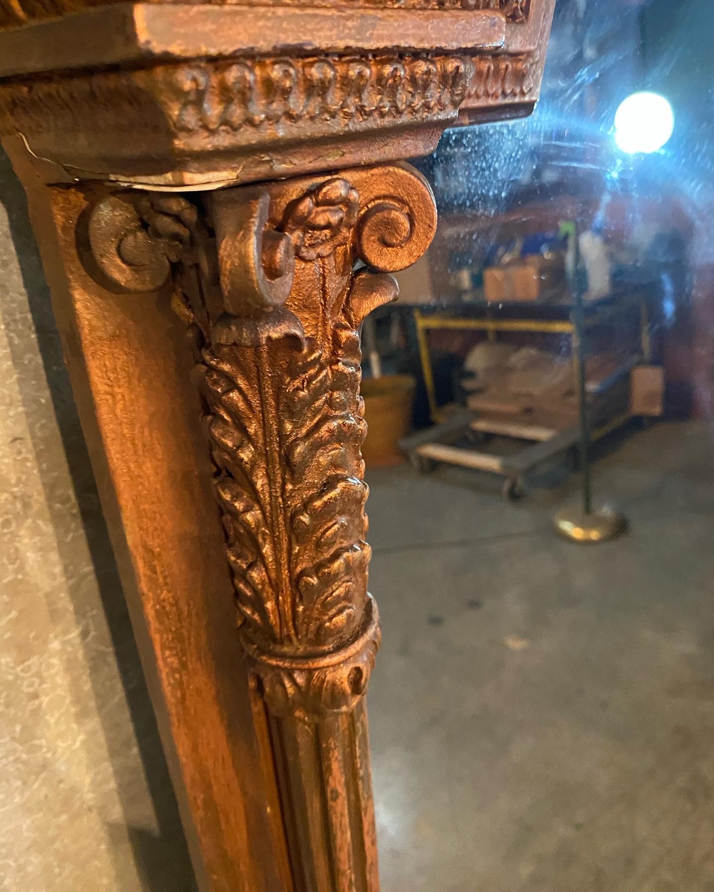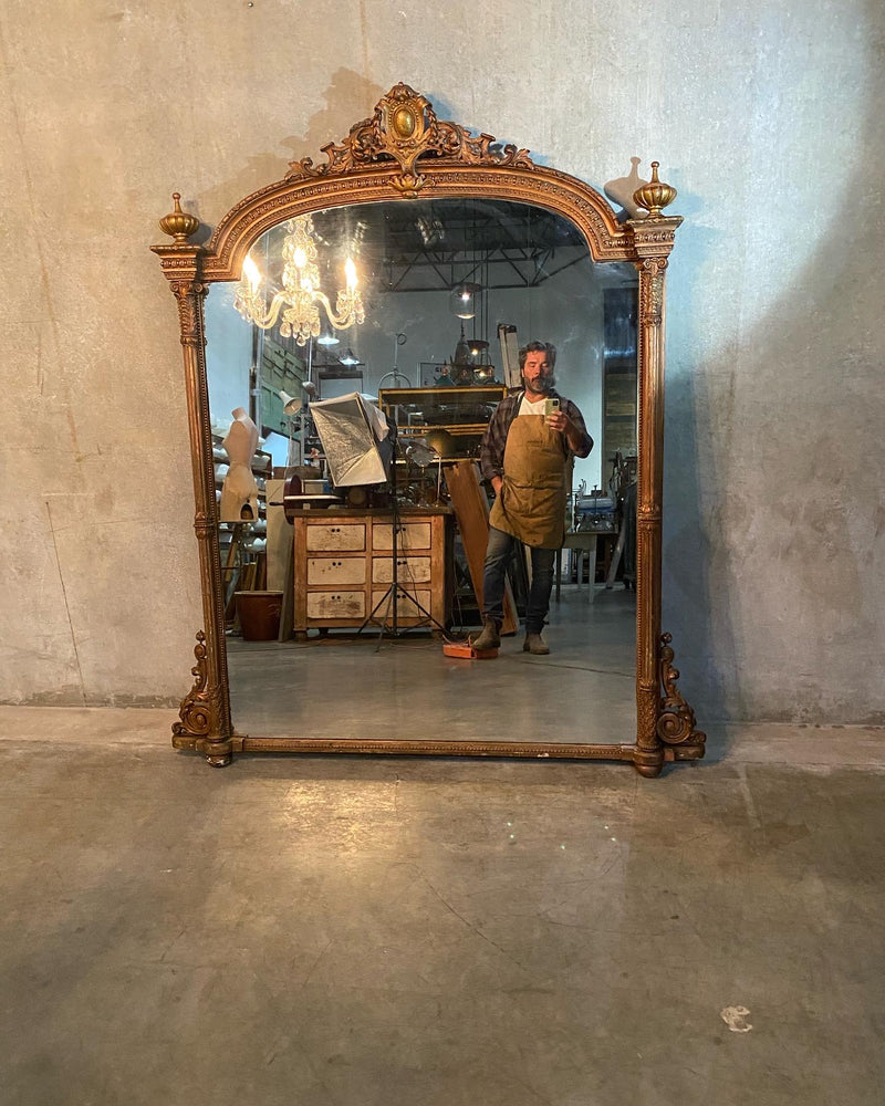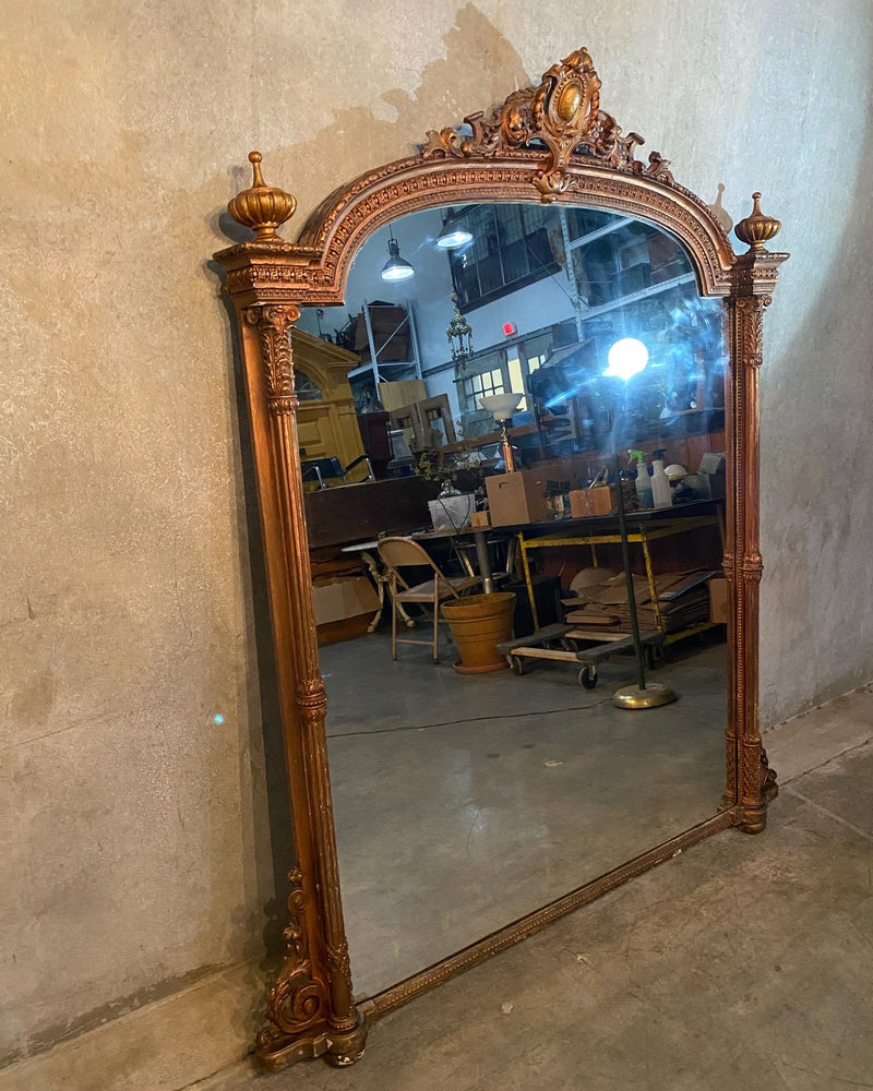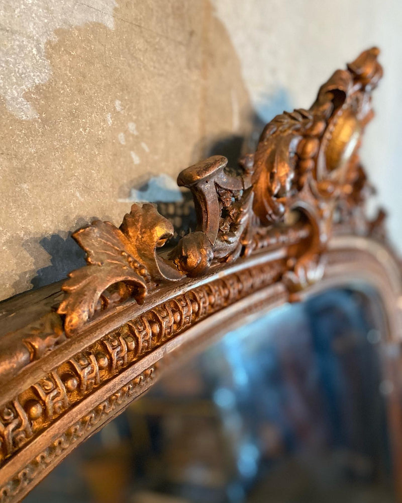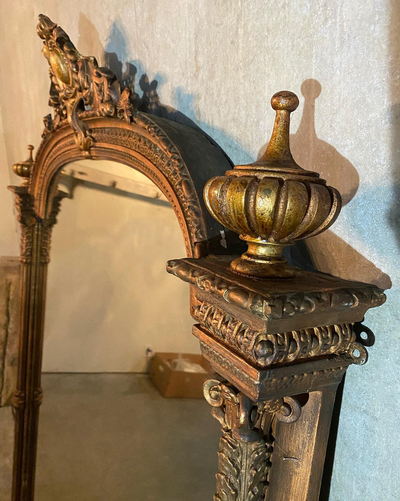 A very grand mirror in old copper finish over original o gilded finish ..it is apparent this early mirror has several layers of historical finish on it . Acquired from a private collection . Found in SCOTLAND 50 years ago.