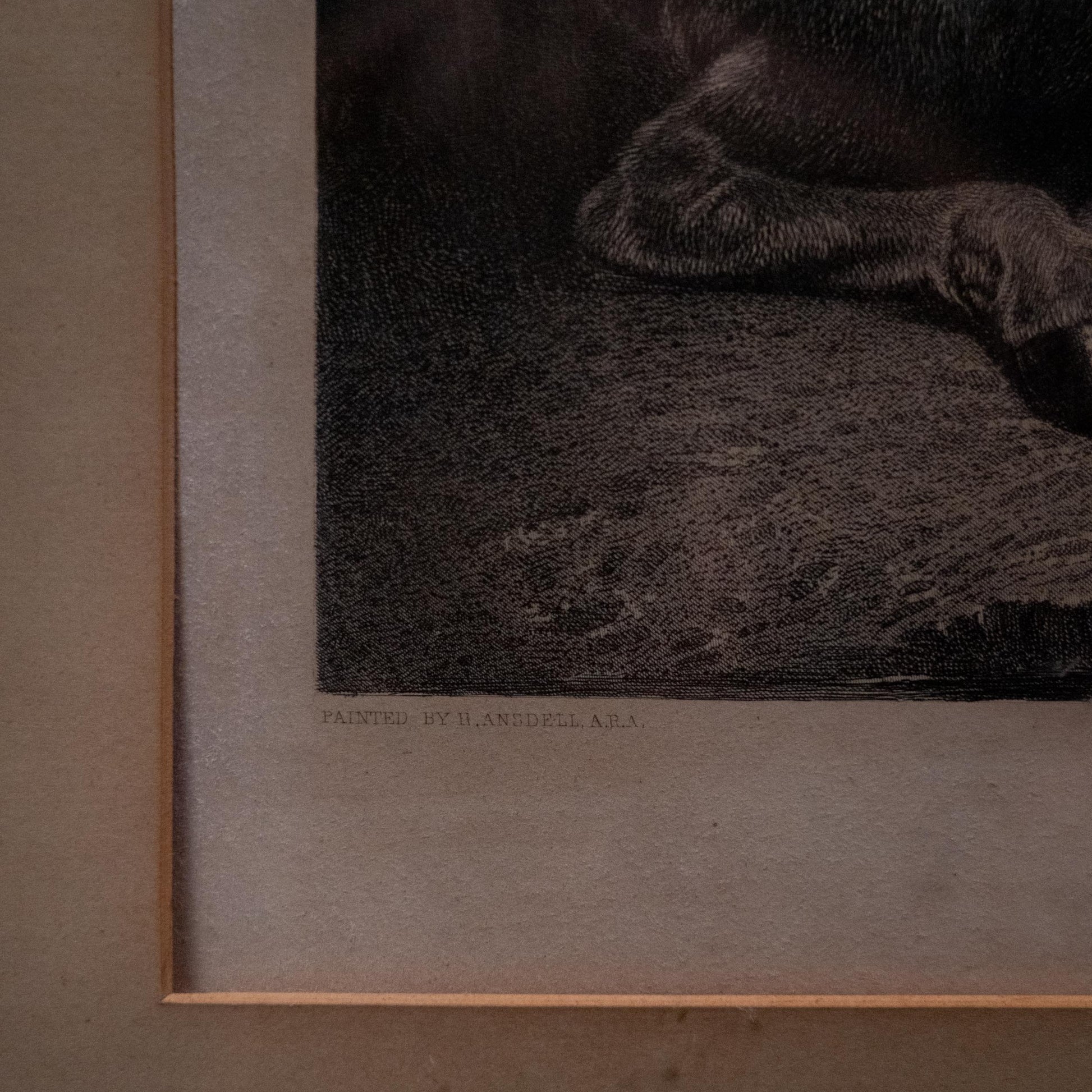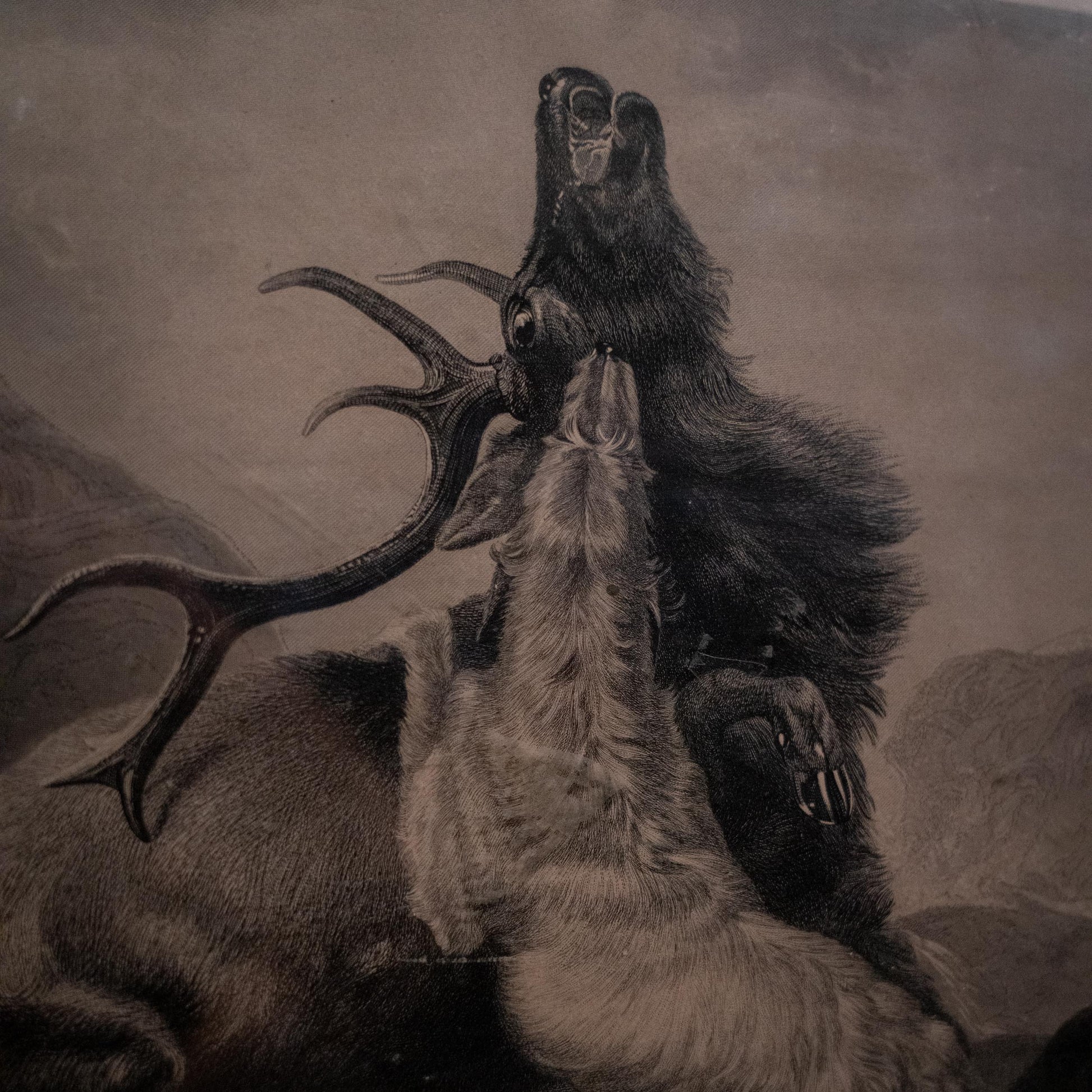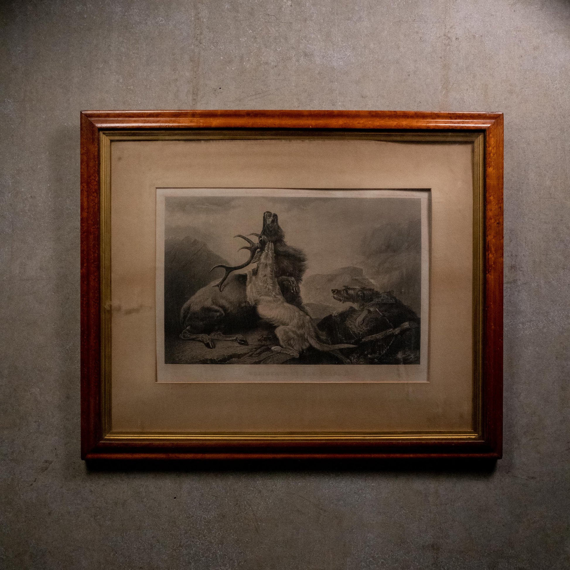 Two hunting dogs attack a stag, in a mountainous landscape. Etching by W.H. Simmons after a painting by R. Ansdell, 1840/1860. Sitting in original birdseye frame. William Henry Simmons (11 June 1811 – 10 June 1882 London) was a British printmaker.