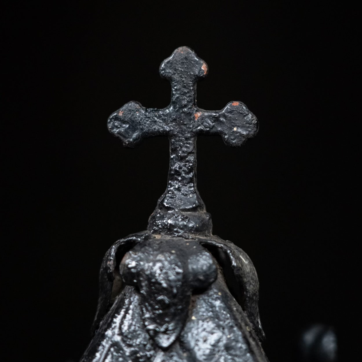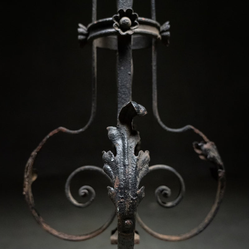 Authentic pair of religious standards found in a gothic estate in Montreal. The iron posts were mounted in stone and held candles. Religious details, original black finish and all handmade in the 19th century.