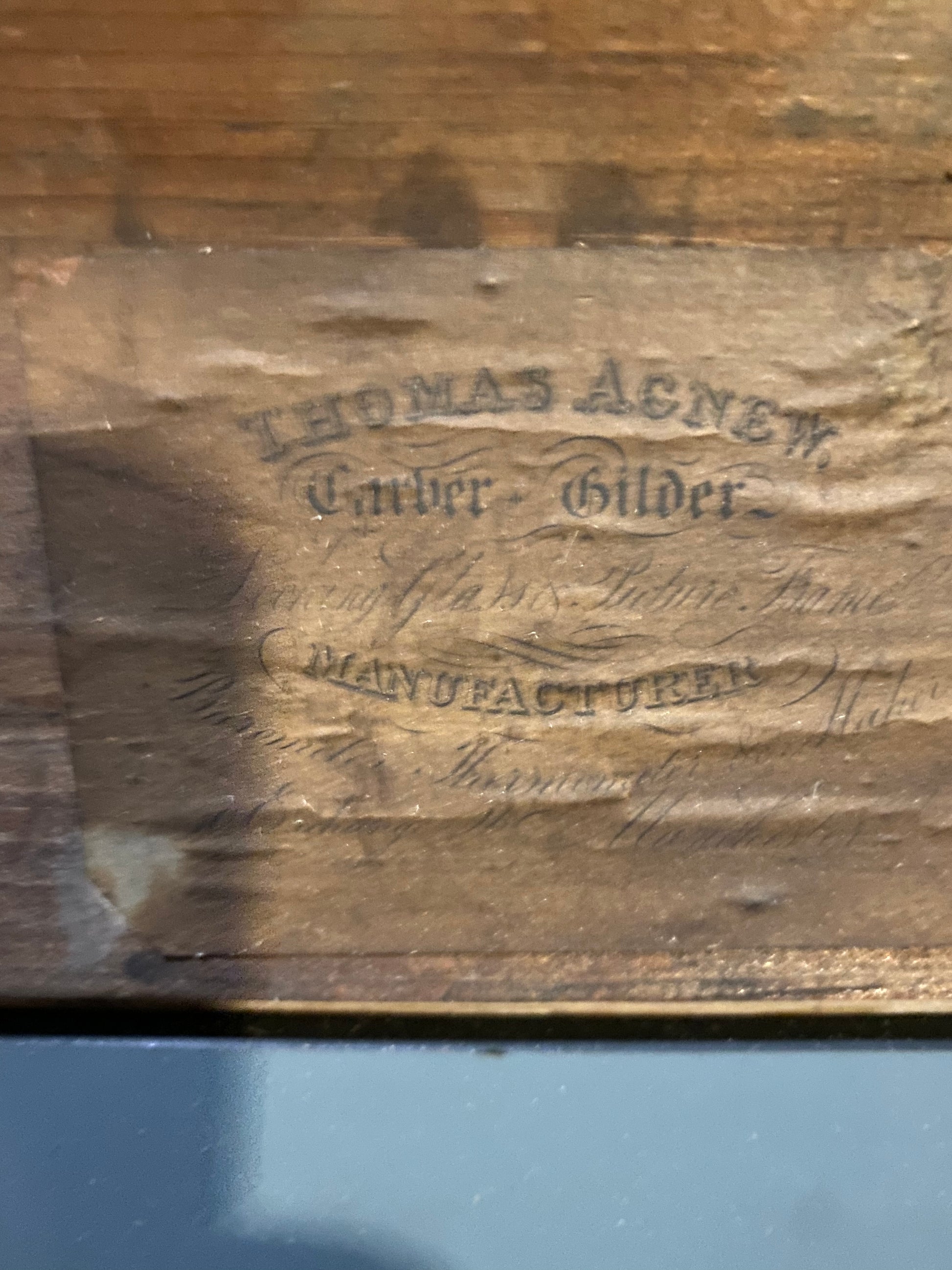 Beautiful gilded English frame crafted by Thomas Agnew. . Agnew, Thomas & Zanetti, Vittore, Manchester, carvers and gilders (1810–40). Thomas Agnew (b. 1794–d. 1871), founder of the present firm of Bond St, London, fine art dealers, was app. to Zanetti in 1810 and made a partner in 1817. In partnership with Zanetti's son from 1825–34. The Dunham Massey papers record a payment on 10 January 1824 to ‘Mr. Agnew carver & gilder £219’. The firm also supplied artists’ materials, pictures, mirrors and barometers. They traded from 94 Market St in 1810, but in 1825 were listed at 25 Gartside St.