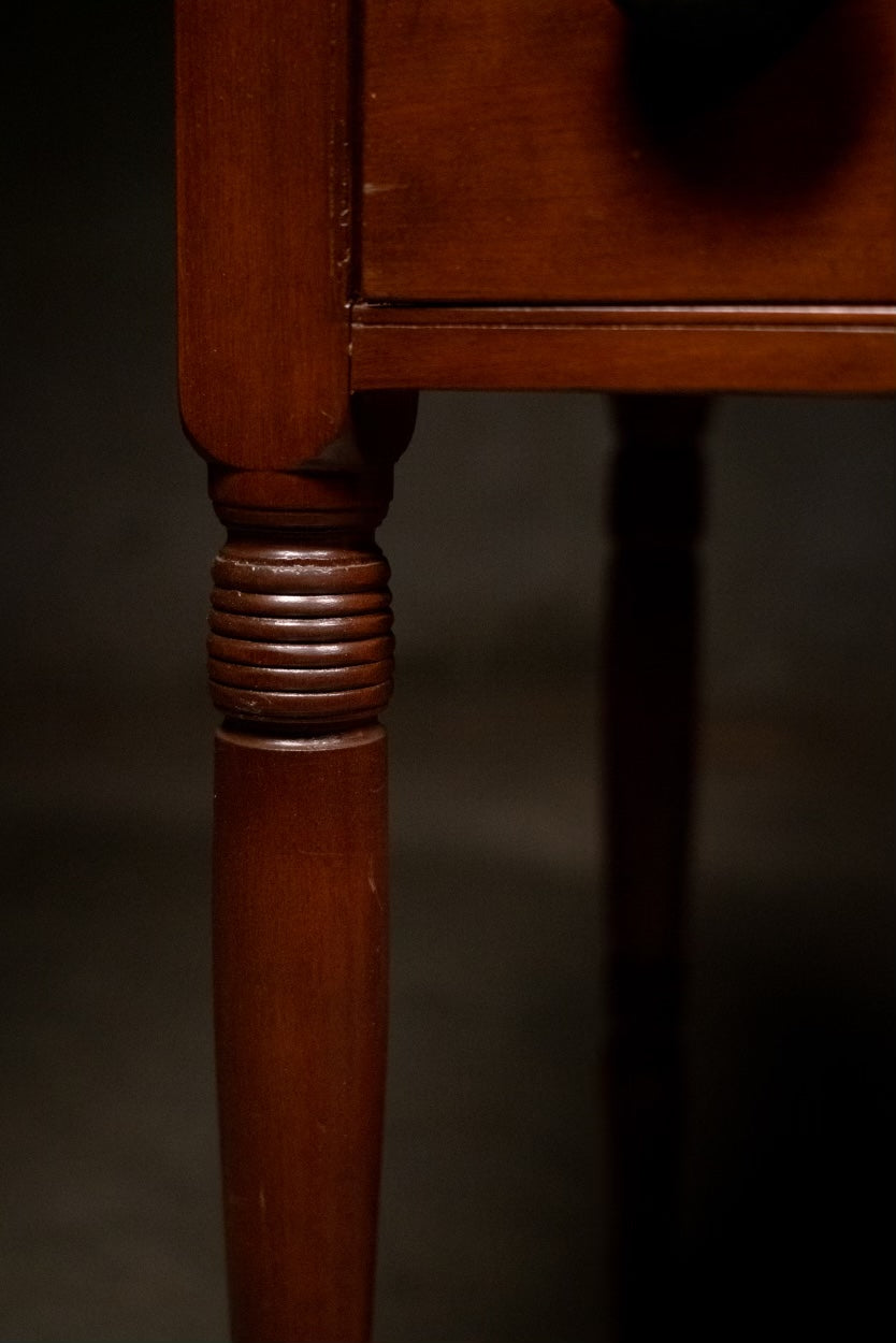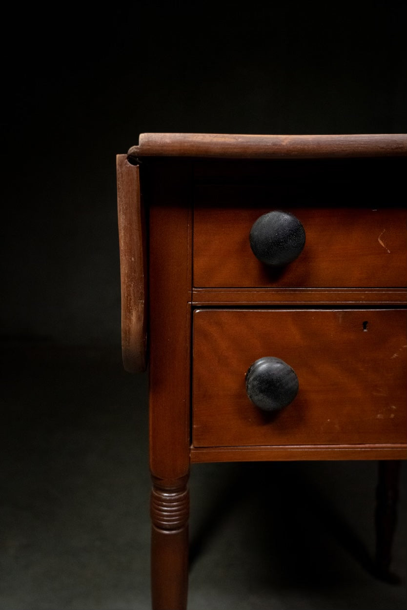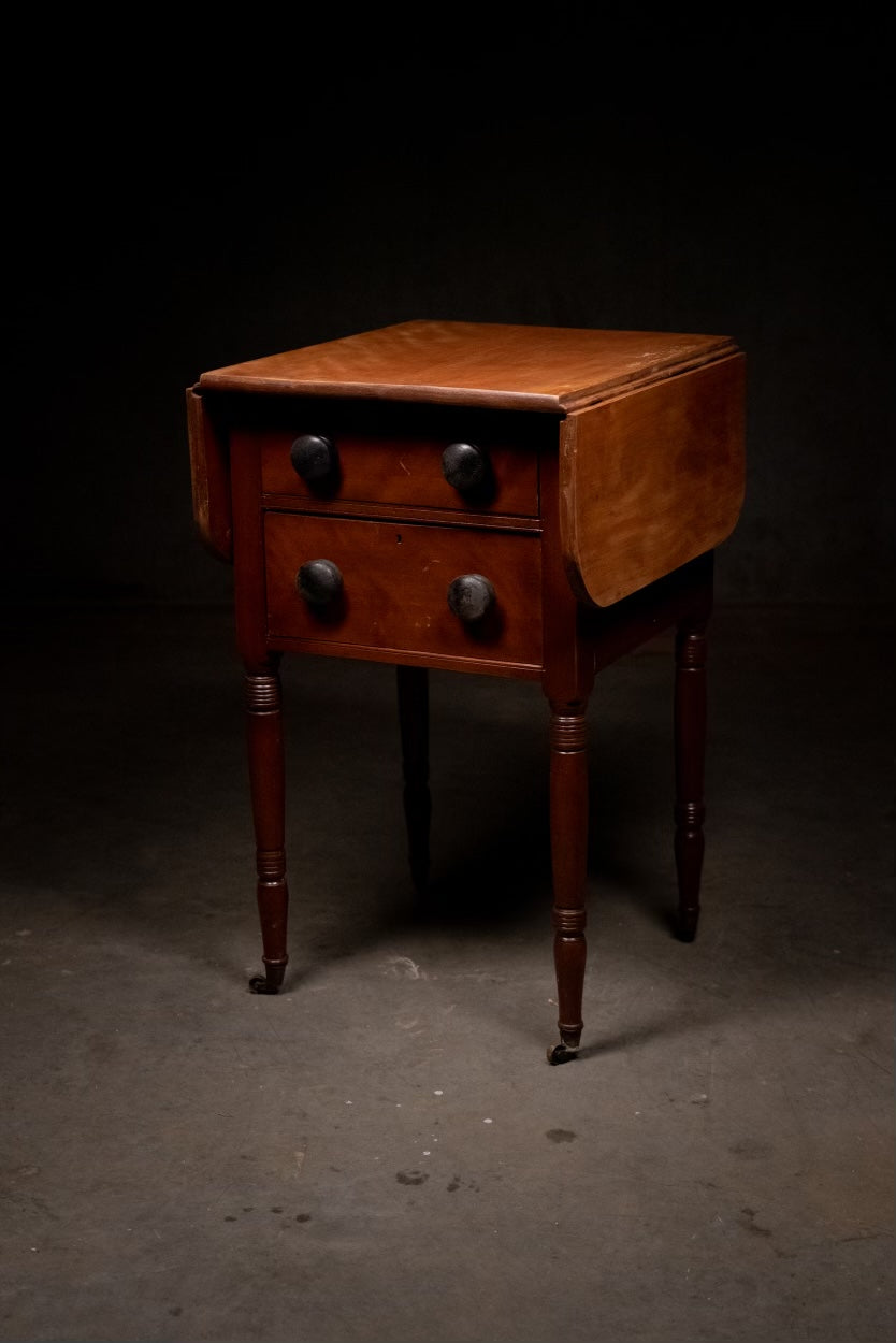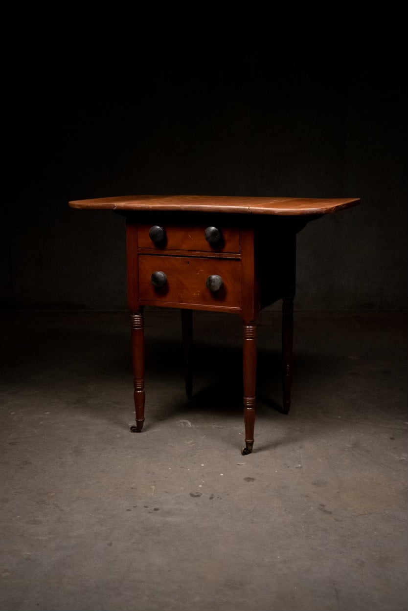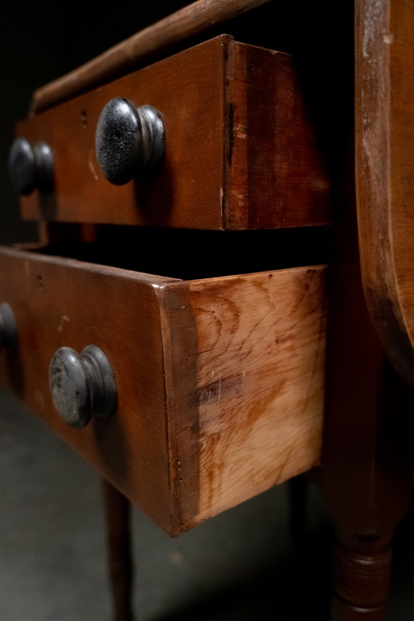 A simple but original formal country stand with drop leaf and two drawer configuration. Made in solid birch and cherry, most likely eastern Canadian origin.