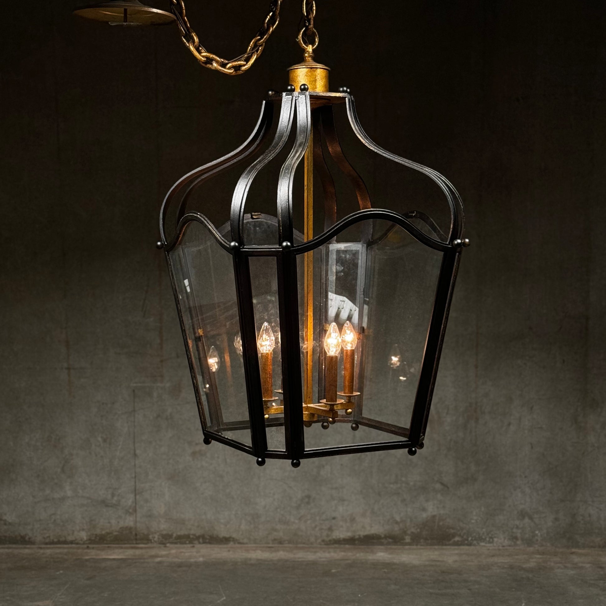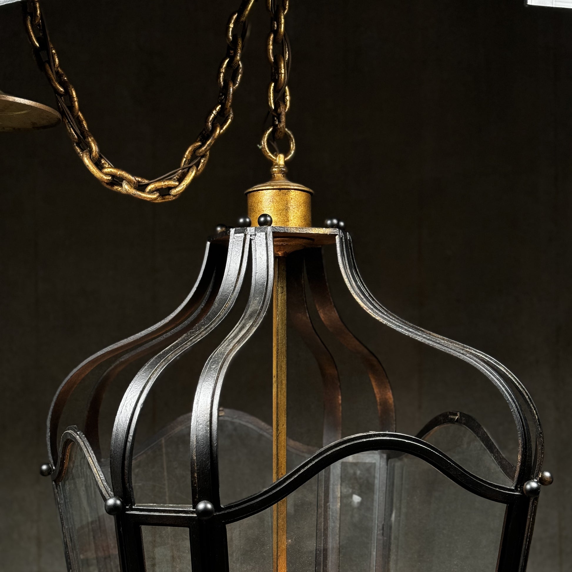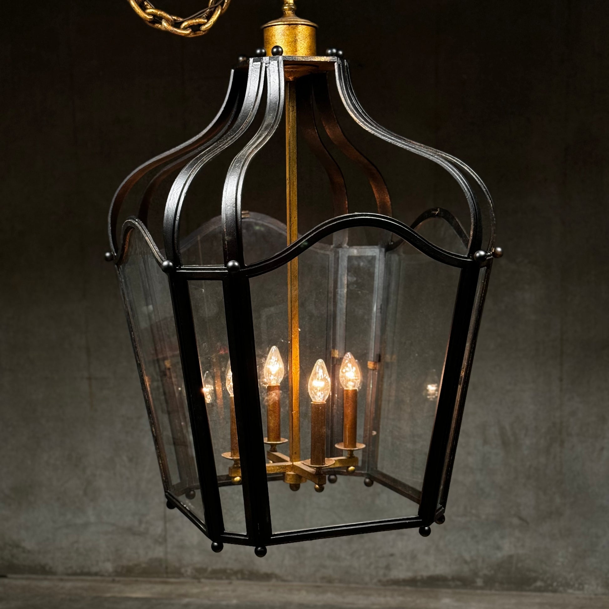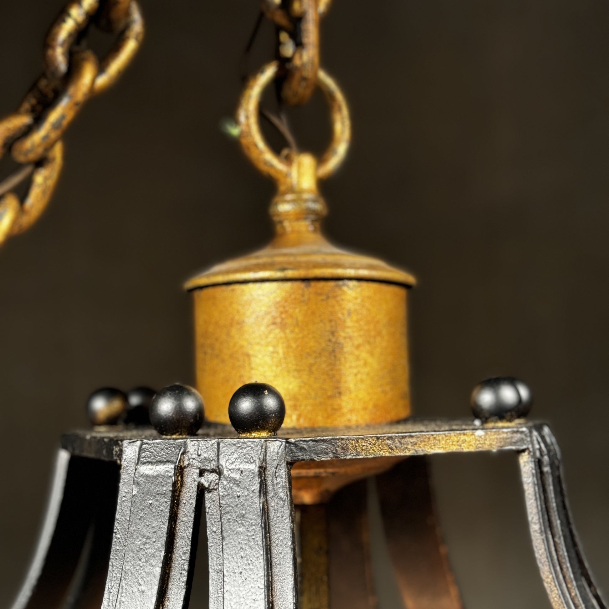 20th century Very large heavy bronze impressive foyer fixture in ebonized finish with gilded accents.
