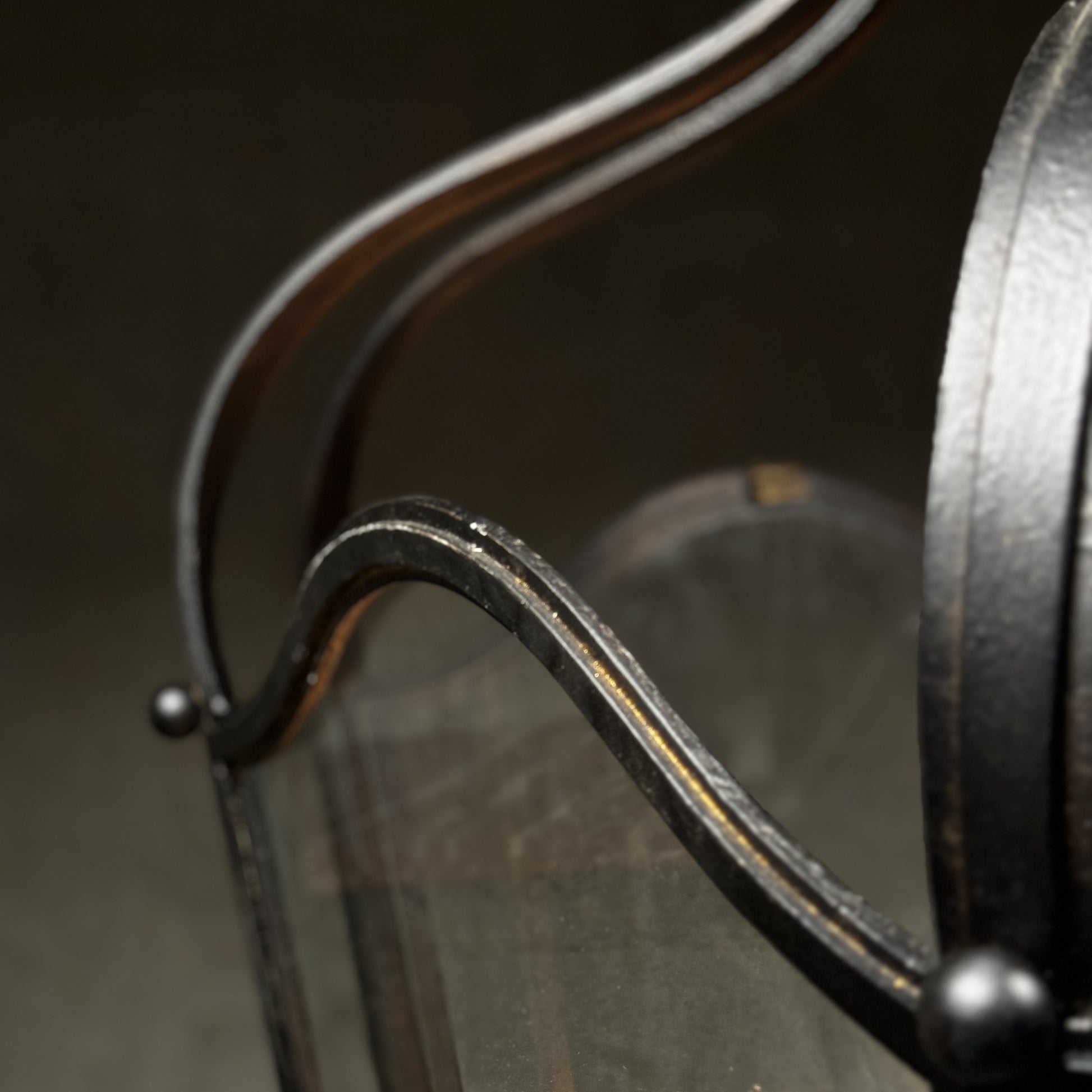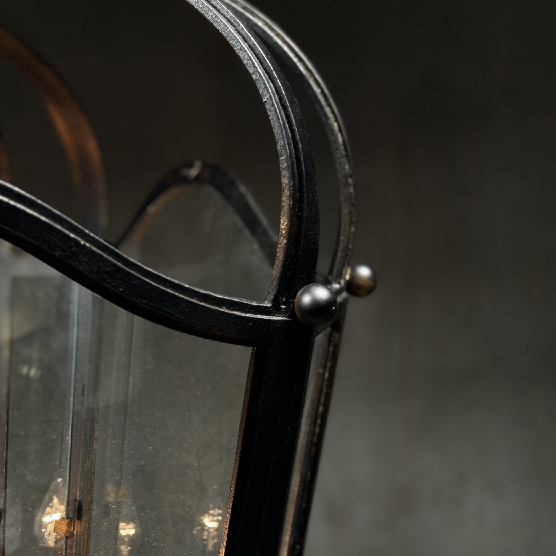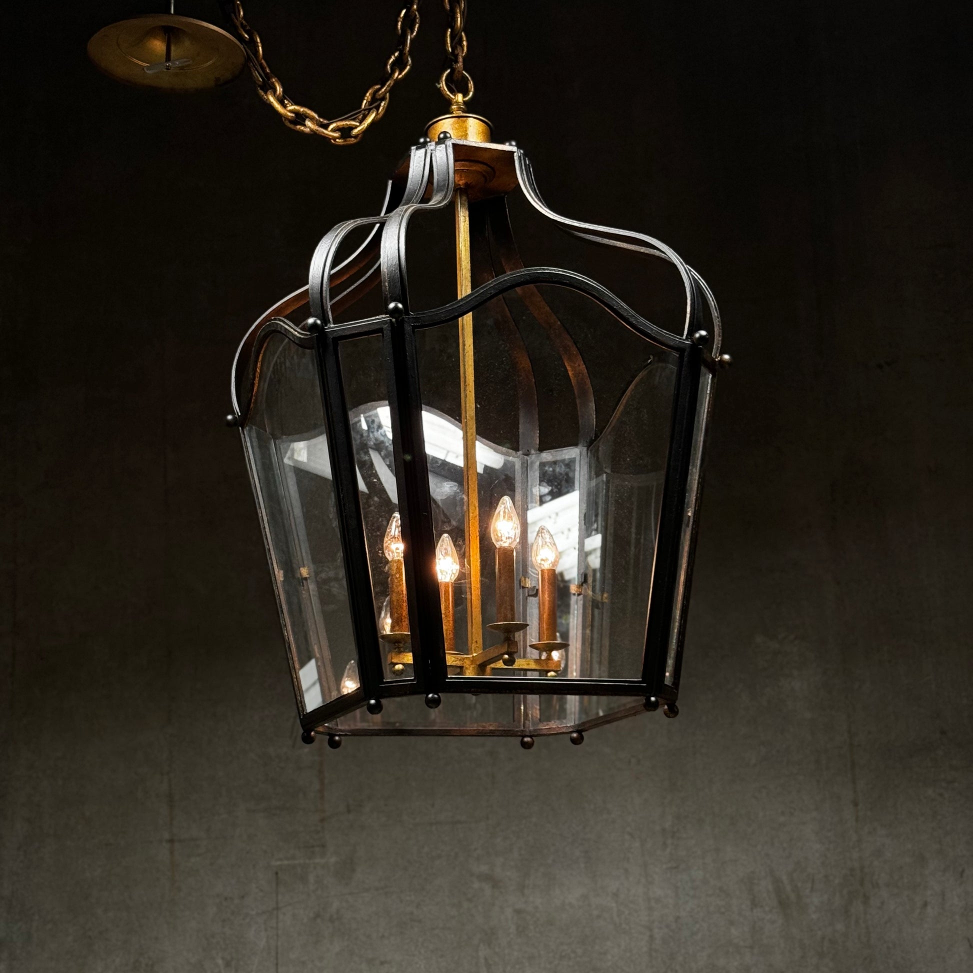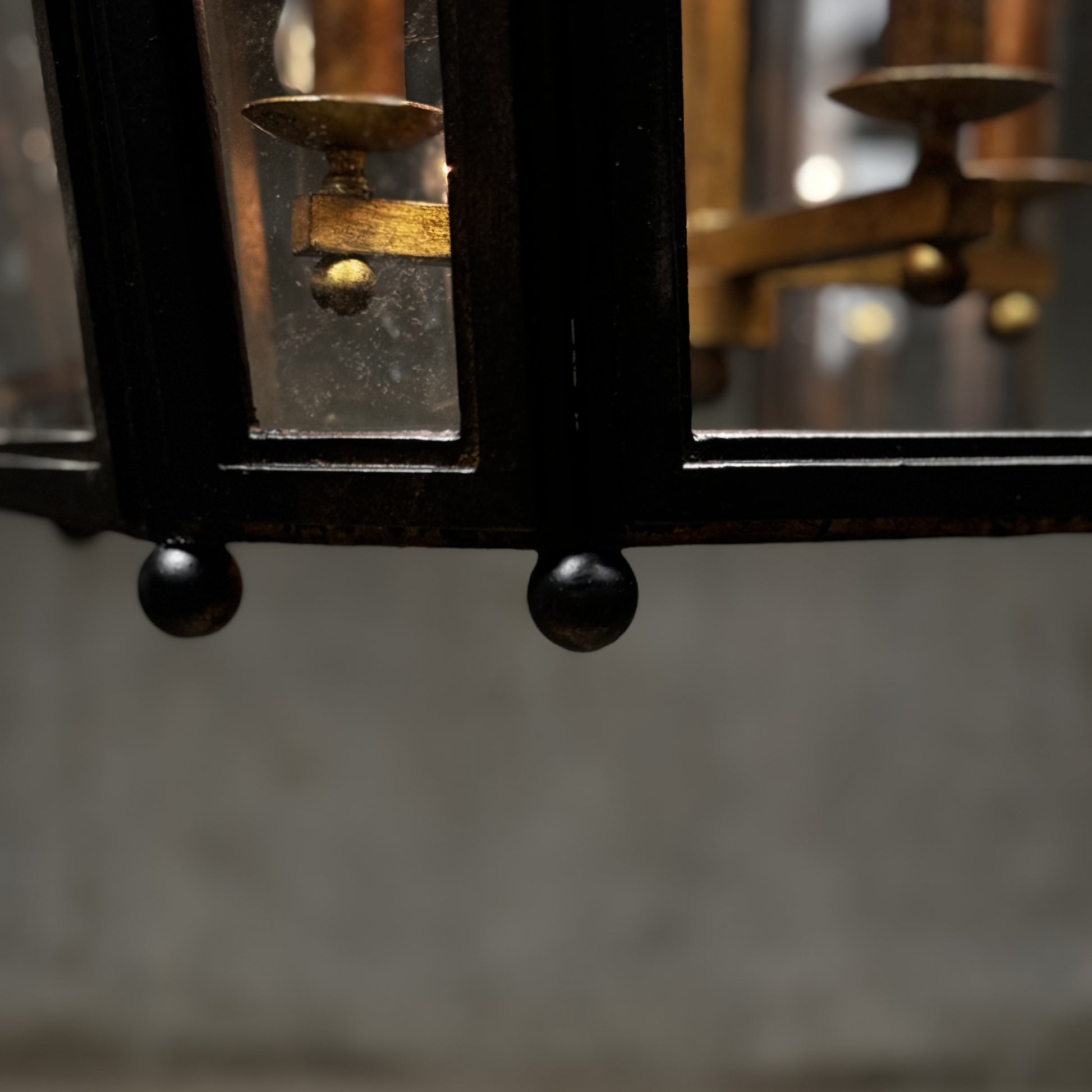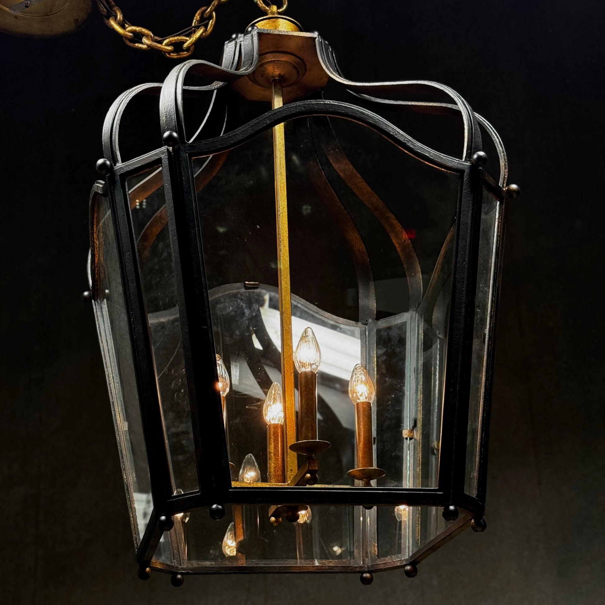 20th century Very large heavy bronze impressive foyer fixture in ebonized finish with gilded accents.