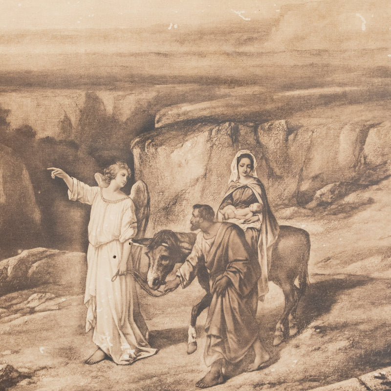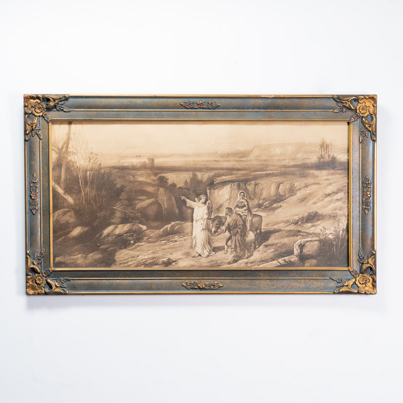 A decorative framed print depicting the biblical Flight into Egypt, rendered in a soft sepia tone after a 19th-century academic composition.