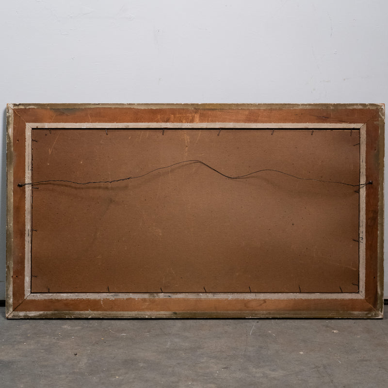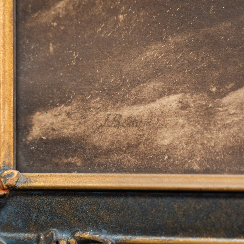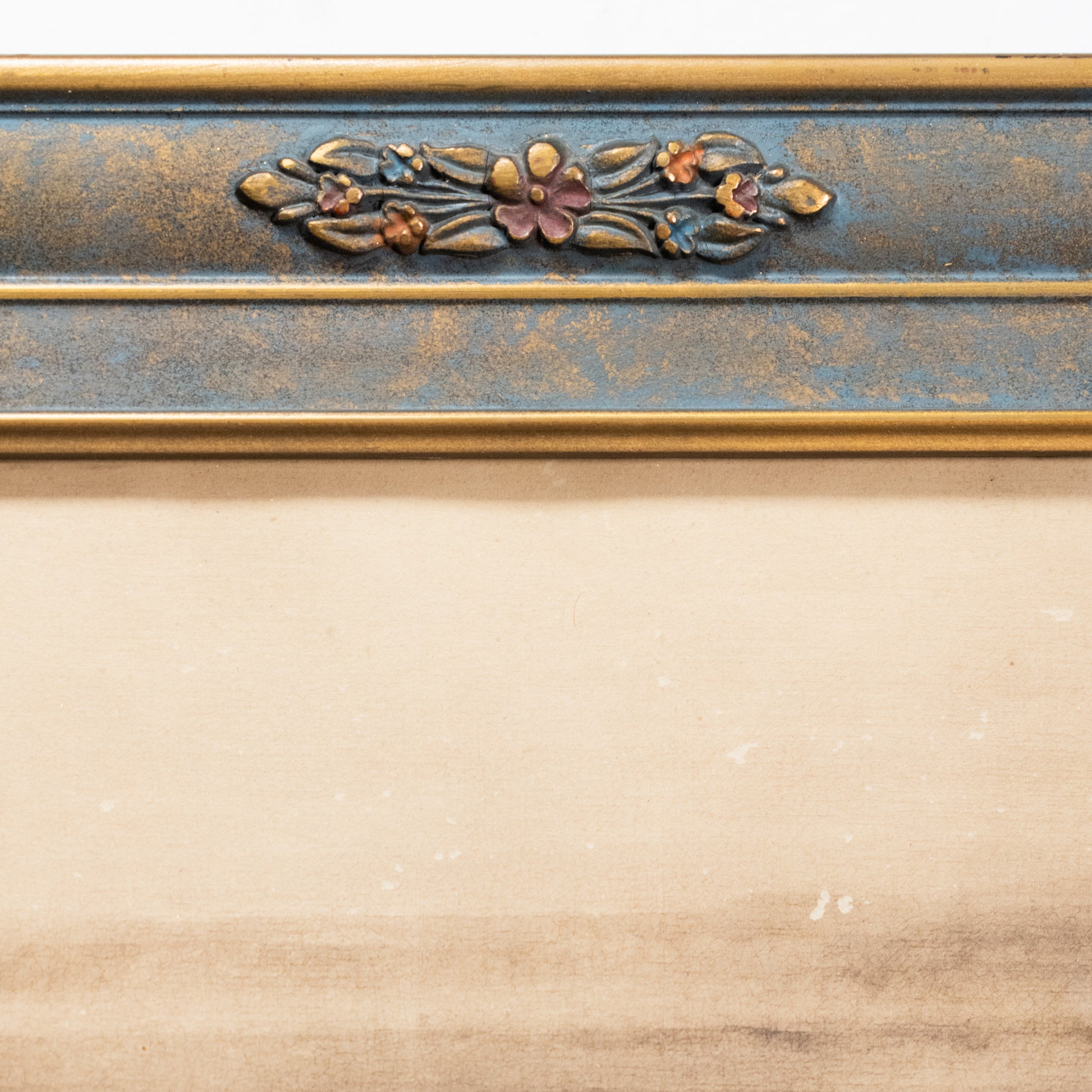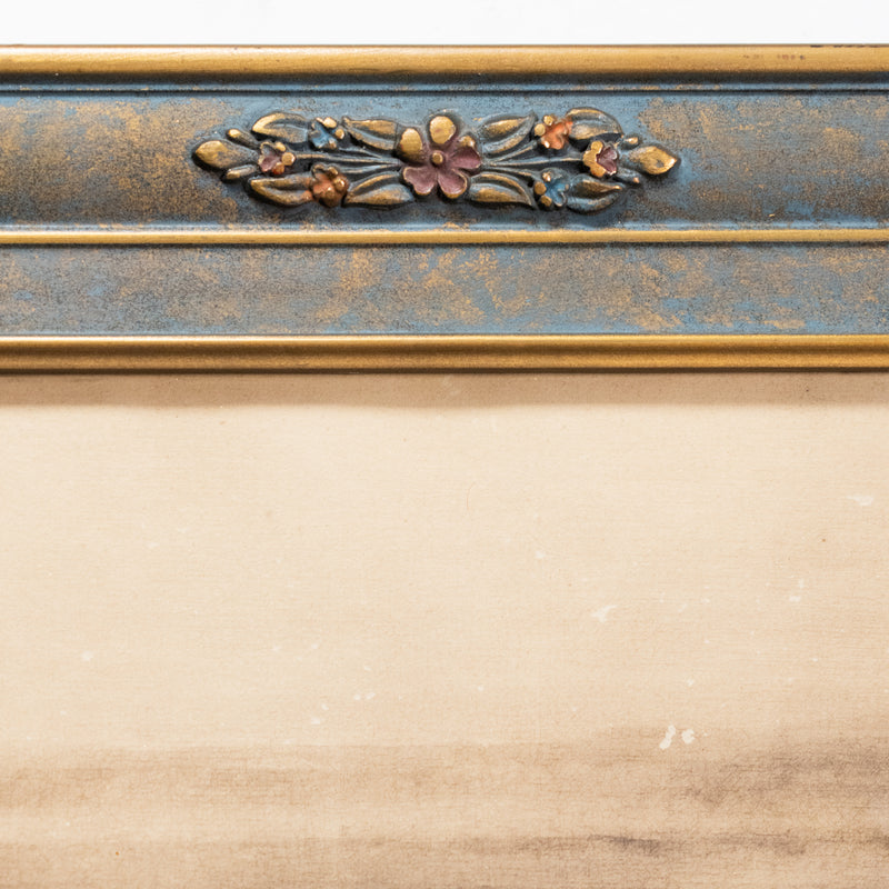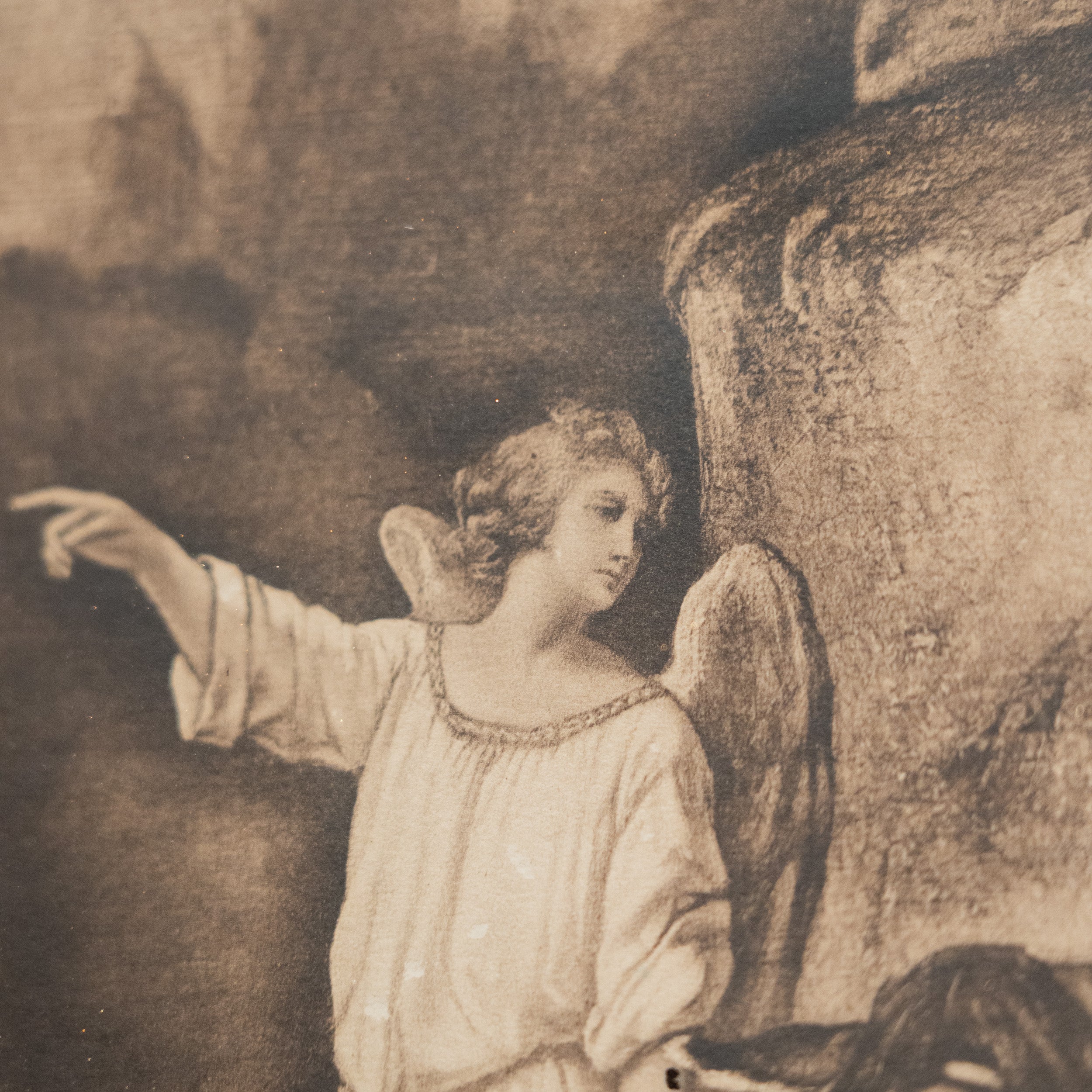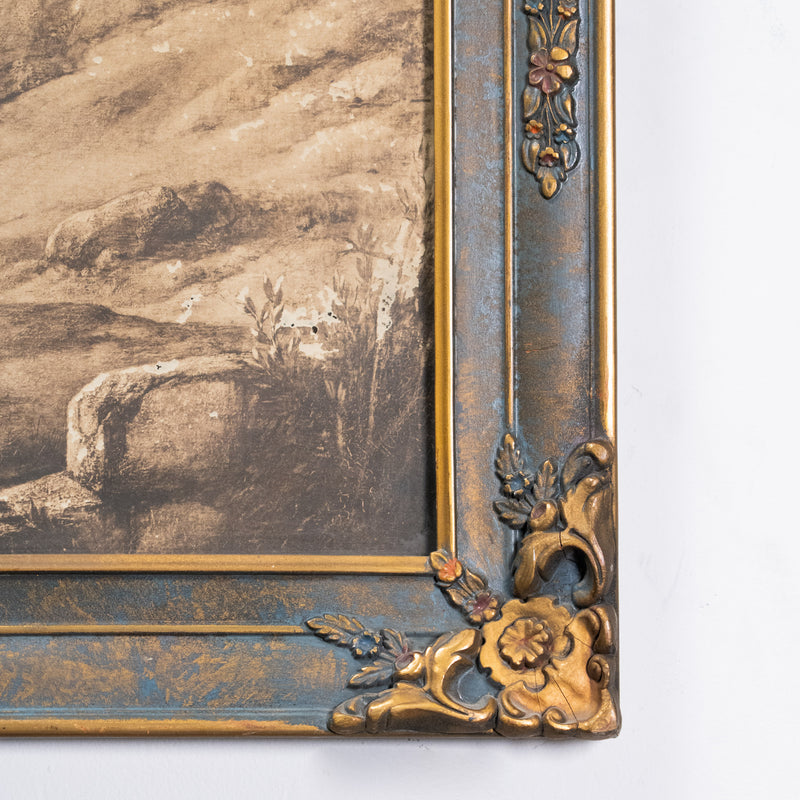 The scene shows the Holy Family guided by an angel through a landscape, executed in a style reminiscent of charcoal drawing. Presented in a substantial mid-century frame with gilt accents and floral corner details, the piece offers strong visual impact and classical presence.