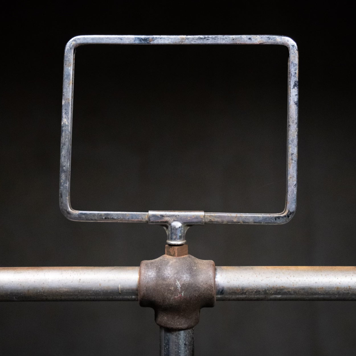 Very good example of an industrial commercial garment rack with the rare connecting advertising box and detailed cast base .. Found in Texas .