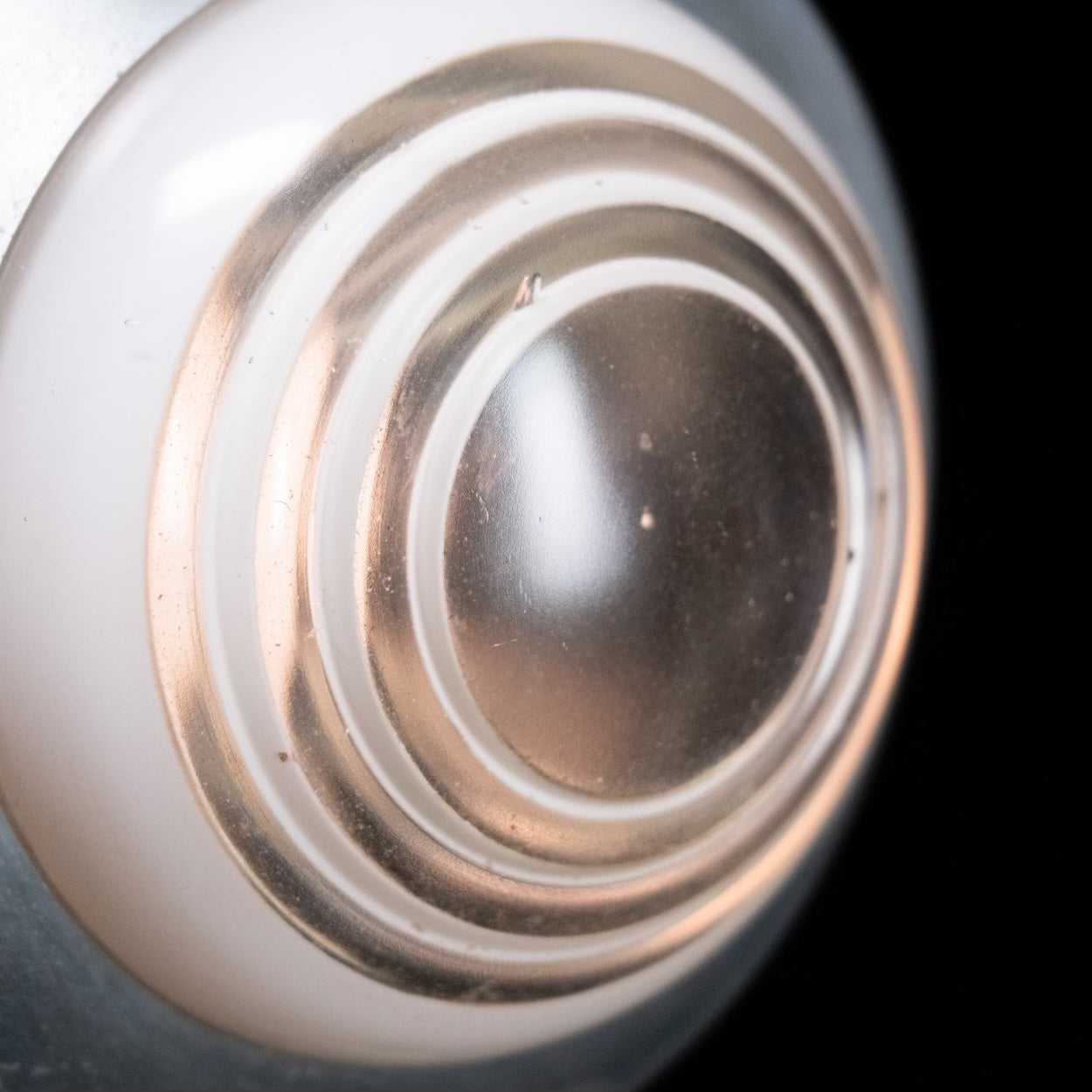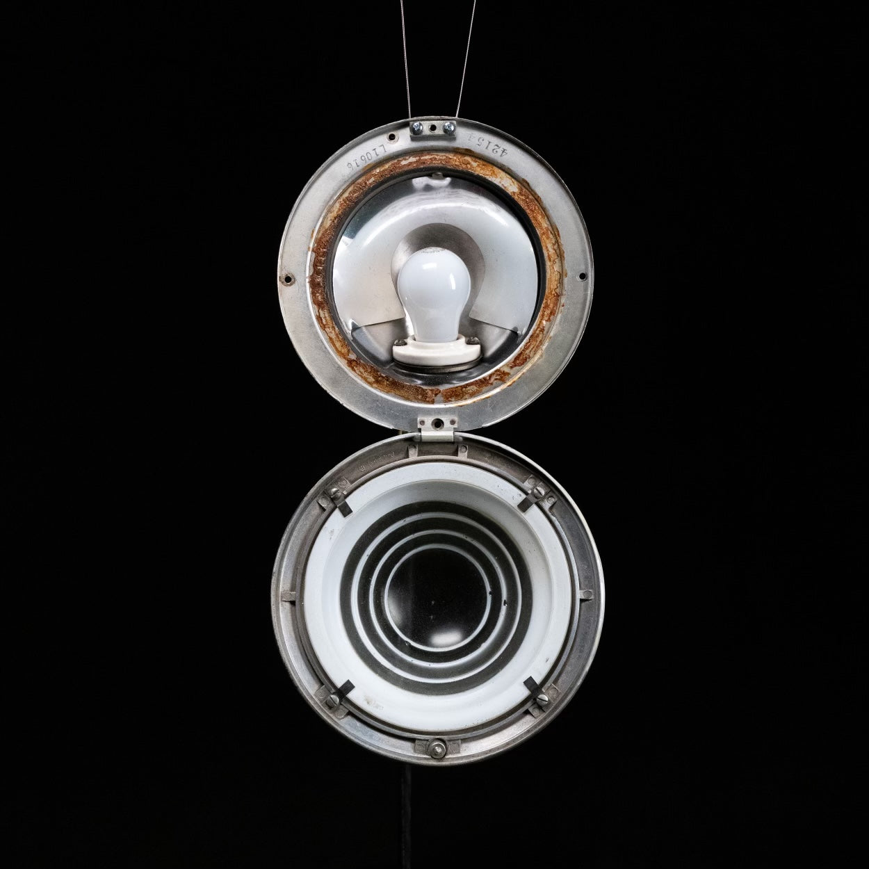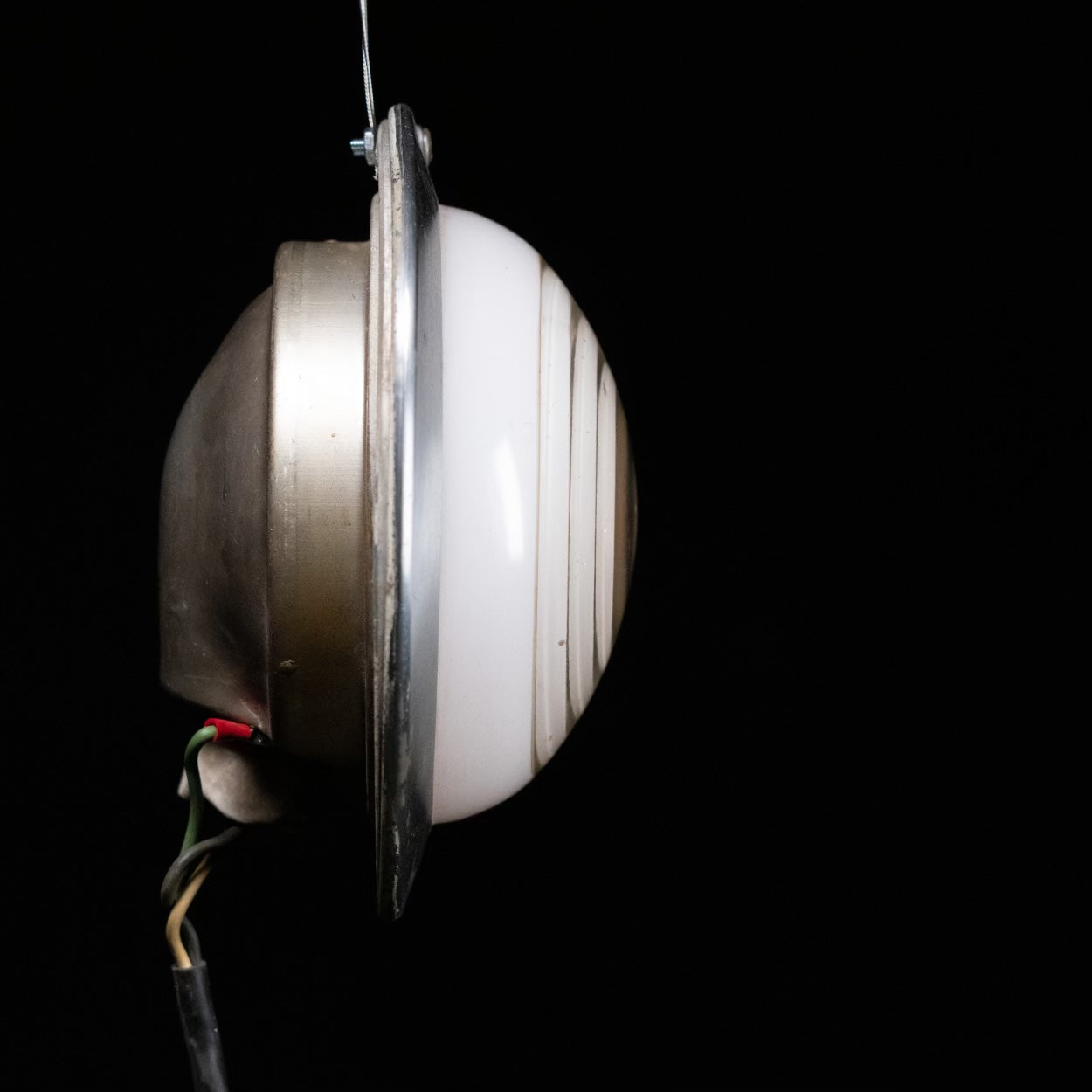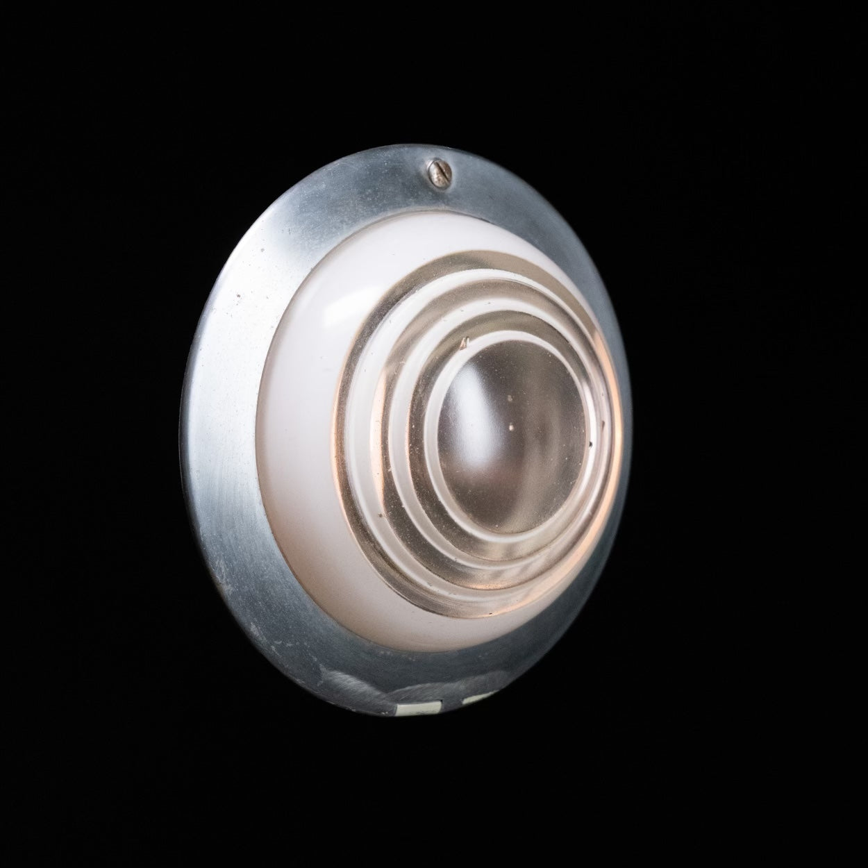 These lights were mounted in the ceiling of the 20th Century Limited. Henry Dreyfuss re-designed both the exterior and interior in 1938, of the 20th Century Limited, one of the most famous of the Streamline Trains. The convex glass insert magnifies the light. Henry Dreyfuss was one of America’s foremost modern industrial designers. Starting in 1929 when Henry Dreyfuss opened his own studio until 1969 when he retired, his modernist The 20th Century Limited was an express passenger train on the New York Central Railroad (NYC) from 1902 to 1967. The train traveled between Grand Central Terminal in New York City and LaSalle Street Station in Chicago, Illinois, along the railroad's "Water Level Route".