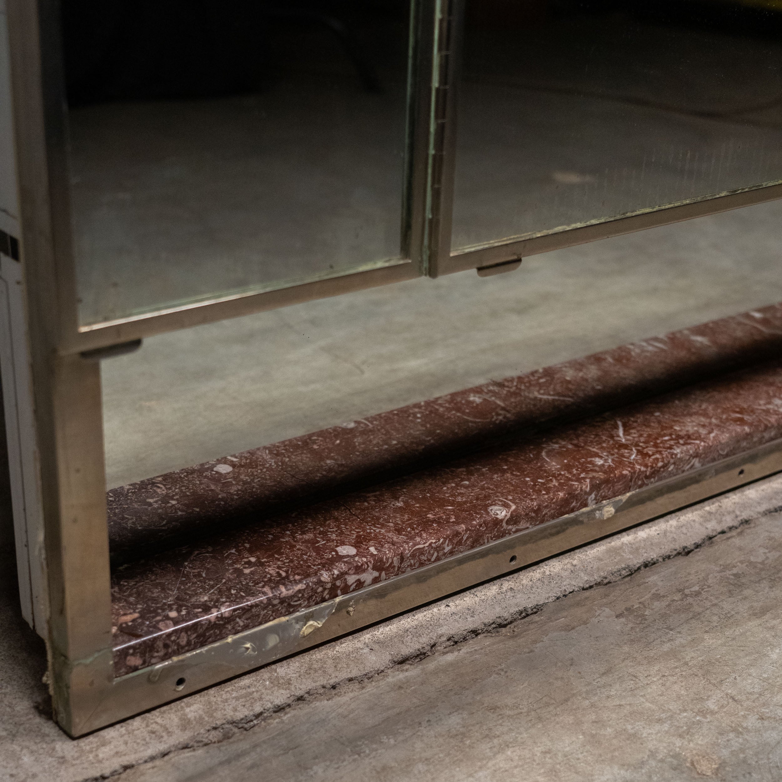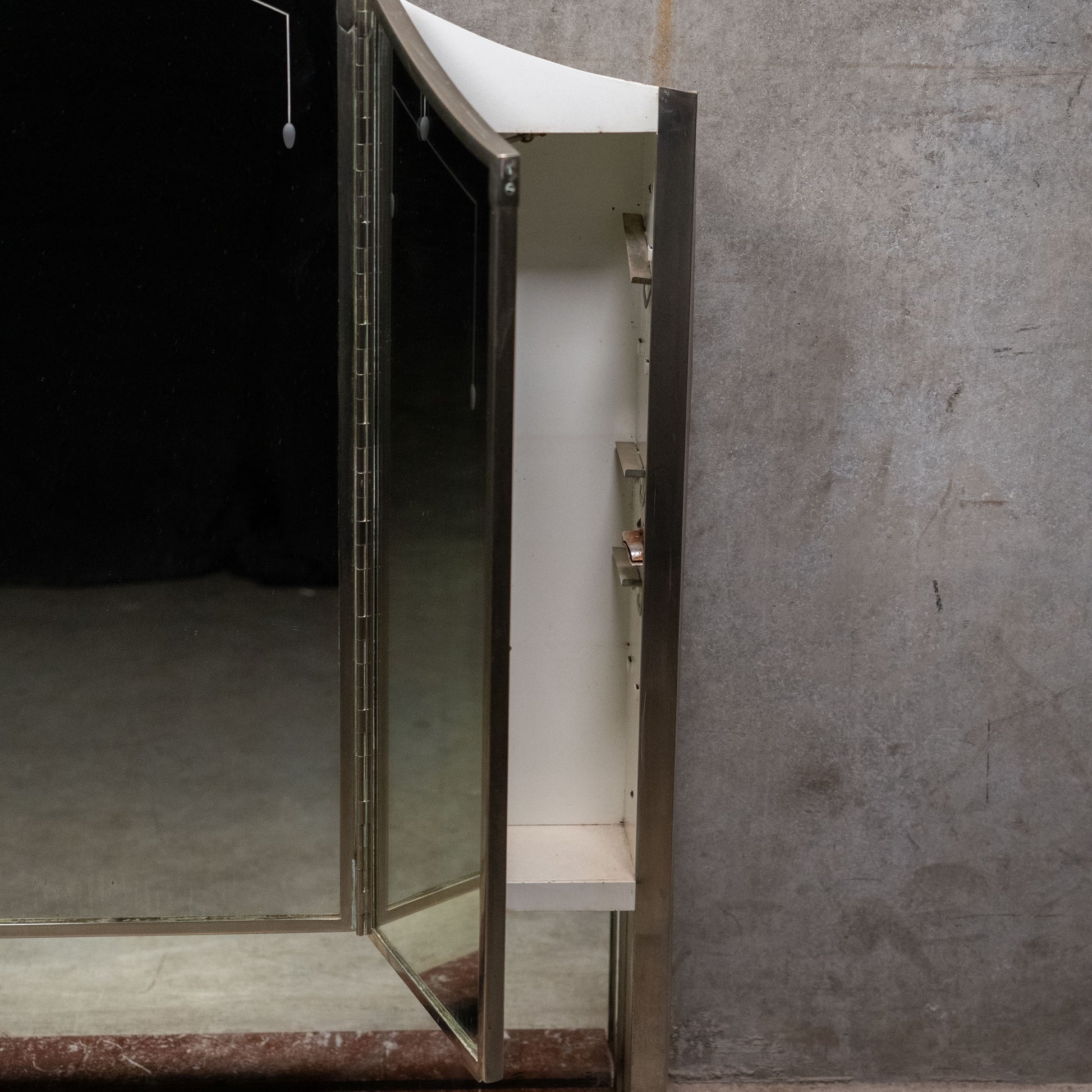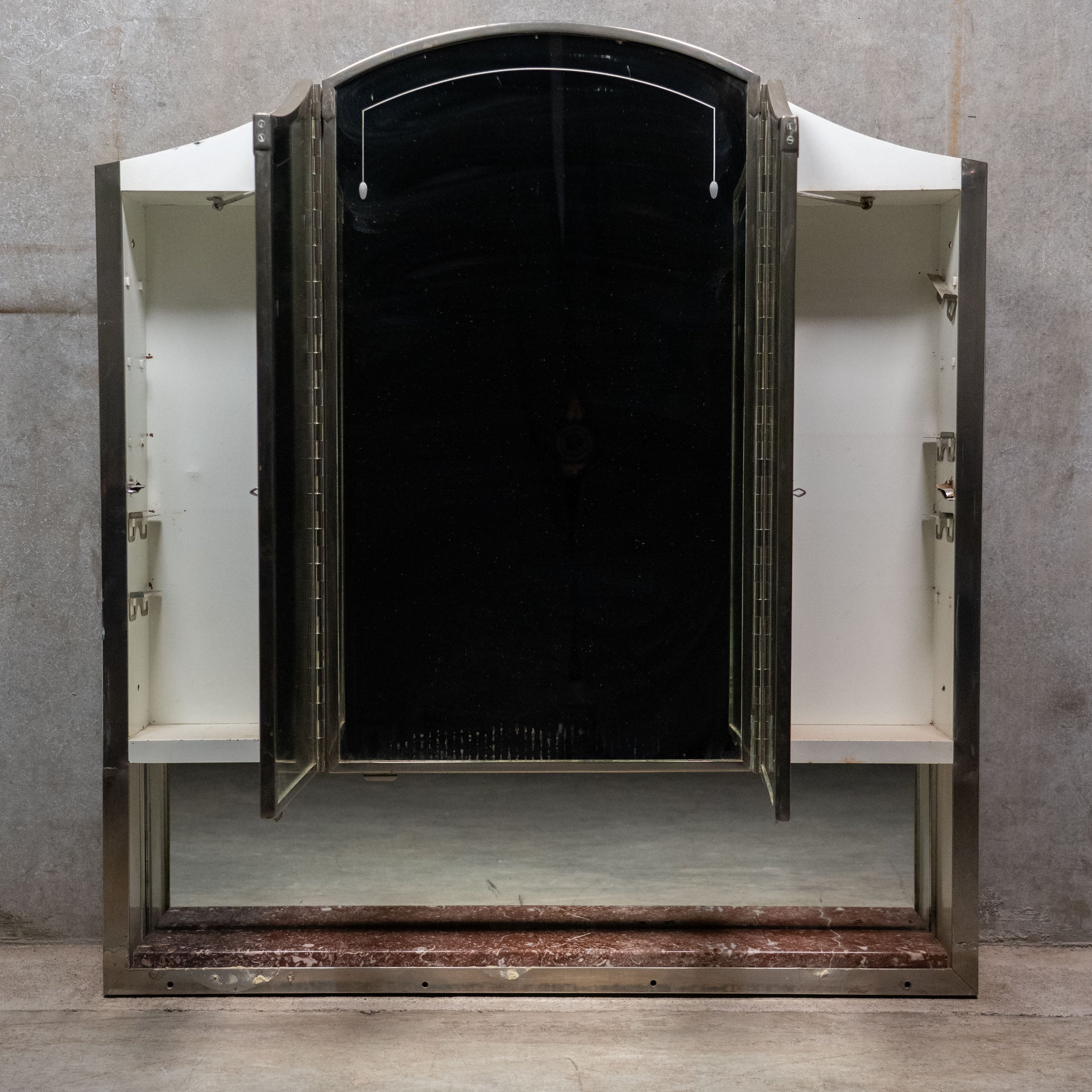 Large high-quality Art Deco style vanity cabinet from the historic Waldorf Astoria Hotel in New York City. Mirrored, three-panel cabinet with hinged doors and interior shelves, plus an open shelf below with a beautiful piece of marble on it. All made from nickel-plated brass. Could be mounted as a vanity cabinet either into or onto a wall anywhere in your home.