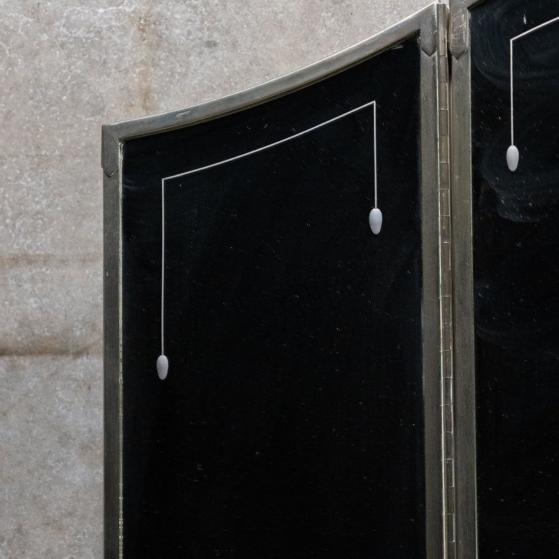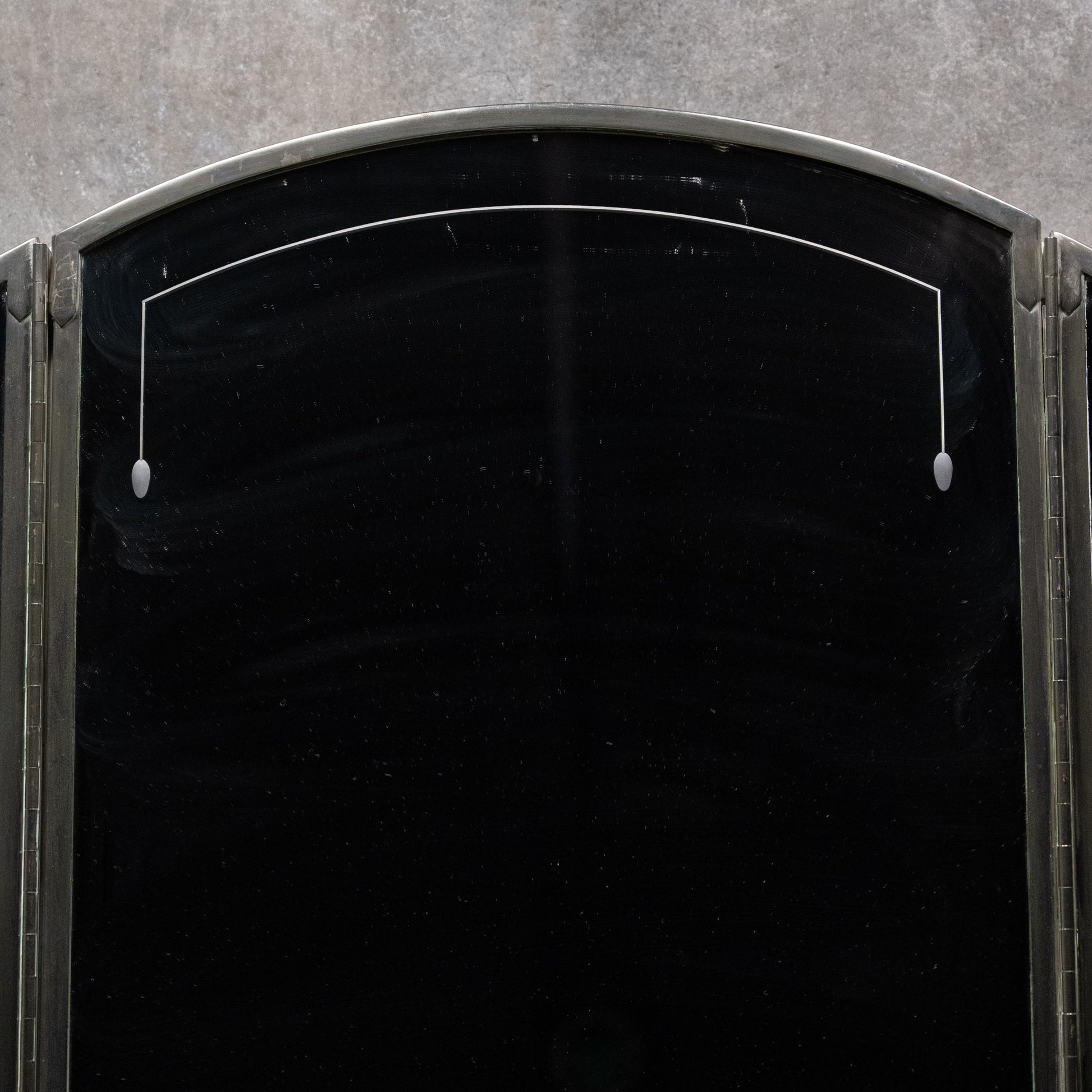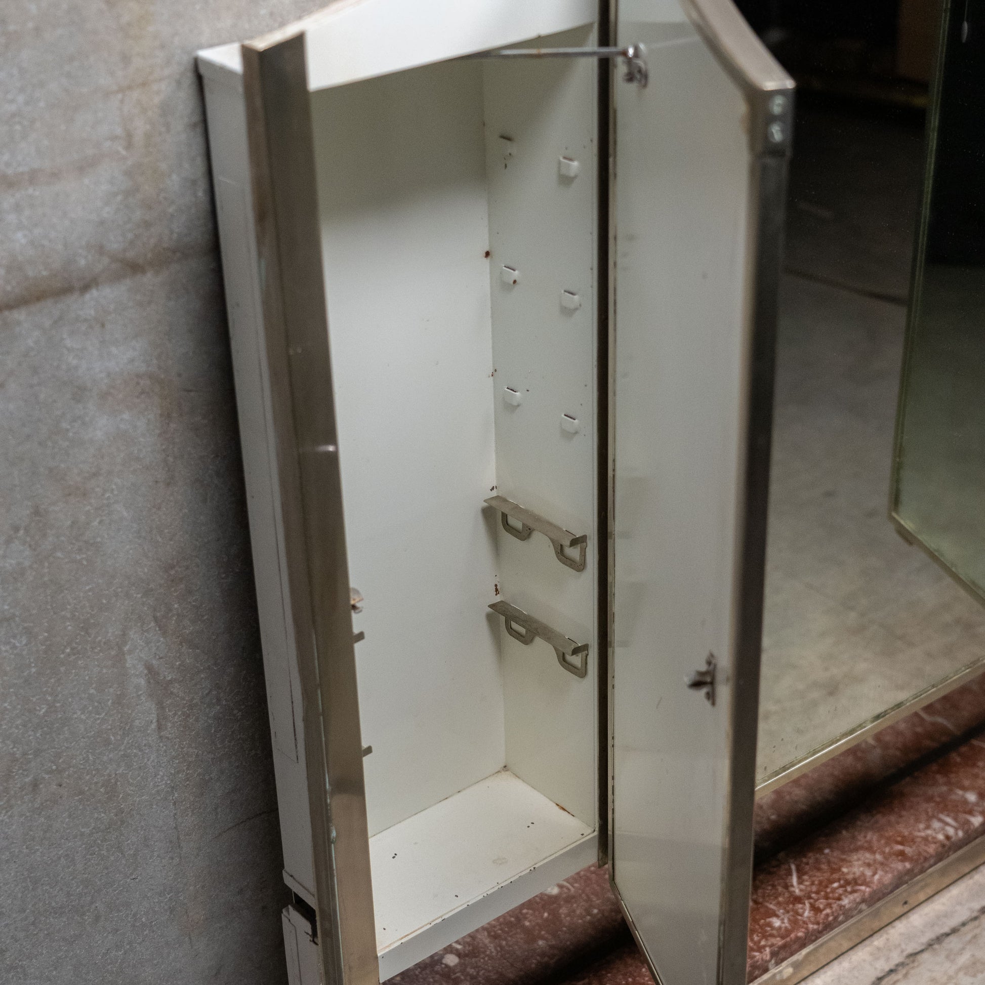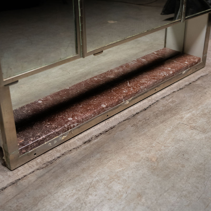 Large high-quality Art Deco style vanity cabinet from the historic Waldorf Astoria Hotel in New York City. Mirrored, three-panel cabinet with hinged doors and interior shelves, plus an open shelf below with a beautiful piece of marble on it. All made from nickel-plated brass. Could be mounted as a vanity cabinet either into or onto a wall anywhere in your home.
