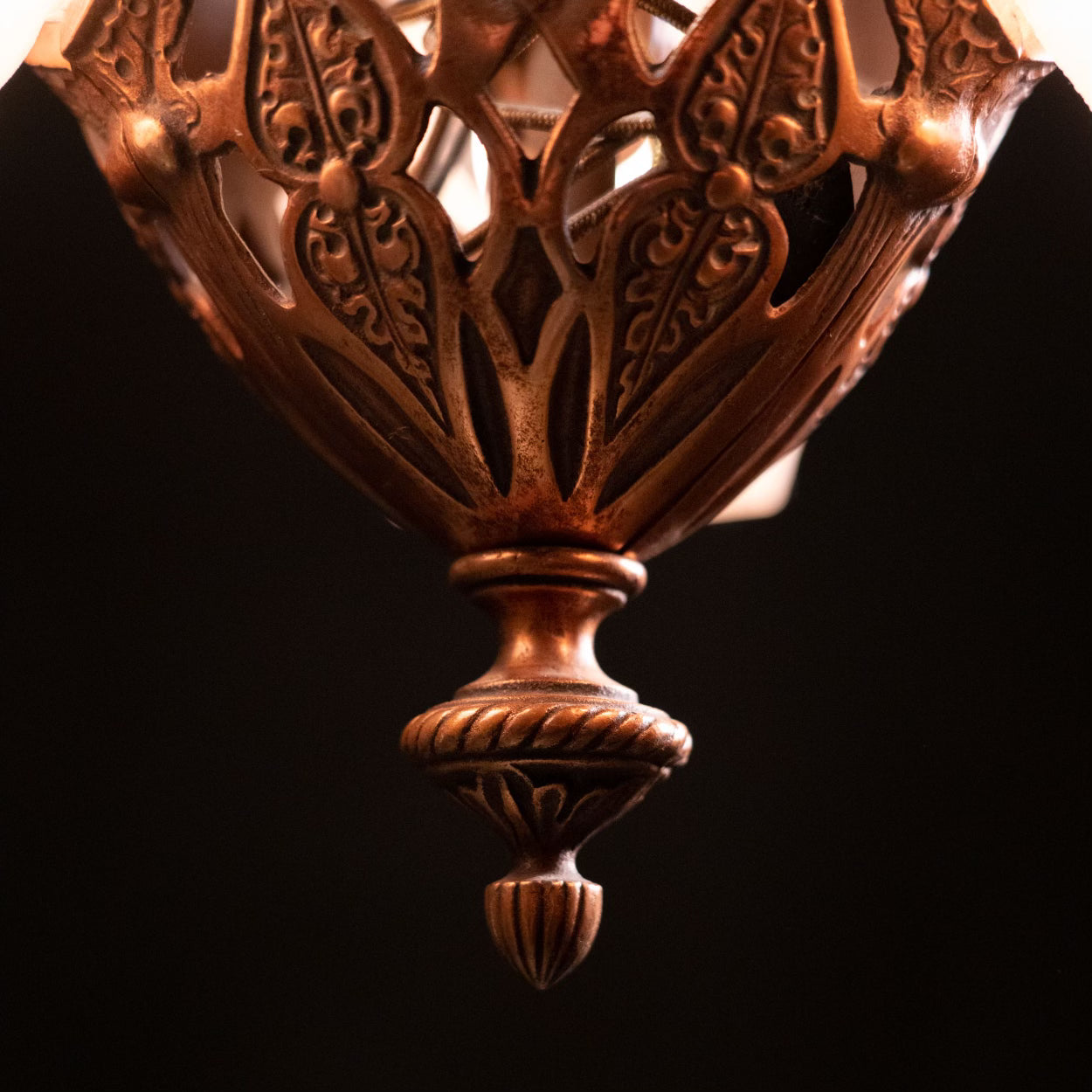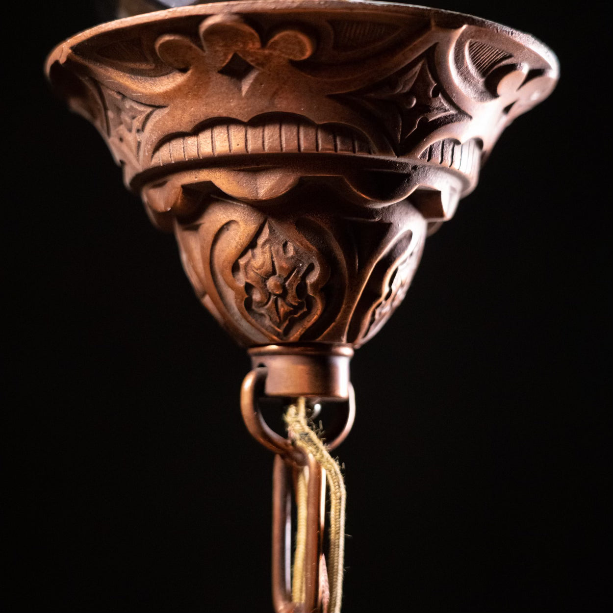 1930 Art Deco triple shade solid copper pendant by Moe Bridges Co.