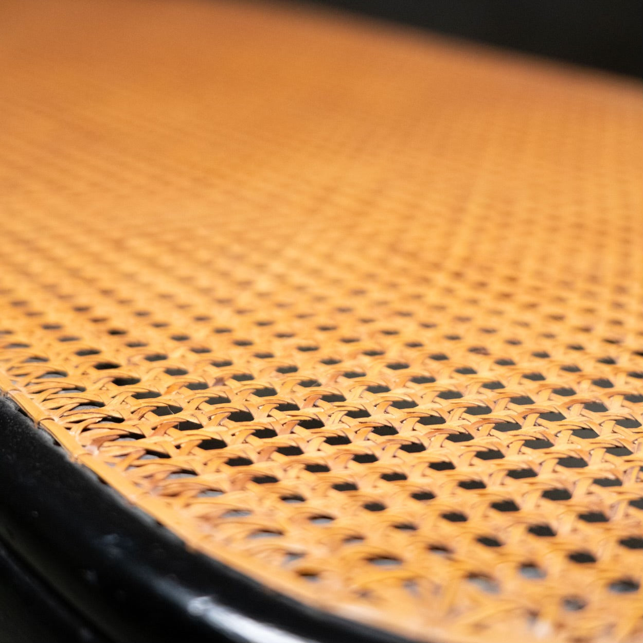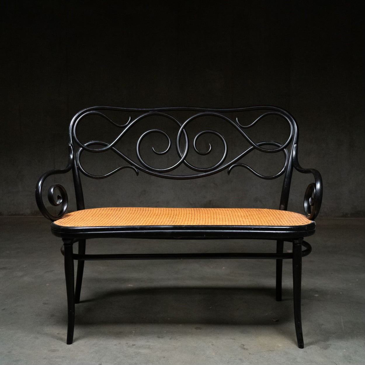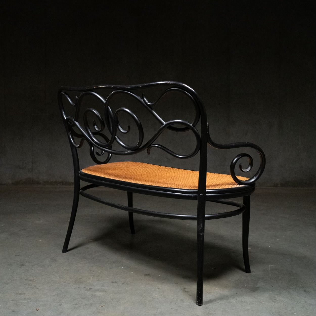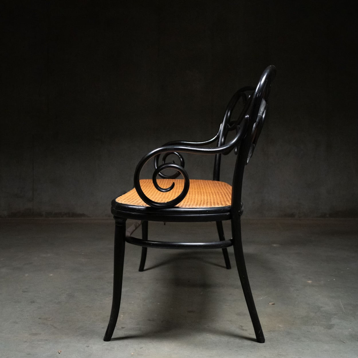 Early bentwood Art Nouveau bench or settee caned seat by Michael Thonet, Austria, Thonet bench dated circa 1915. Old black repaint in the 1960’s. Acquired from a private collection .