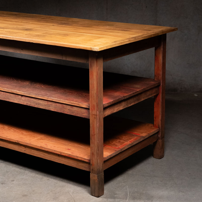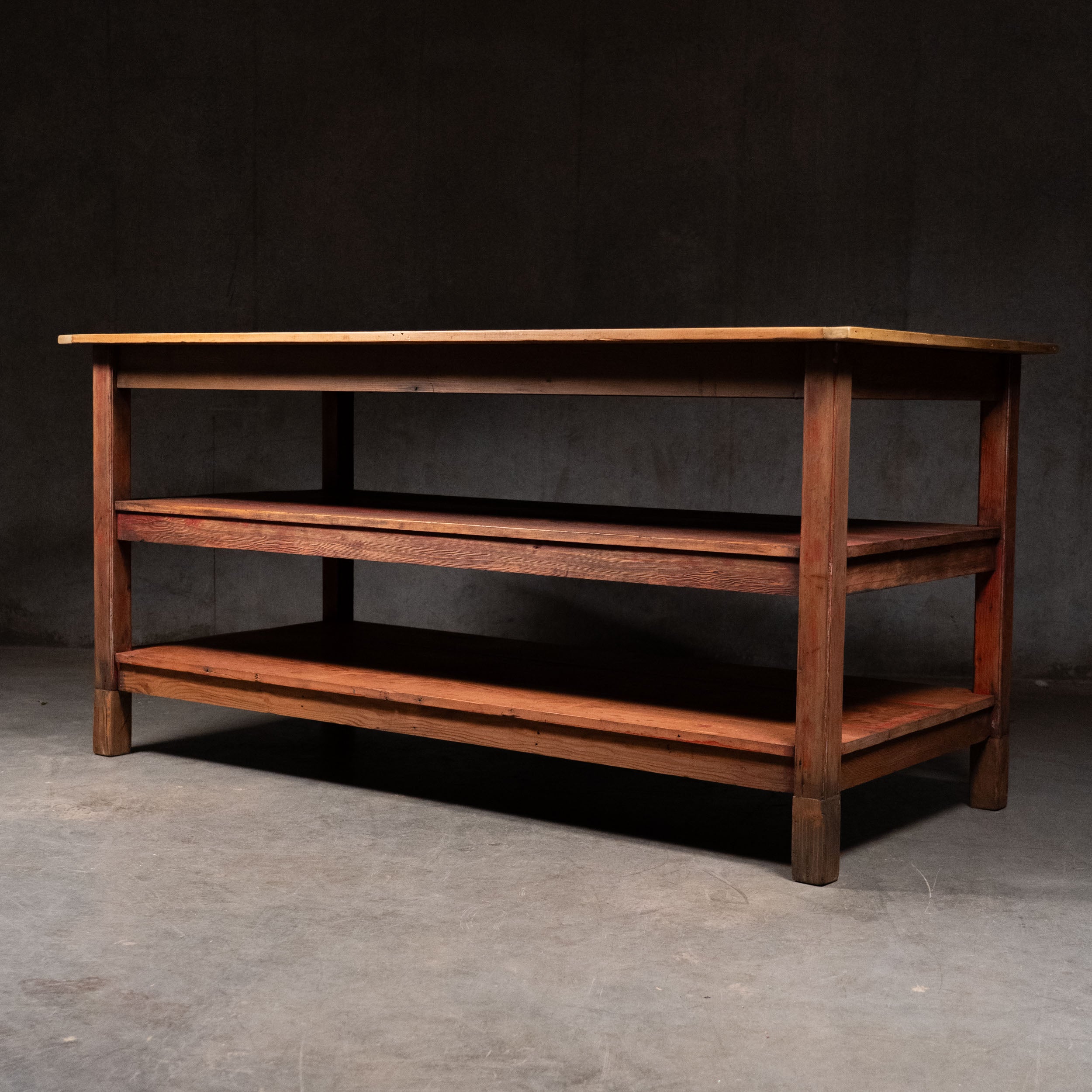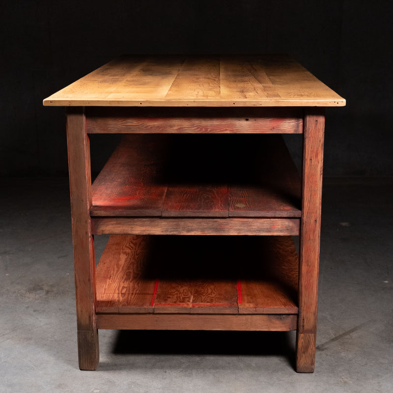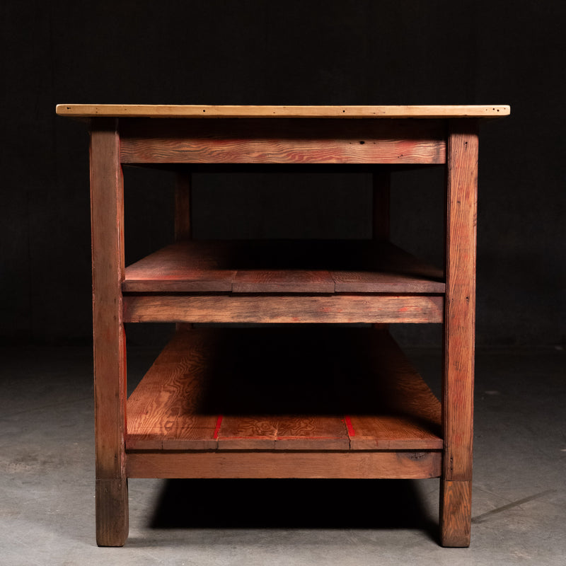 A very nice multi tiered work table salvaged from the iconic Dayton Boot Co. In Vancouver. Made of solid fir, old red finish on base with a natural scrubbed top.