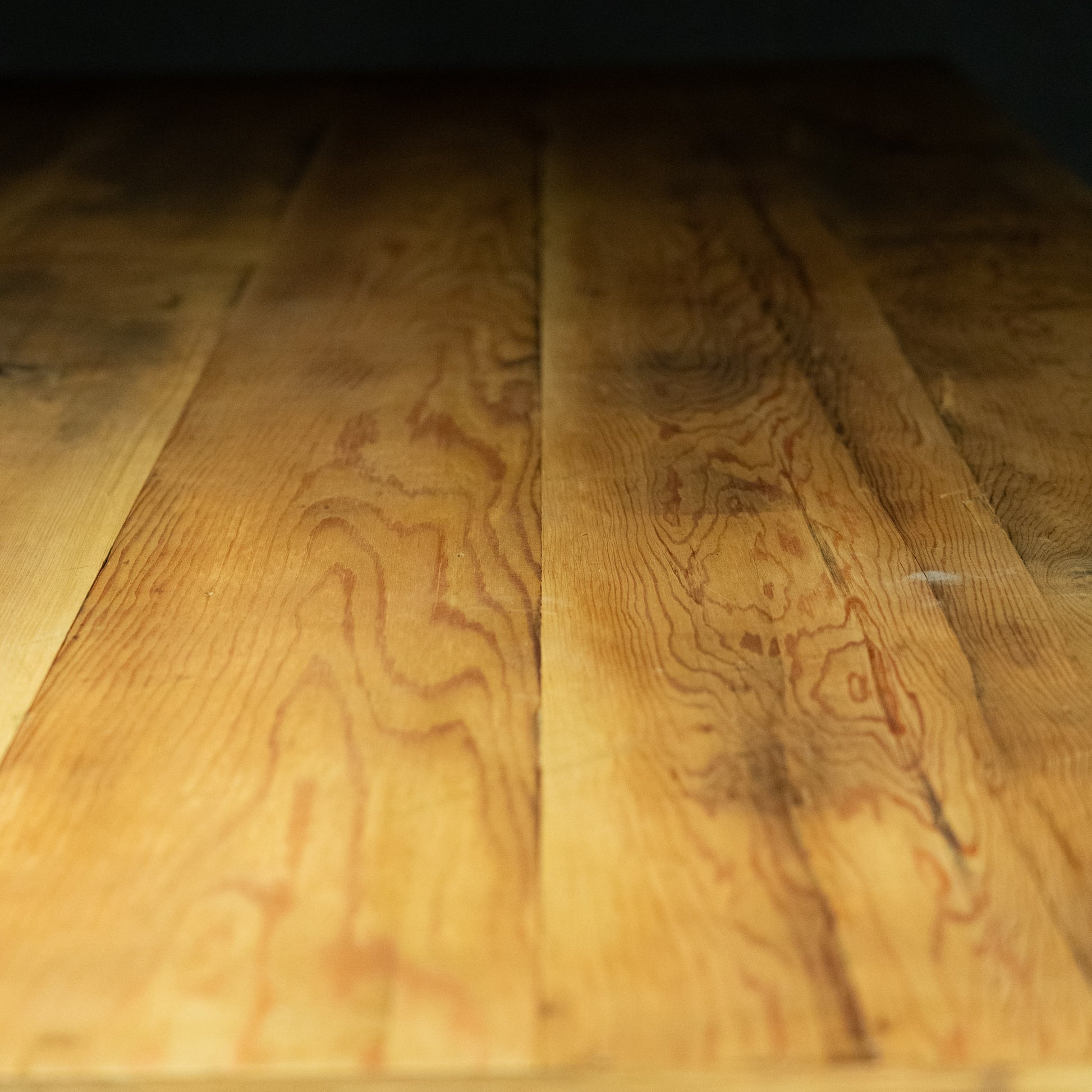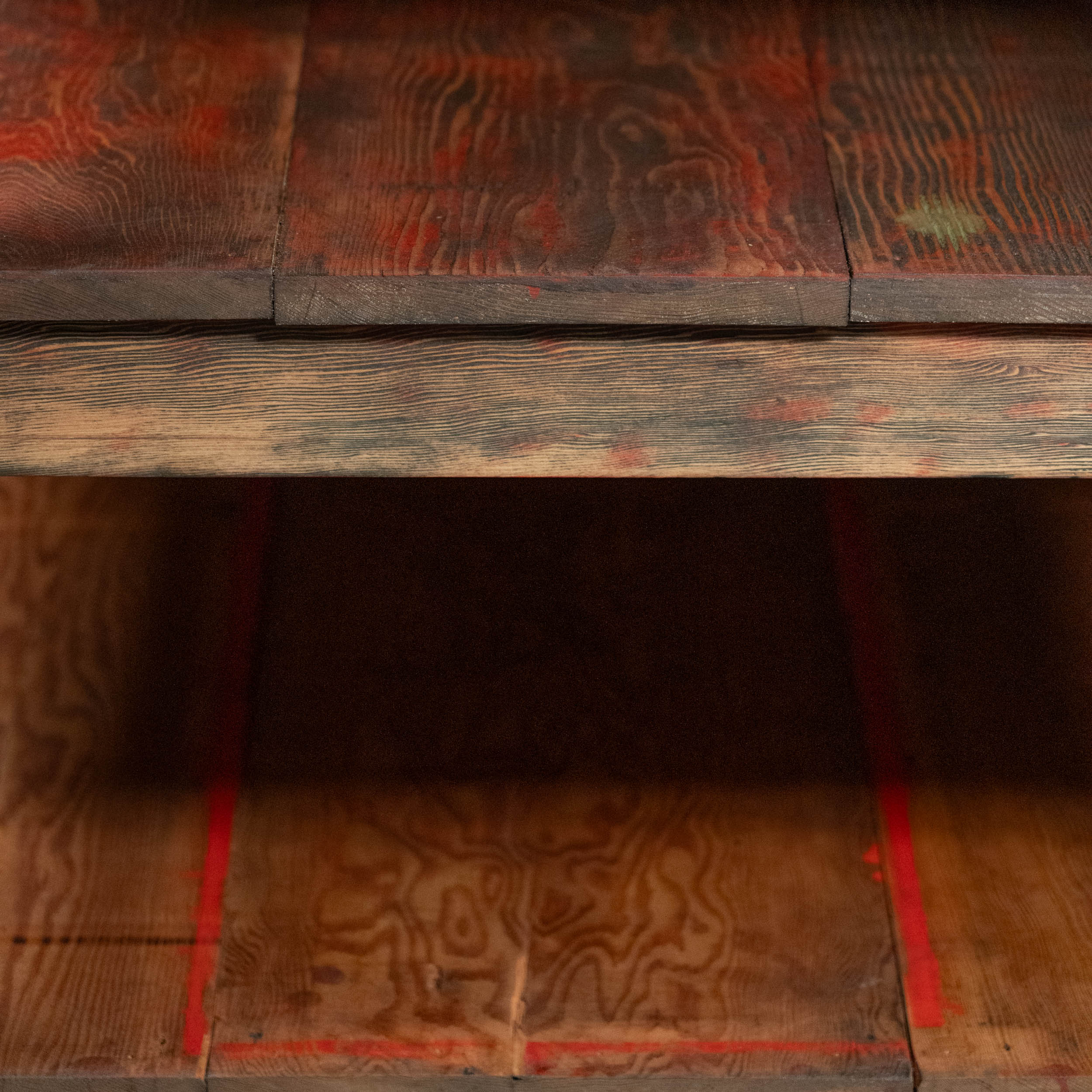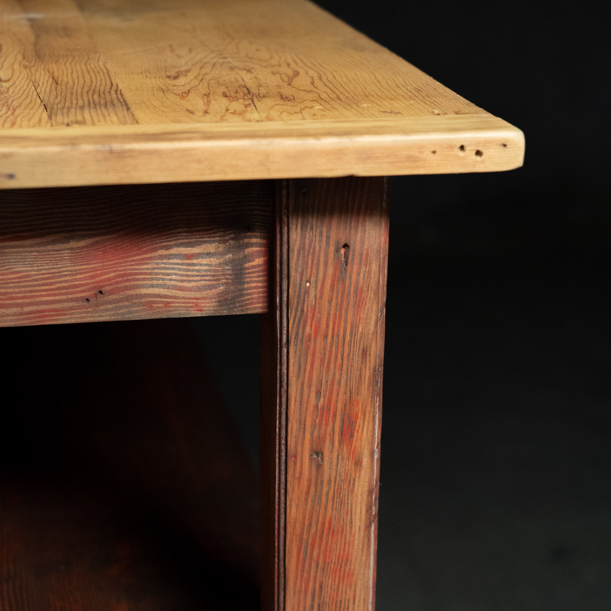 A very nice multi tiered work table salvaged from the iconic Dayton Boot Co. In Vancouver. Made of solid fir, old red finish on base with a natural scrubbed top.