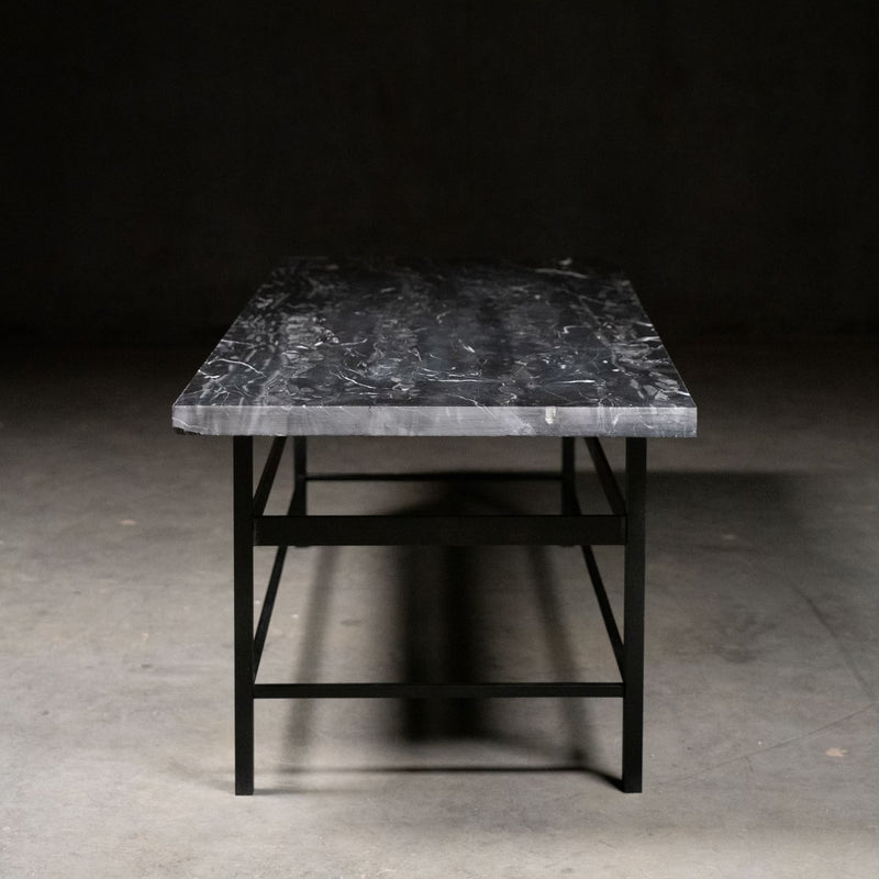 Reclaimed stone in 5/4 thickness in rare black veined marble , honed on a custom steel base .. Made in. -house.