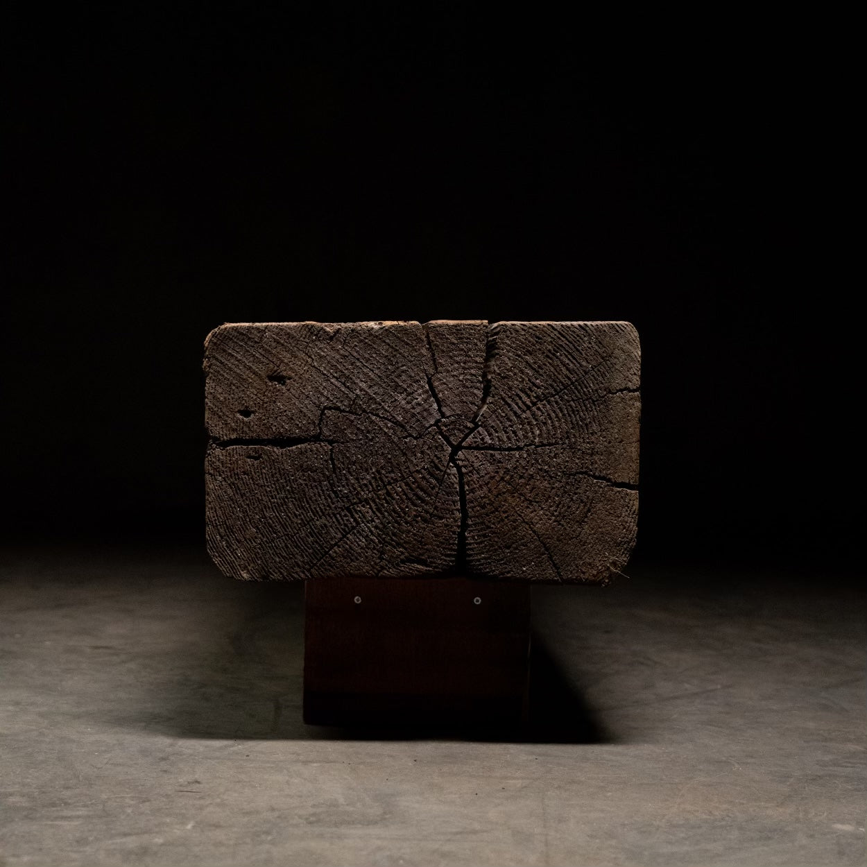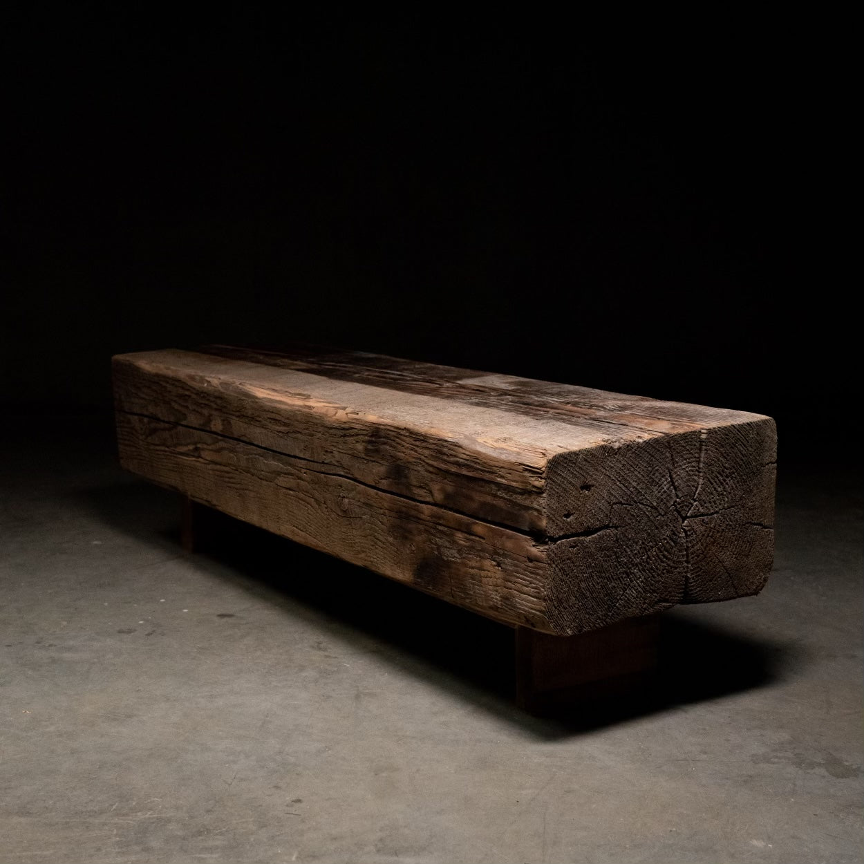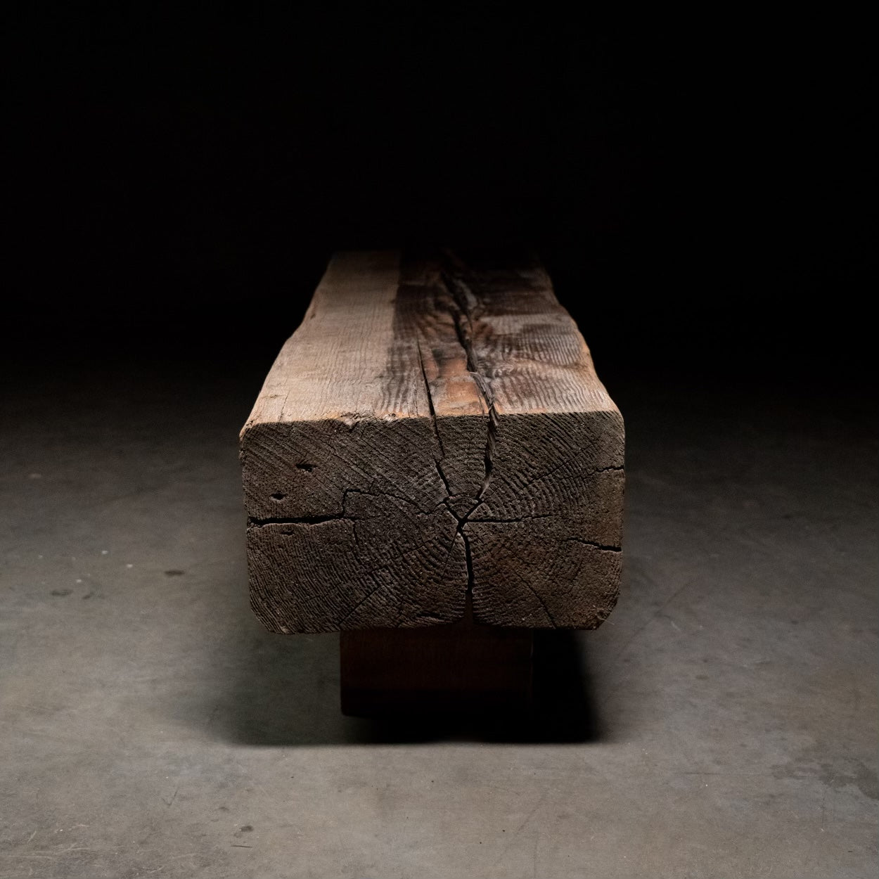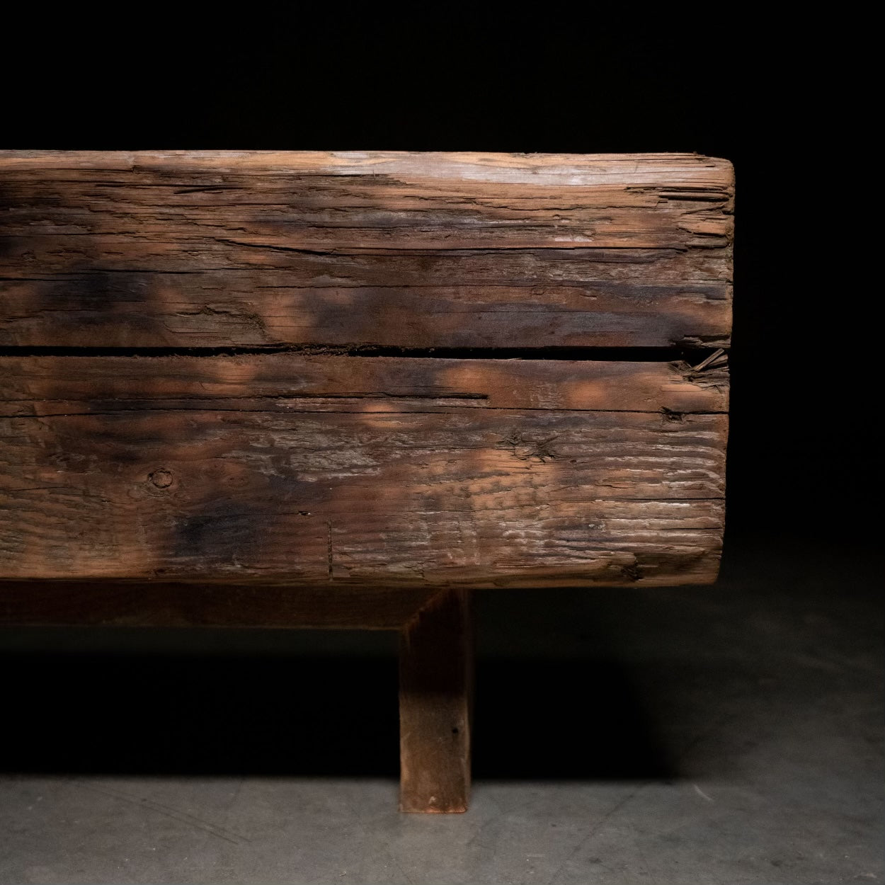 In house salvage and design , simple but effective reclaimed wood coffee table using a salvaged oversized beam , custom reclaimed wood stand in a natural 120 year old dry patina .. We have a few pieces left for custom sizes.