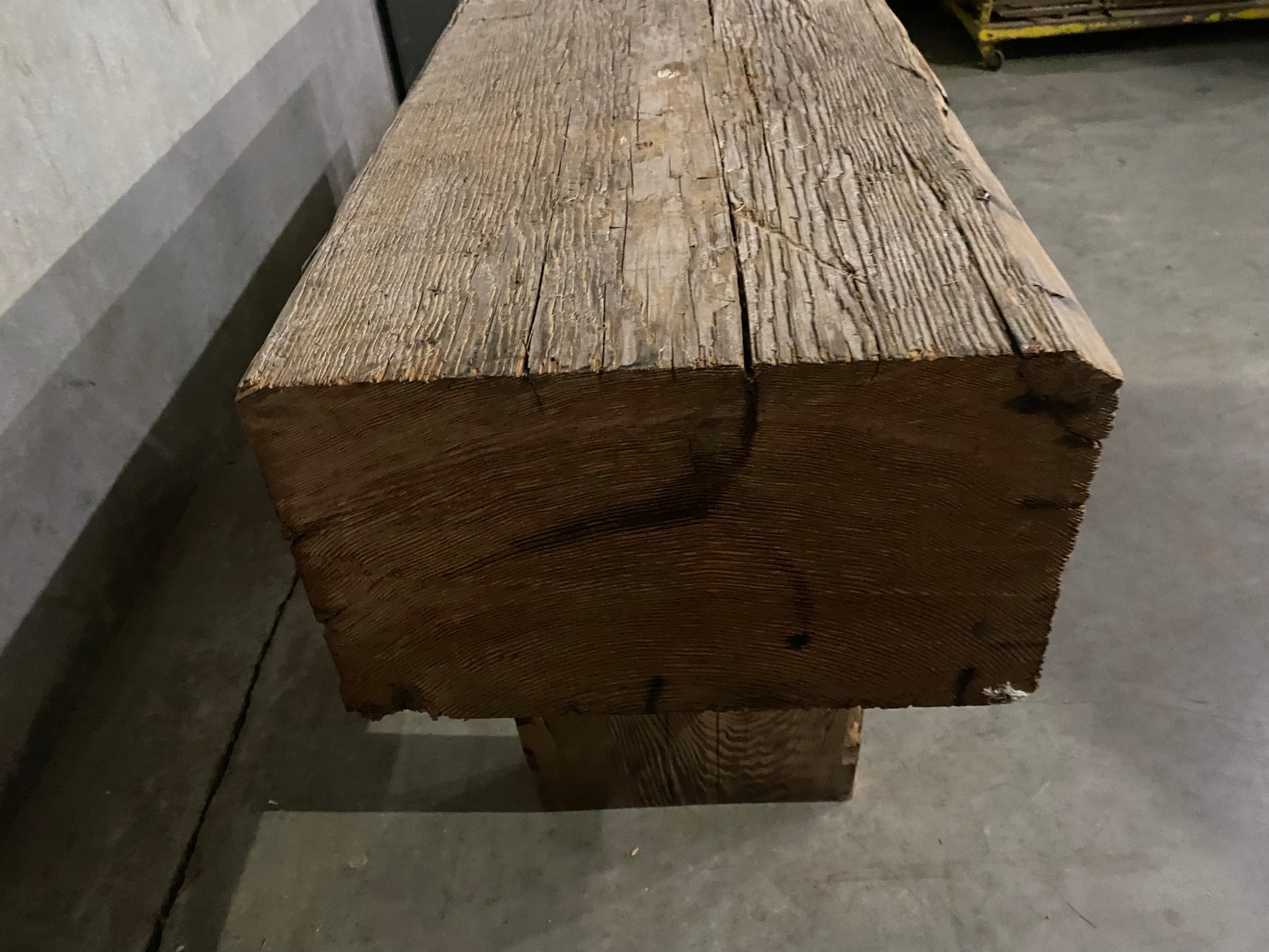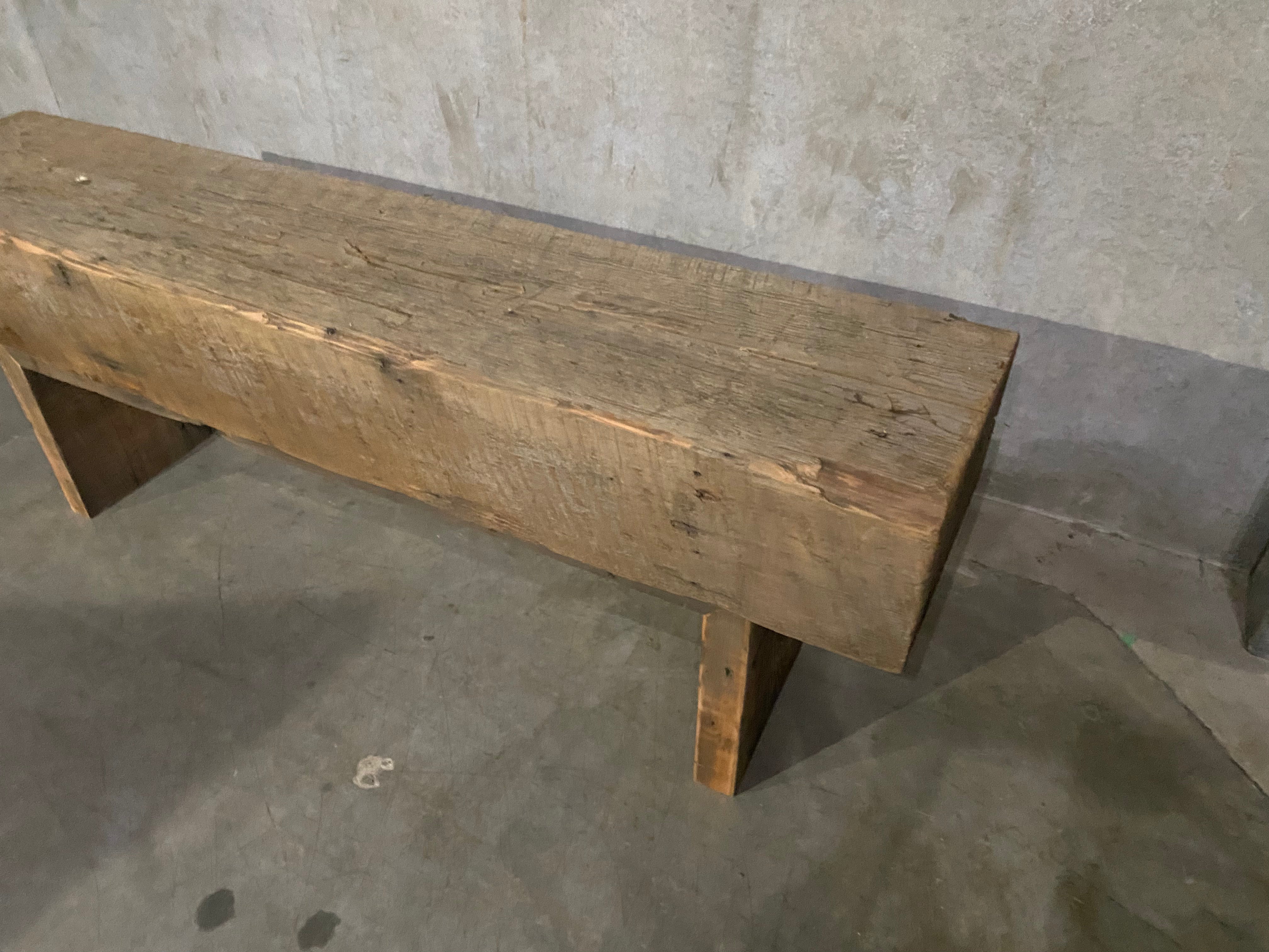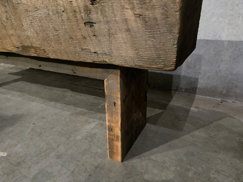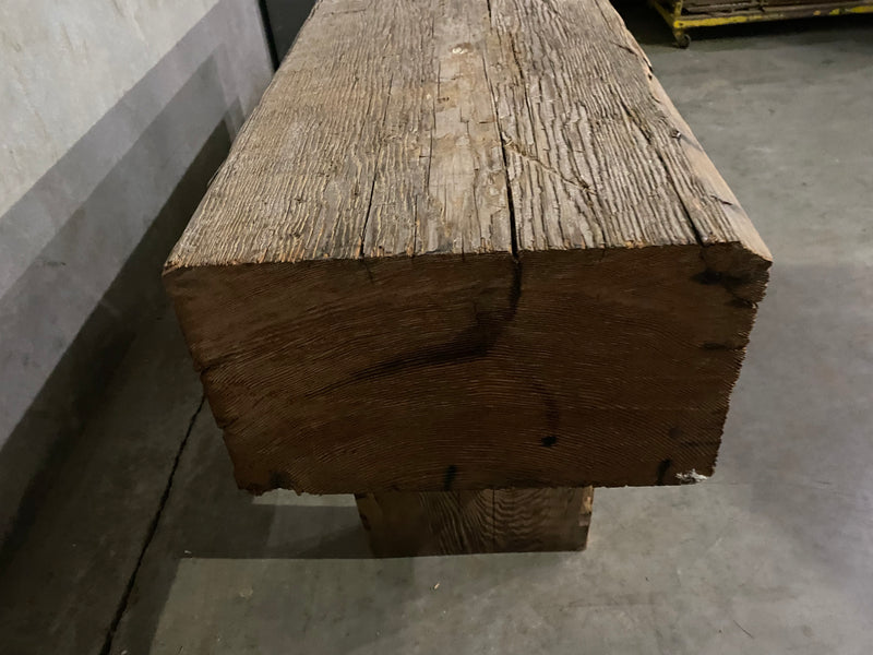 A bespoke sofa table with a fantastic beam custom made with c 1900 reclaimed wood, salvaged in Gastown . One of a kind . Fabricated in house .